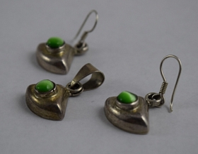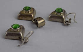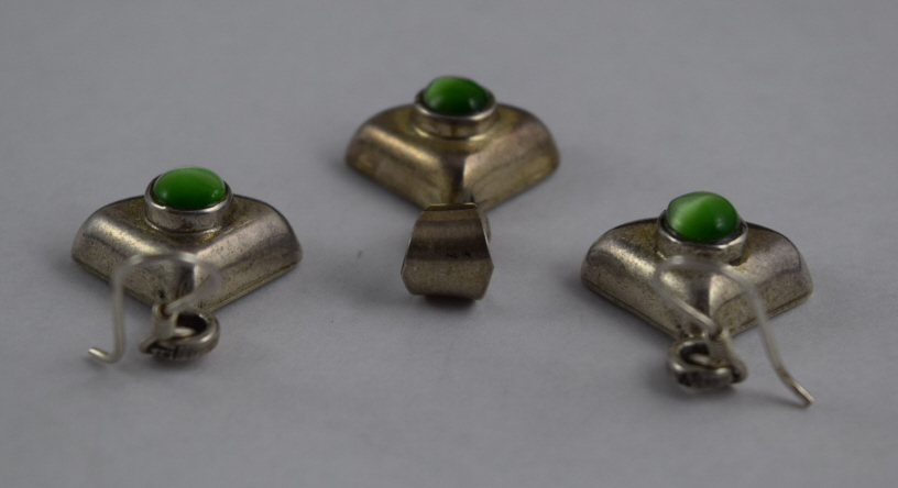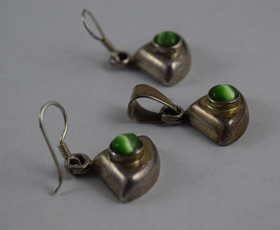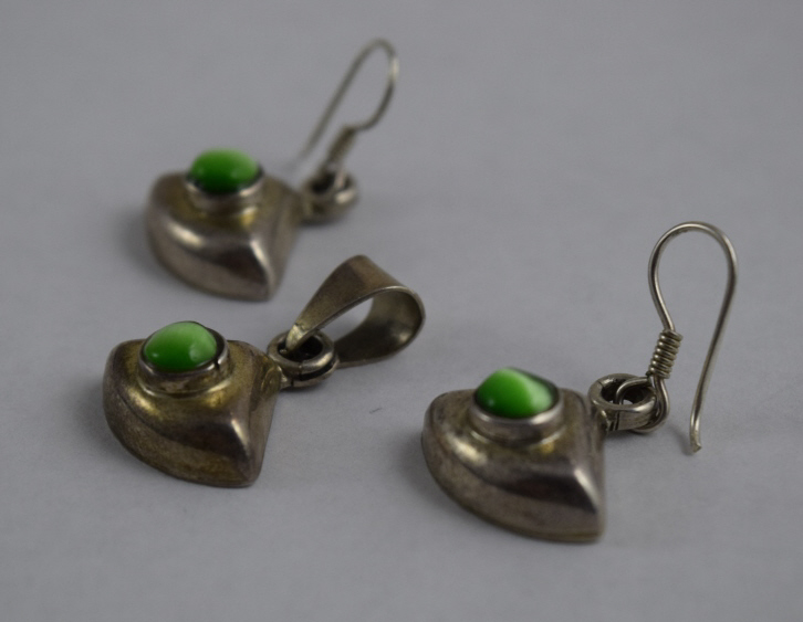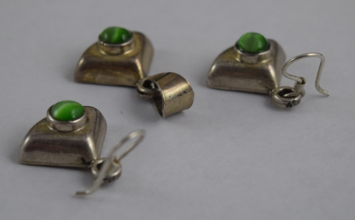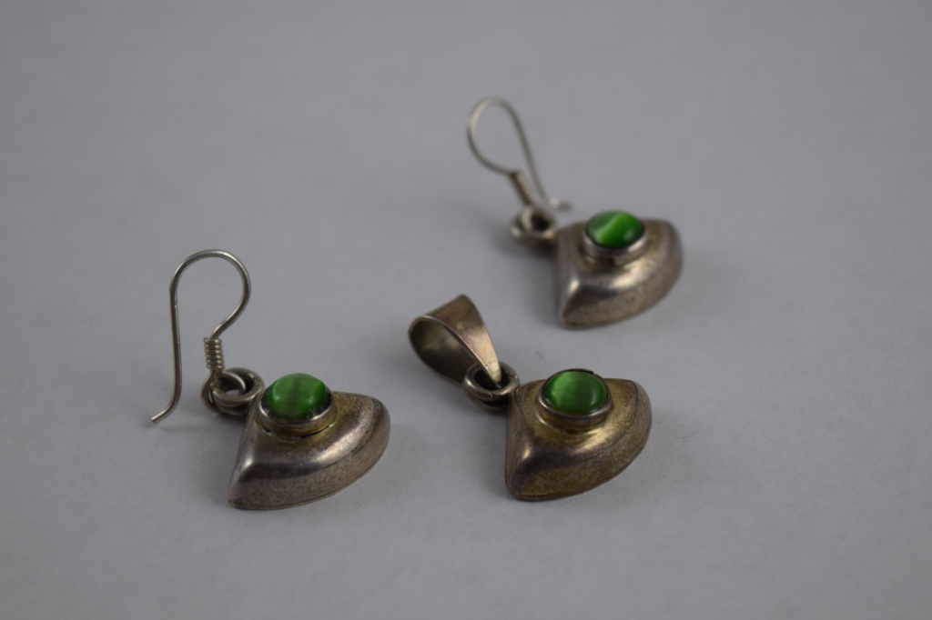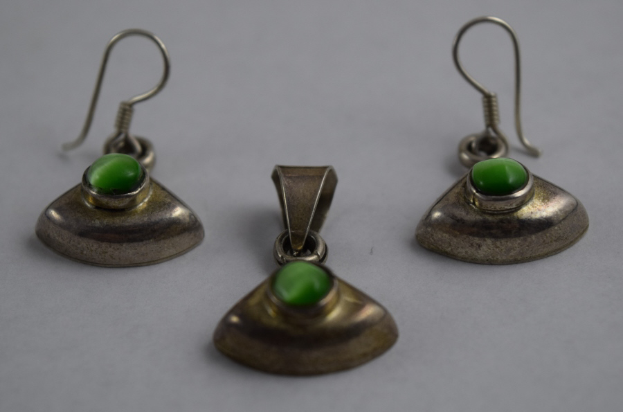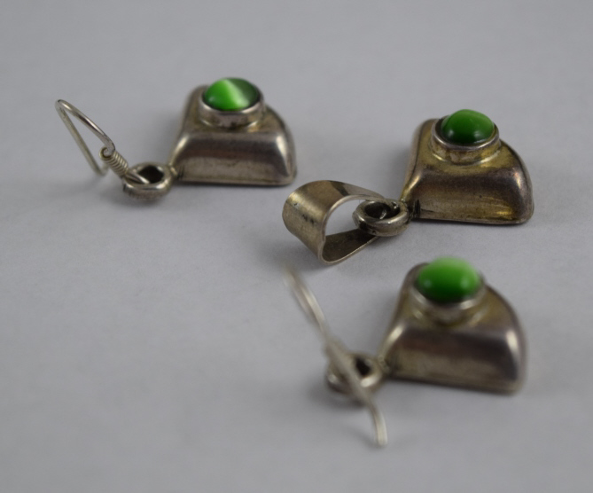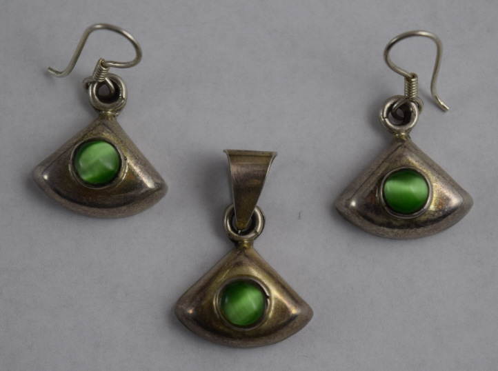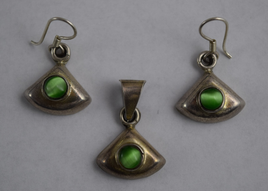414 - TAXCO MEXICO STERLING GREEN CATS EYE JEWELRY SUITE