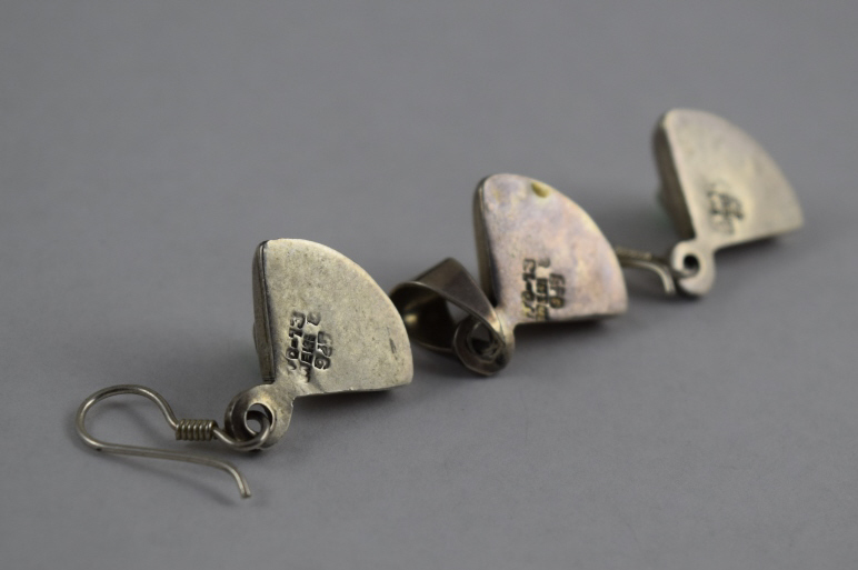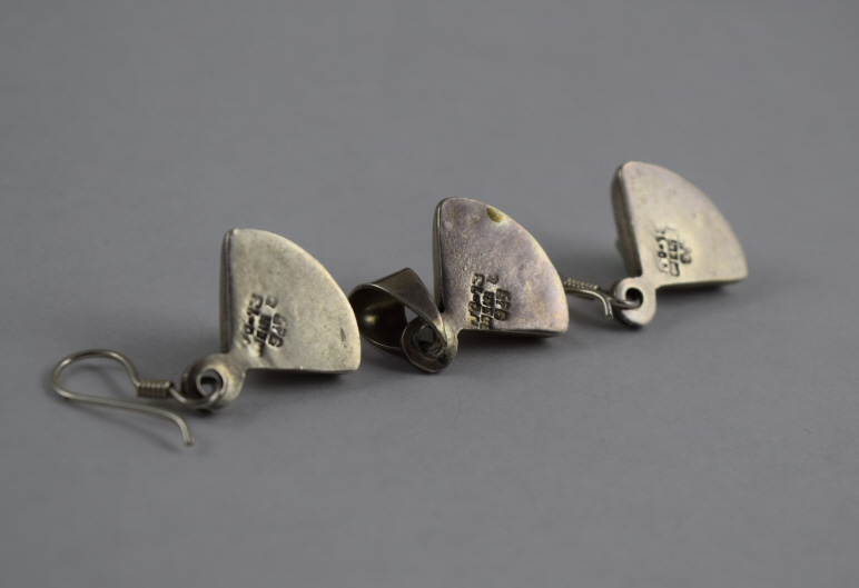 Includes pair of earrings and matching pendant. Hallmarked "TO-73", "925", and "MEXICO". Each measure 3/4" (1.9cm) long x 3/4" (1.9cm) wide, without bail/earring hooks. Weighs 15.6g.