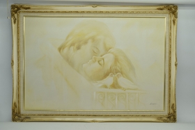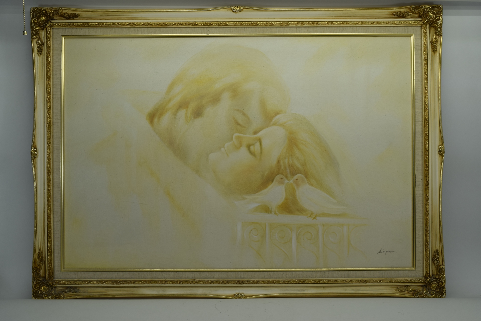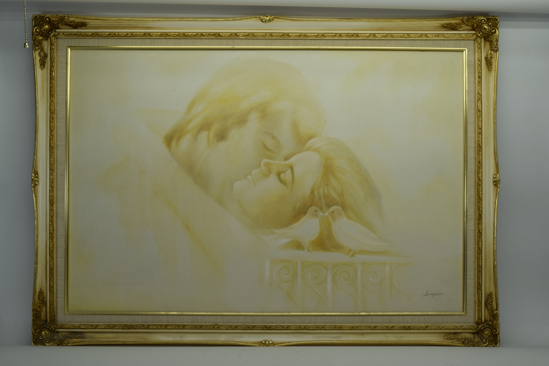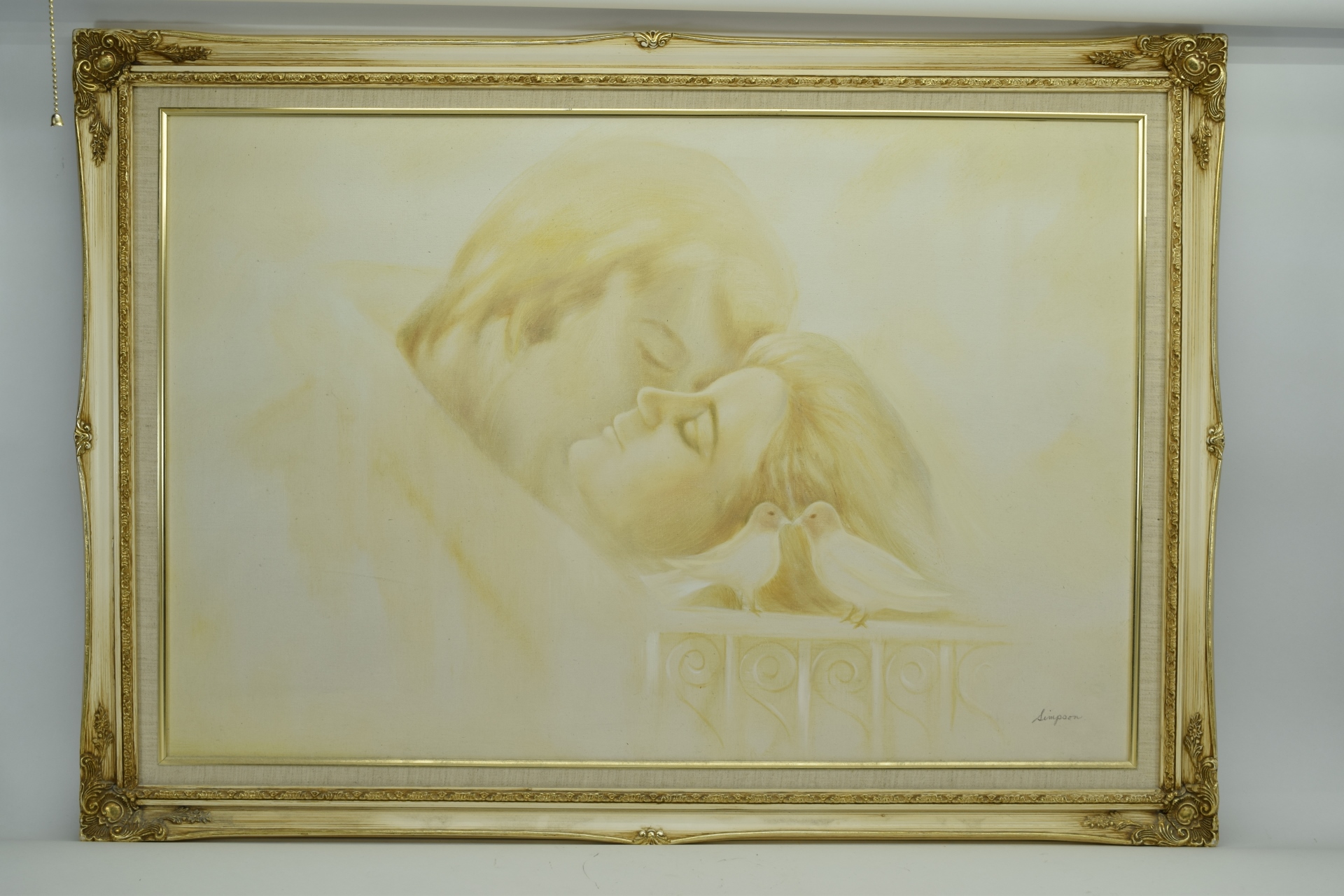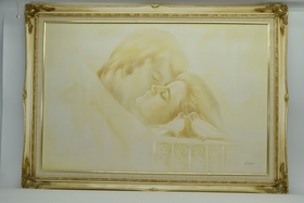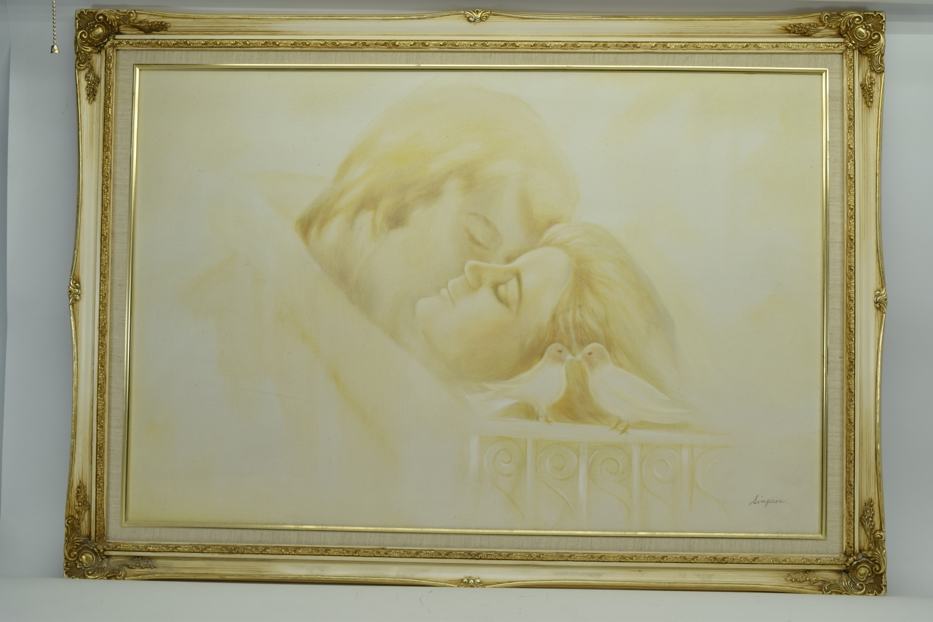 Depicting a couple's warm embrace with two birds. Measures 29-1/2” H x 41-1/2” W overall.