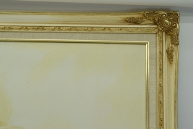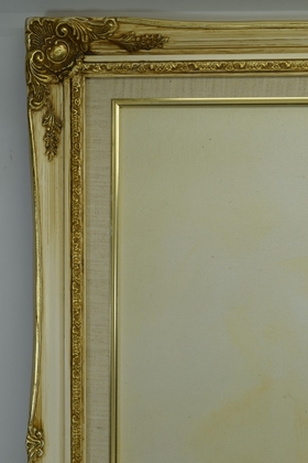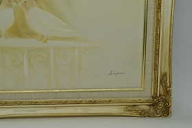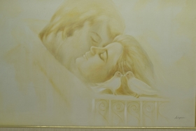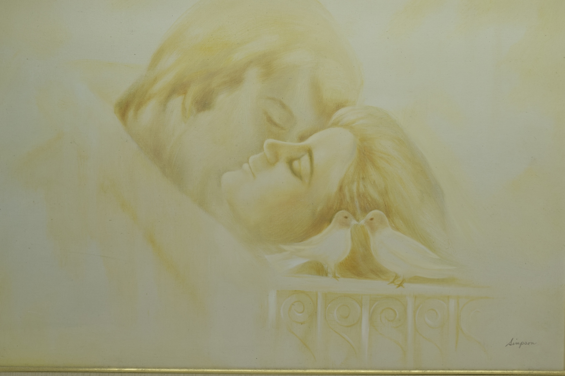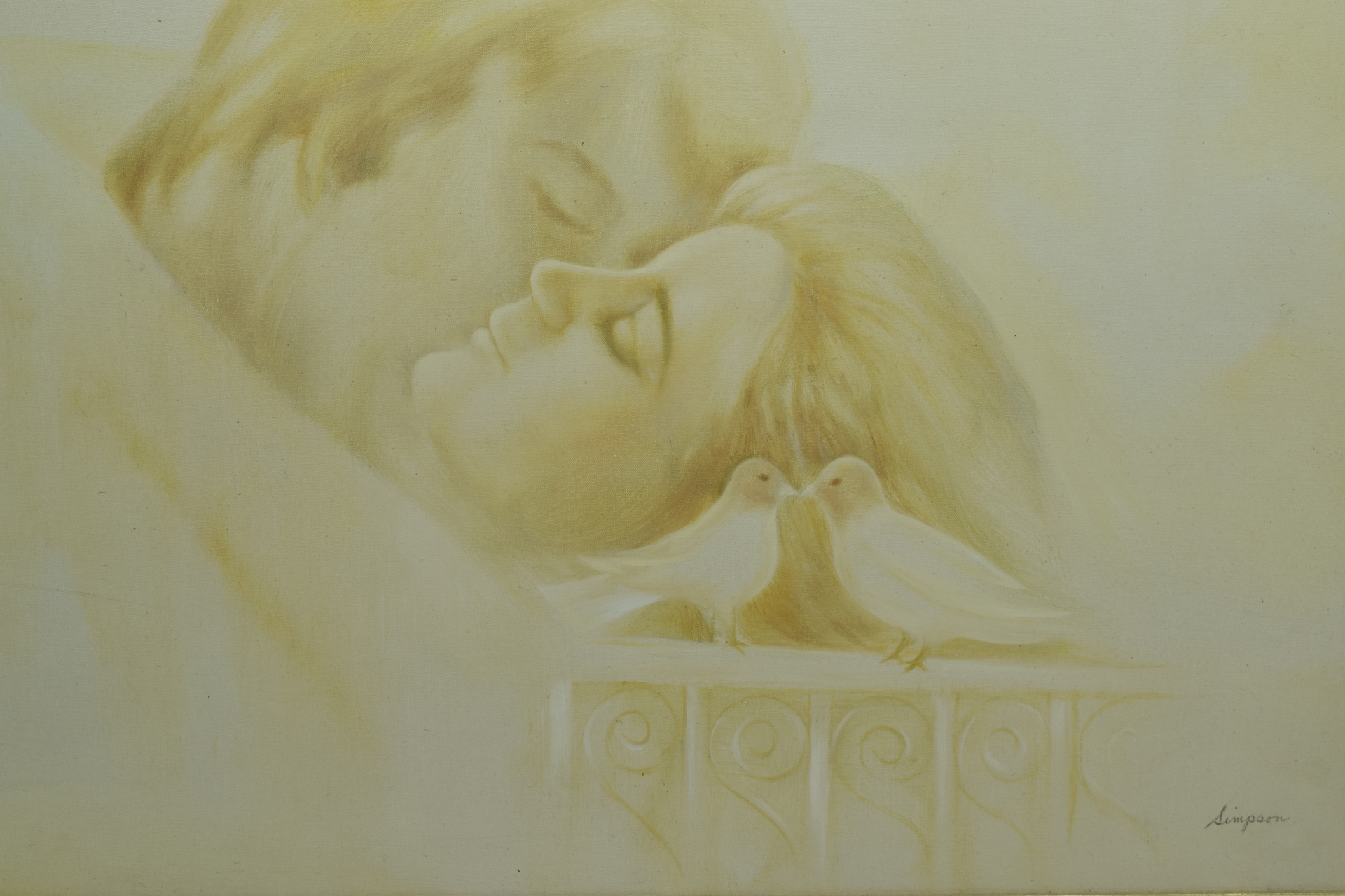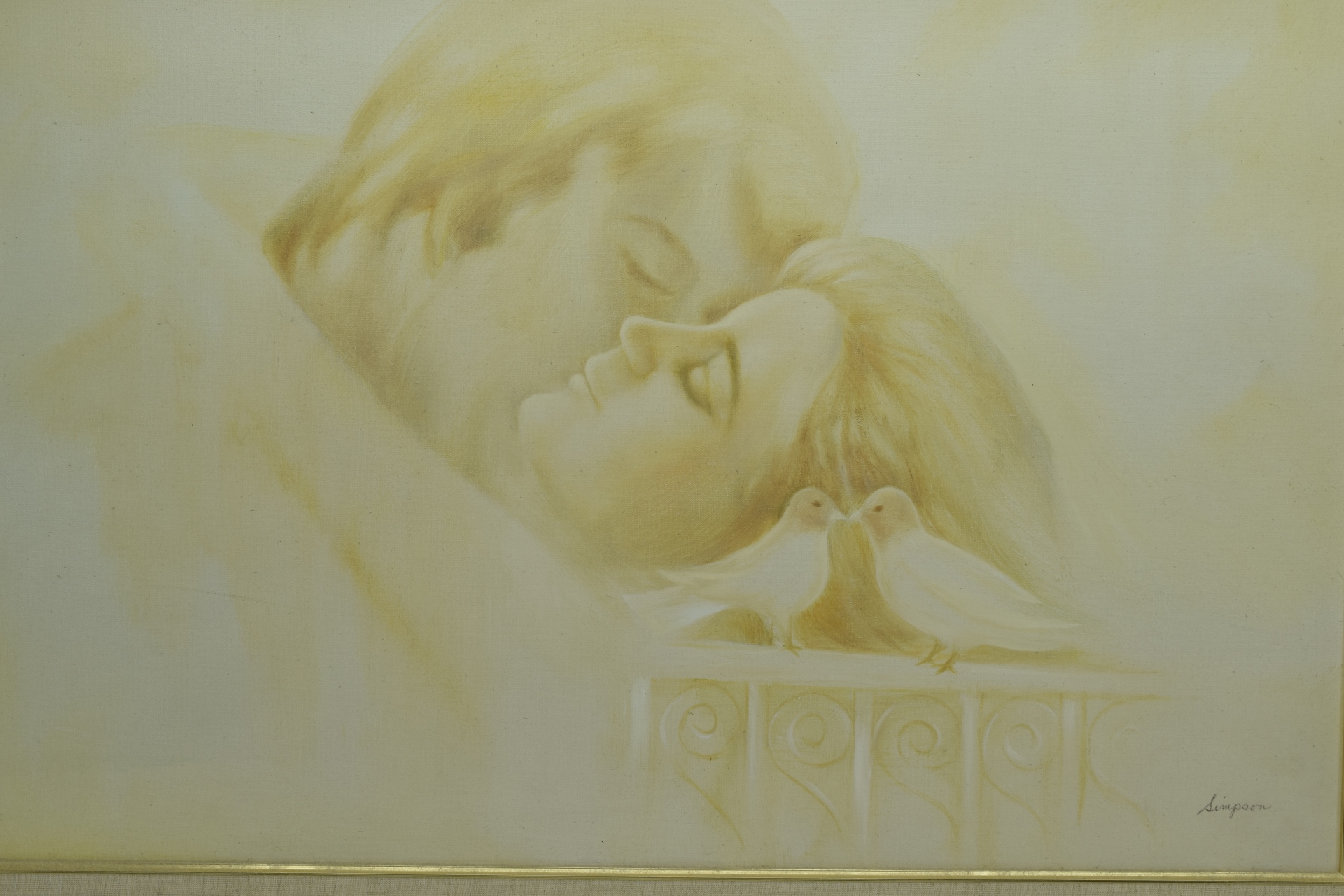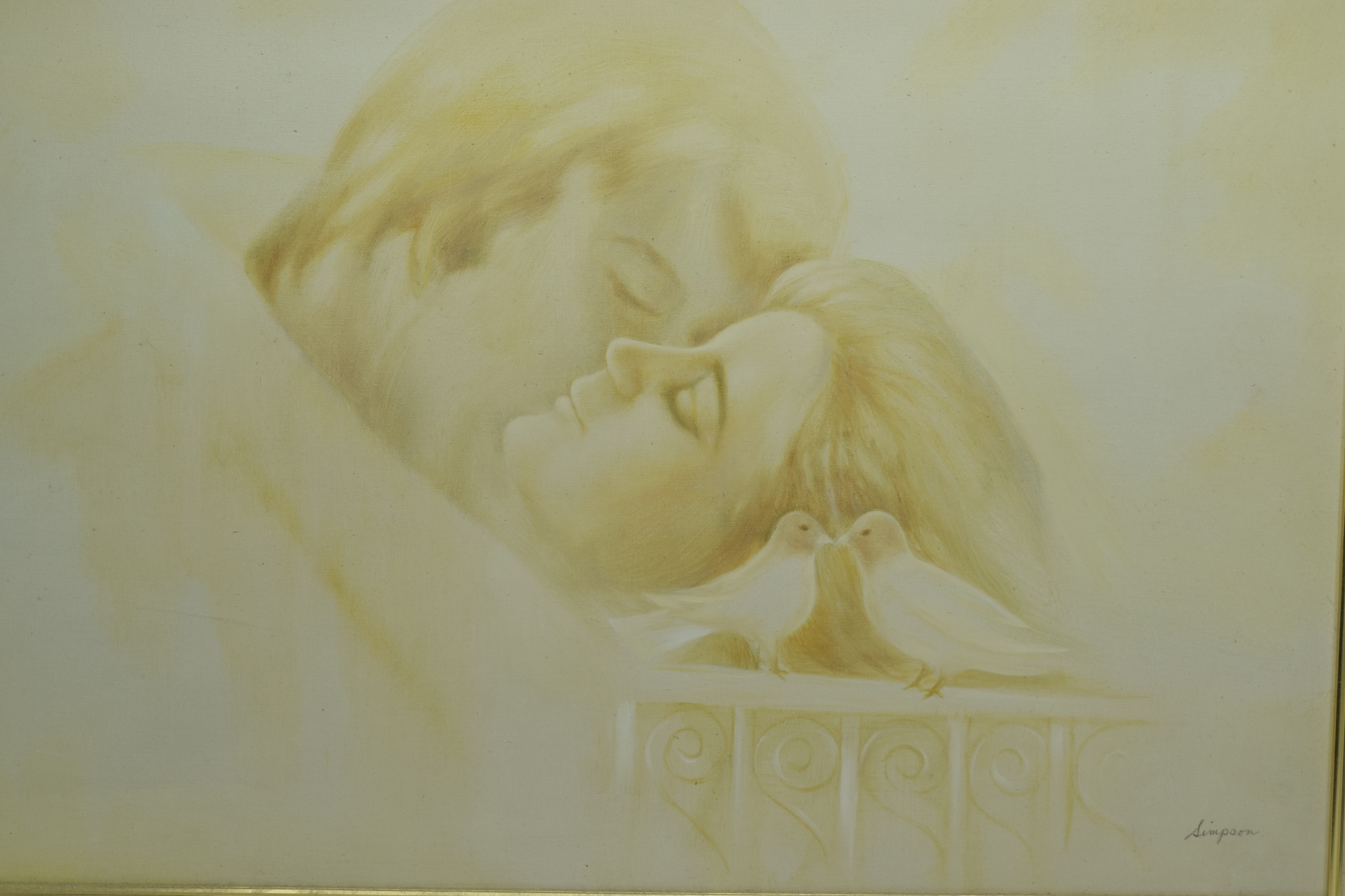 Depicting a couple's warm embrace with two birds. Measures 29-1/2” H x 41-1/2” W overall.