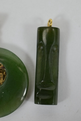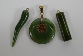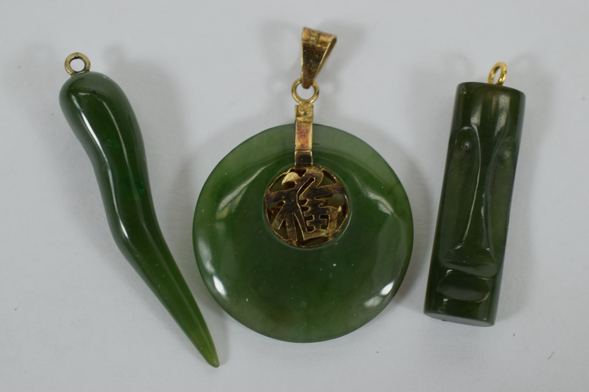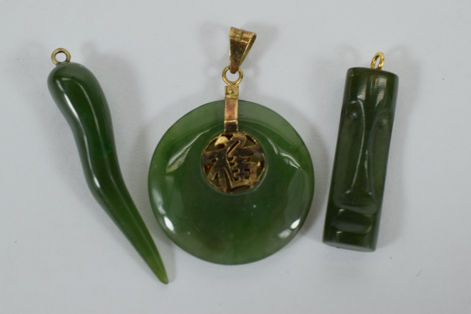 1 Tiki Face, 1 Chinese Gold Mounted Good Luck Circular Pendant, 1 Italian Horn. 19th/20th C. Measures 1-3/8” L (horn) pendant approx. 1” diameter. Weighs 9g total.