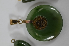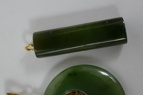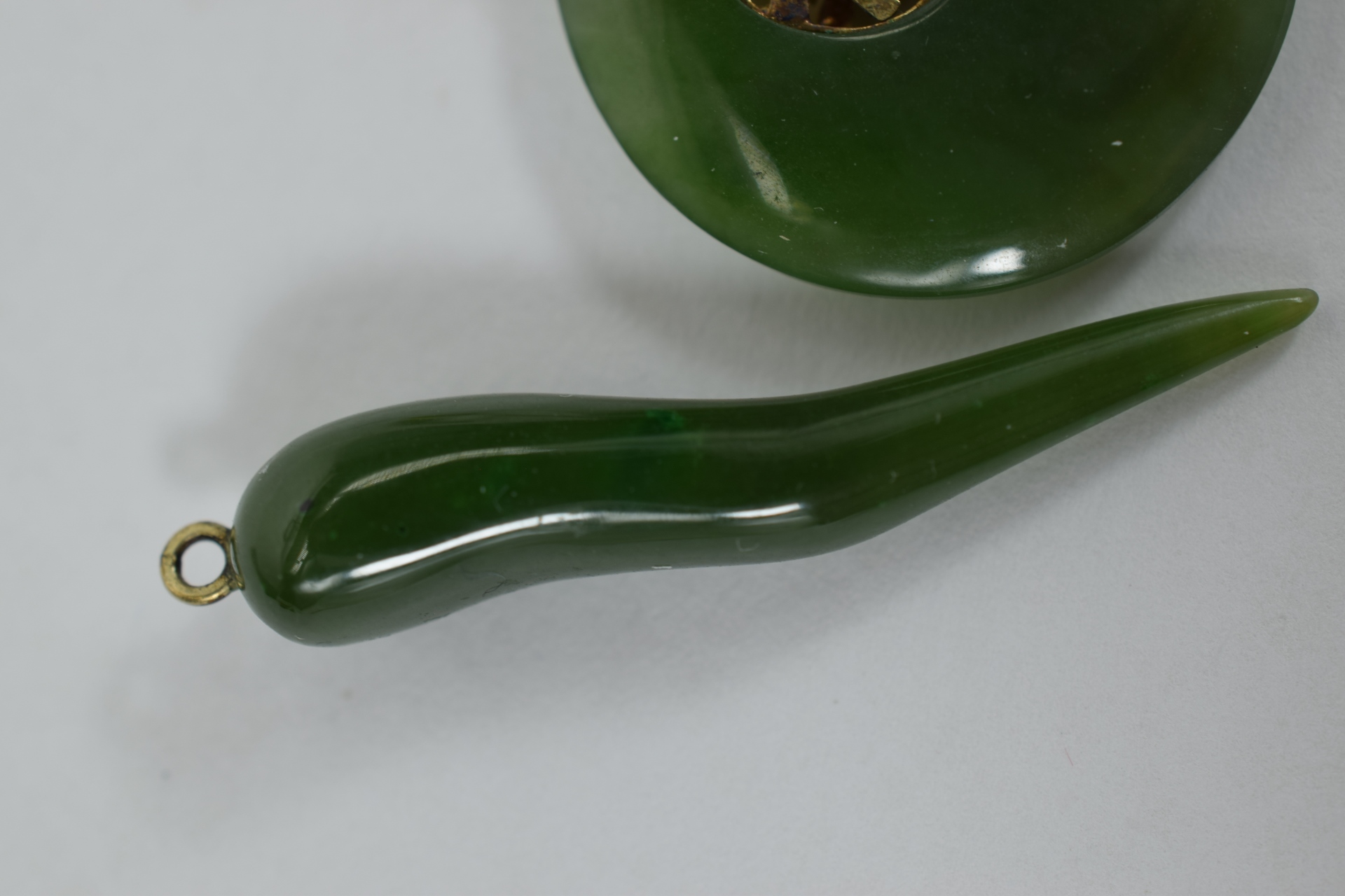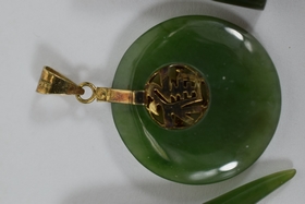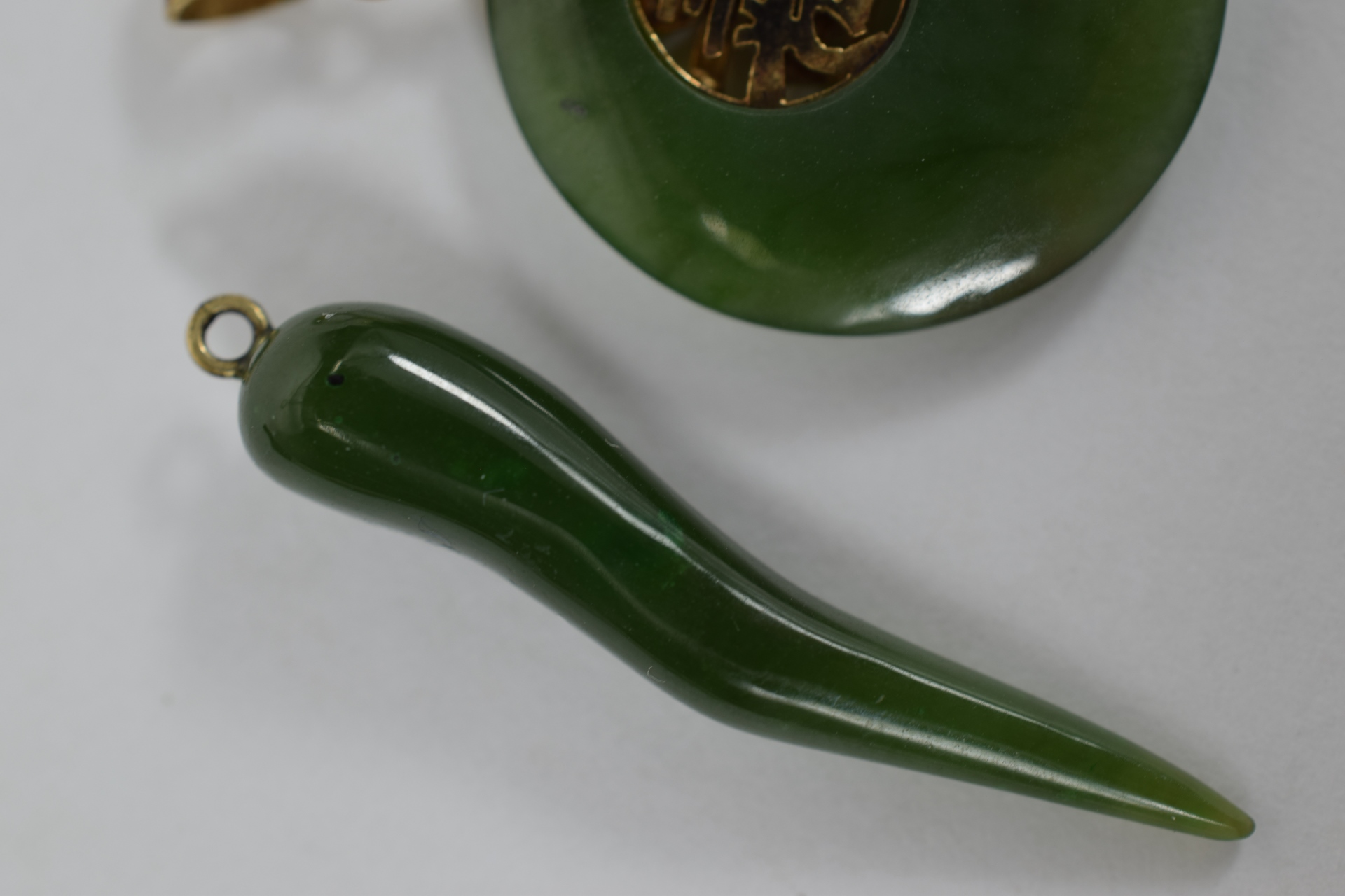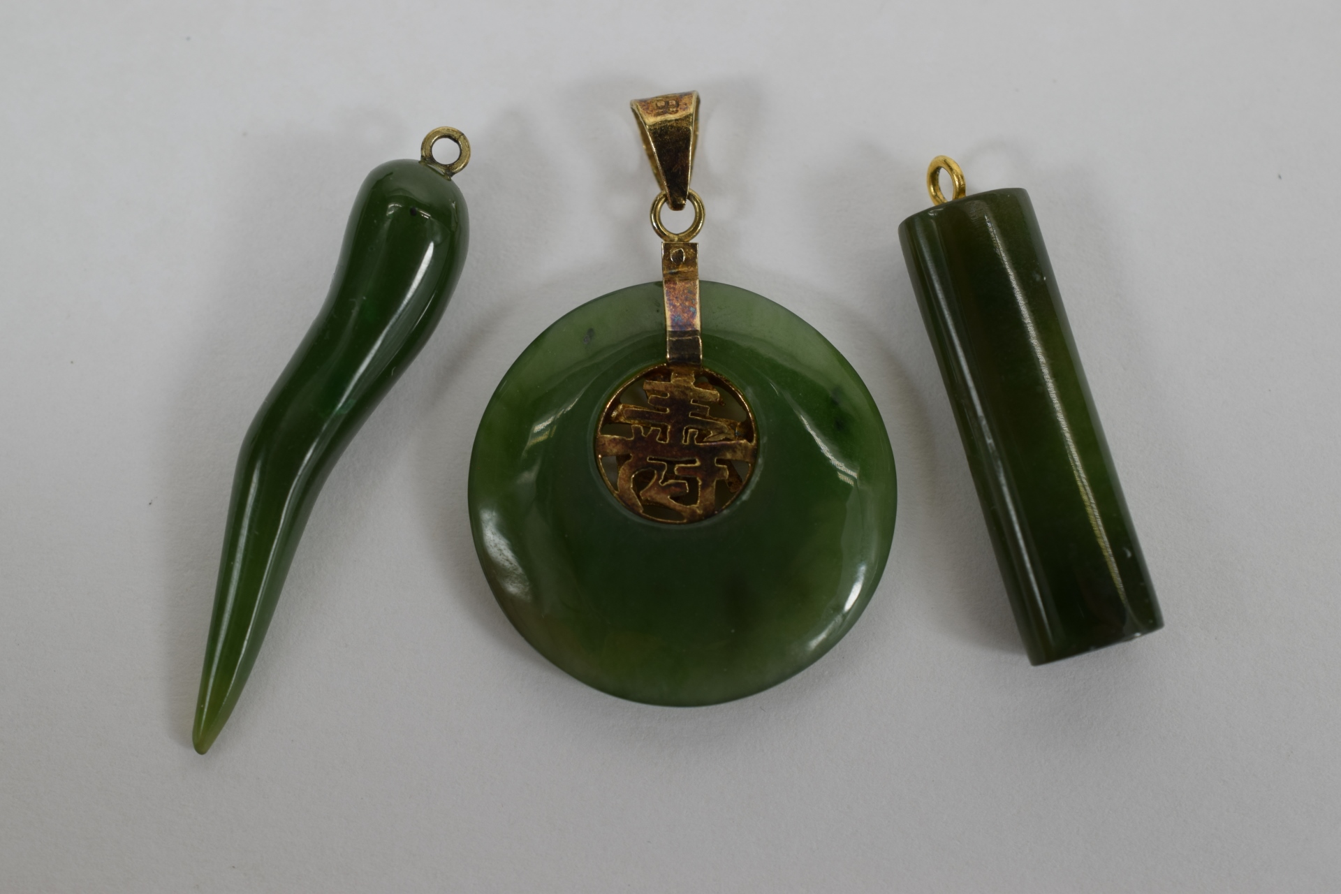 1 Tiki Face, 1 Chinese Gold Mounted Good Luck Circular Pendant, 1 Italian Horn. 19th/20th C. Measures 1-3/8” L (horn) pendant approx. 1” diameter. Weighs 9g total.