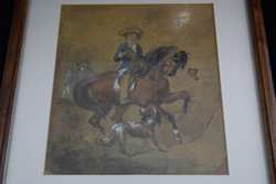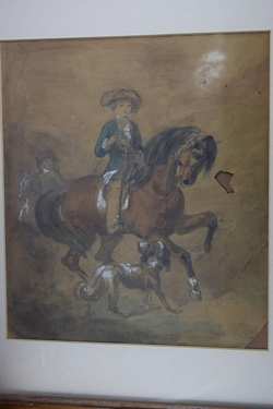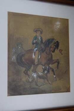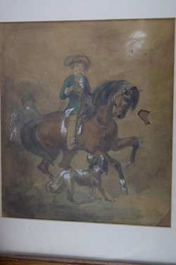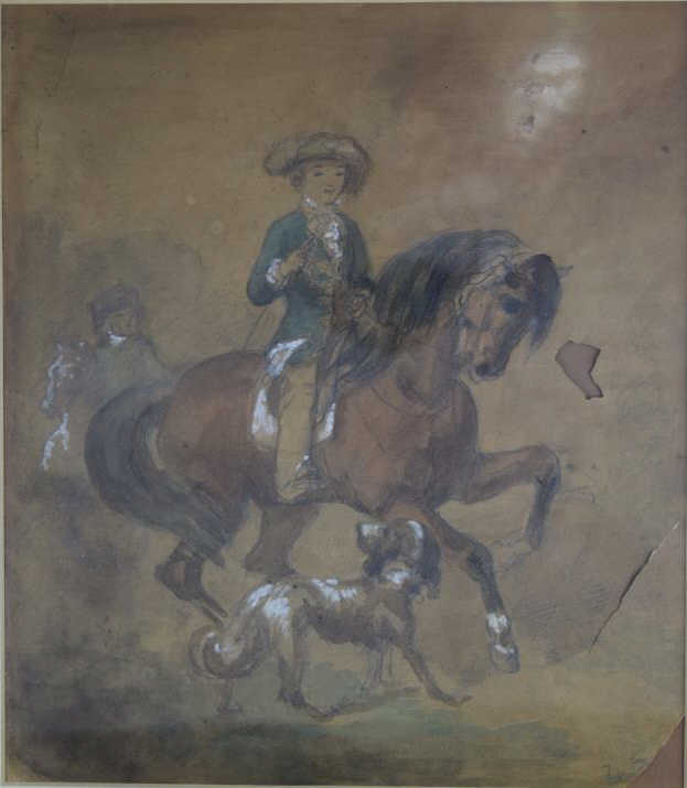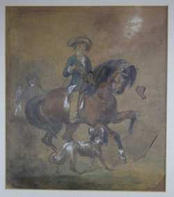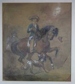 Beautiful equestrian piece depicts horses, riders, and dog. Perhaps a hunting scene. Pencil and watercolor heightened with white. Perhaps a sketch for an oil painting. Old, brittle paper with loss. Viewable areameasures 9 1/2" (24.1cm) high x 8 1/4" (20.9cm) wide. Frame measures 14 1/2" (36.8) high x 13.5" (34.3cm). Weighs 3lbs., 2oz. THIRD PARTY SHIPPING REQUIRED
