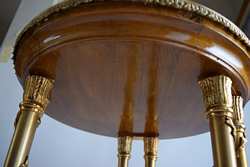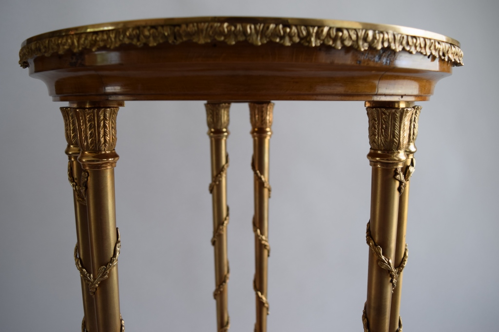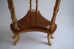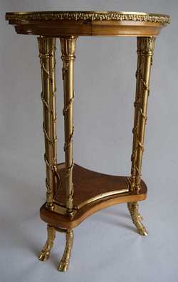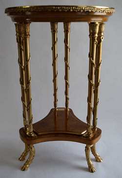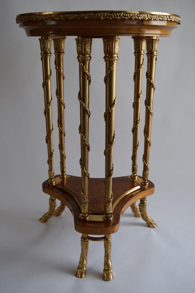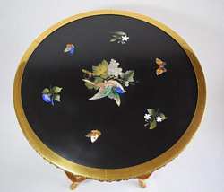 Featuring Lapis Lazuli, Malachite, and other semi-precious stones carefully cut , fit, and inlaid in black marble. "An attractive turn of the century side table. The burl walnut triangular base with 3 pairs of hoof shapedormolu supports below the 3 pairs of ormolu columns w/ scrolling vines. The top mahogany supports the pietra dura fitted marble in an ormolu gallery. Measures 28" high x 18" in diameter." -Source/provenance: Cedric DupontAntiques Palm Beach, where it was purchased. THIRD PARTY SHIPPING REQUIRED. Please familiarize yourself with your pickup/shipping/freight options PRIOR to placing a bid.