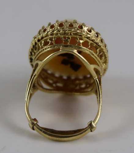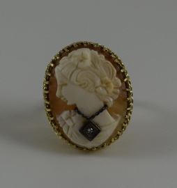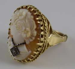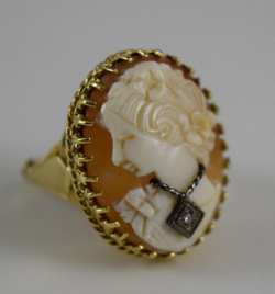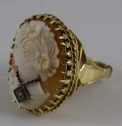 Vintage cameo Depicts a young beauty wearing necklace with small a round diamond pendant. Cameo measures 1" (2.54cm) long x 3/4" (1.9cm) wide. Ring size 8-8.5. Total weight 10.4g. U.S. SHIPPING $15 PLUS INSURANCE