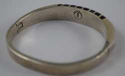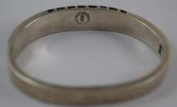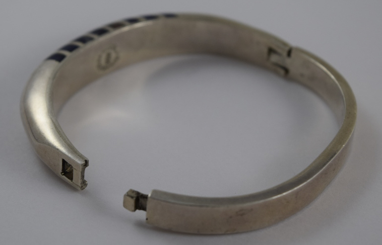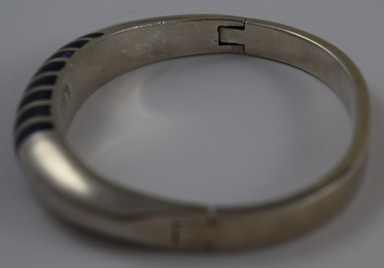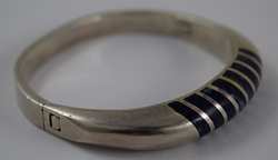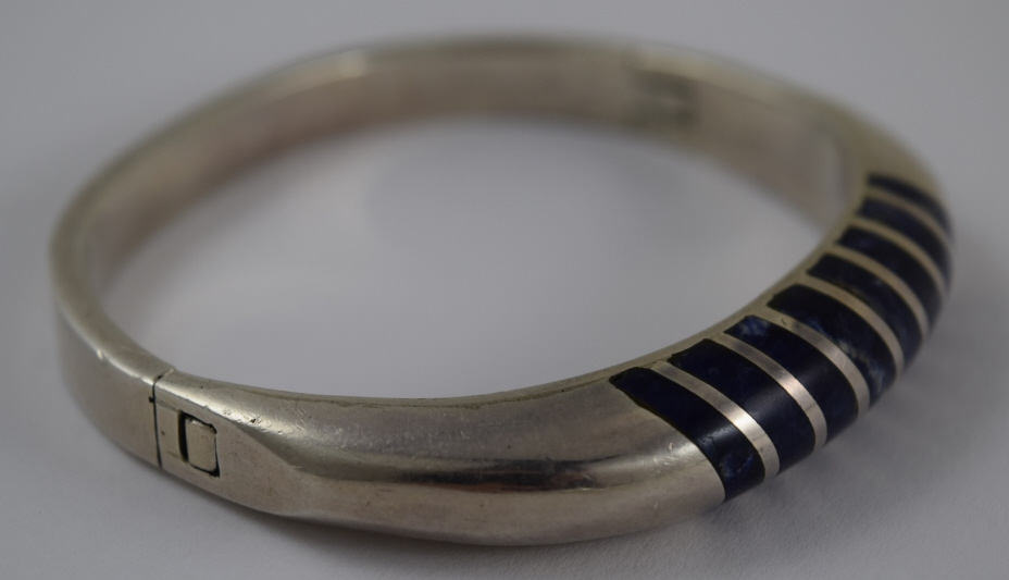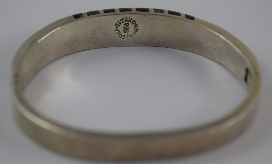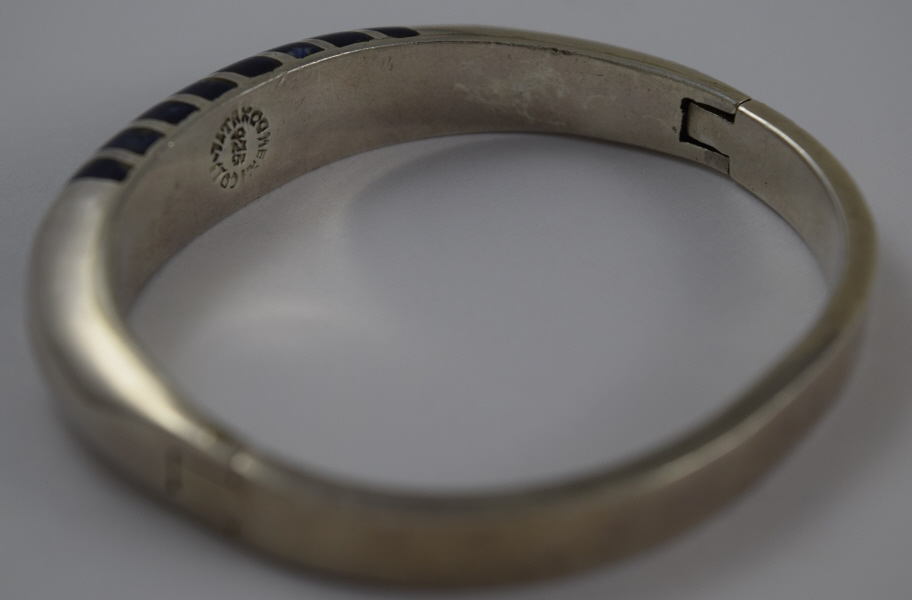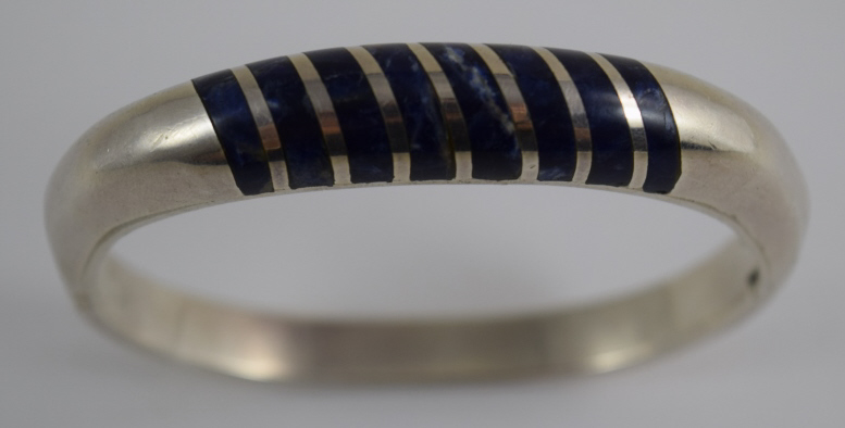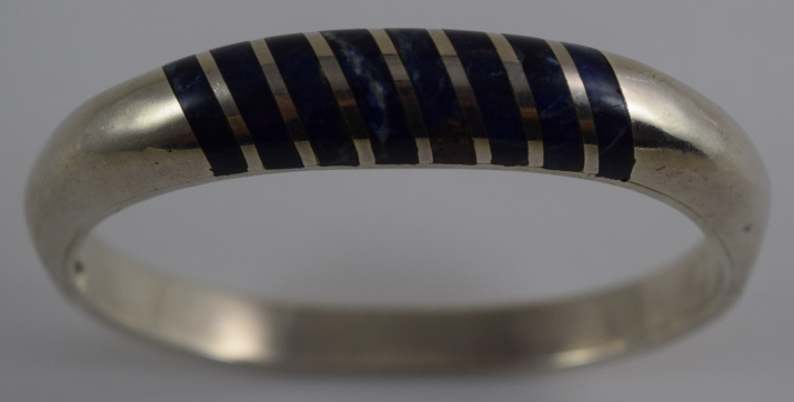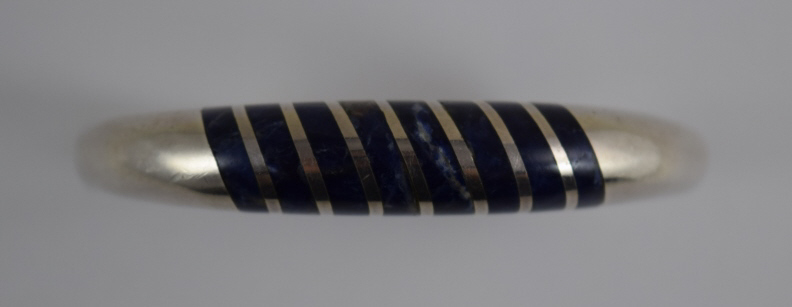 Eight carefully cut and fitted stones set in sterling. Perhaps Turquoise or Lapiz. Hallmarked "Taxco”, “Mexico”, “925”, and “TL-11 or TL-17". Measures 6 3/4” (17.14cm) inner circumference x 1/2” (1.27cm) at itswidest. Weighs 47.2g (1.5 ounces troy). U.S. SHIPPING $15 PLUS INSURANCE