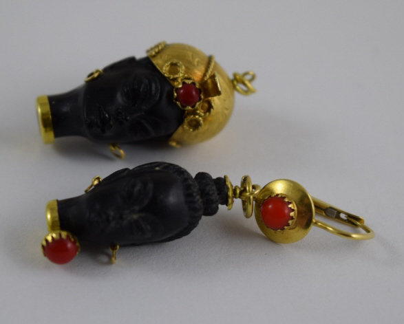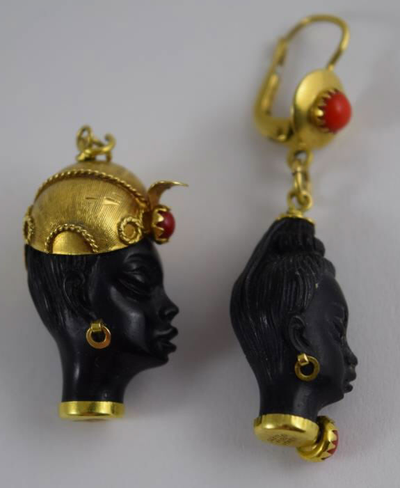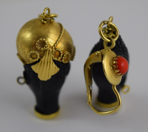 Exquisitely carved vintage genuine ebony African heads. Adorned with 18K gold and coral cabochons. Hallmarked "Corletteo", "18K", and "Italy". Large head pendant measures 1" (25.4mm) tall without post orbail x 1/2" (12.7mm) wide. Small head (lone earring that could also double as a pendant) measures 7/8" (22.2mm) tall without post or bail x 3/8" (9.5mm) wide. Total weight of 6.6g. U.S. SHIPPING $15 PLUS INSURANCE