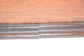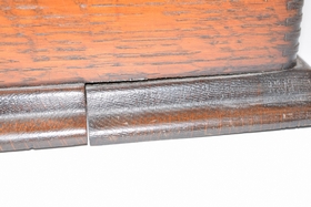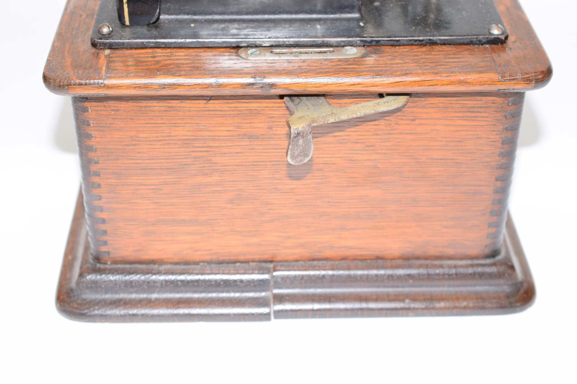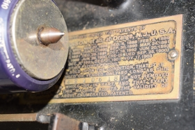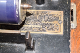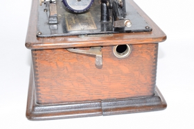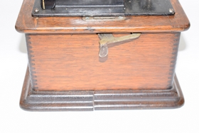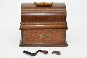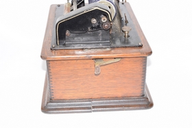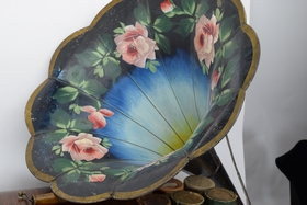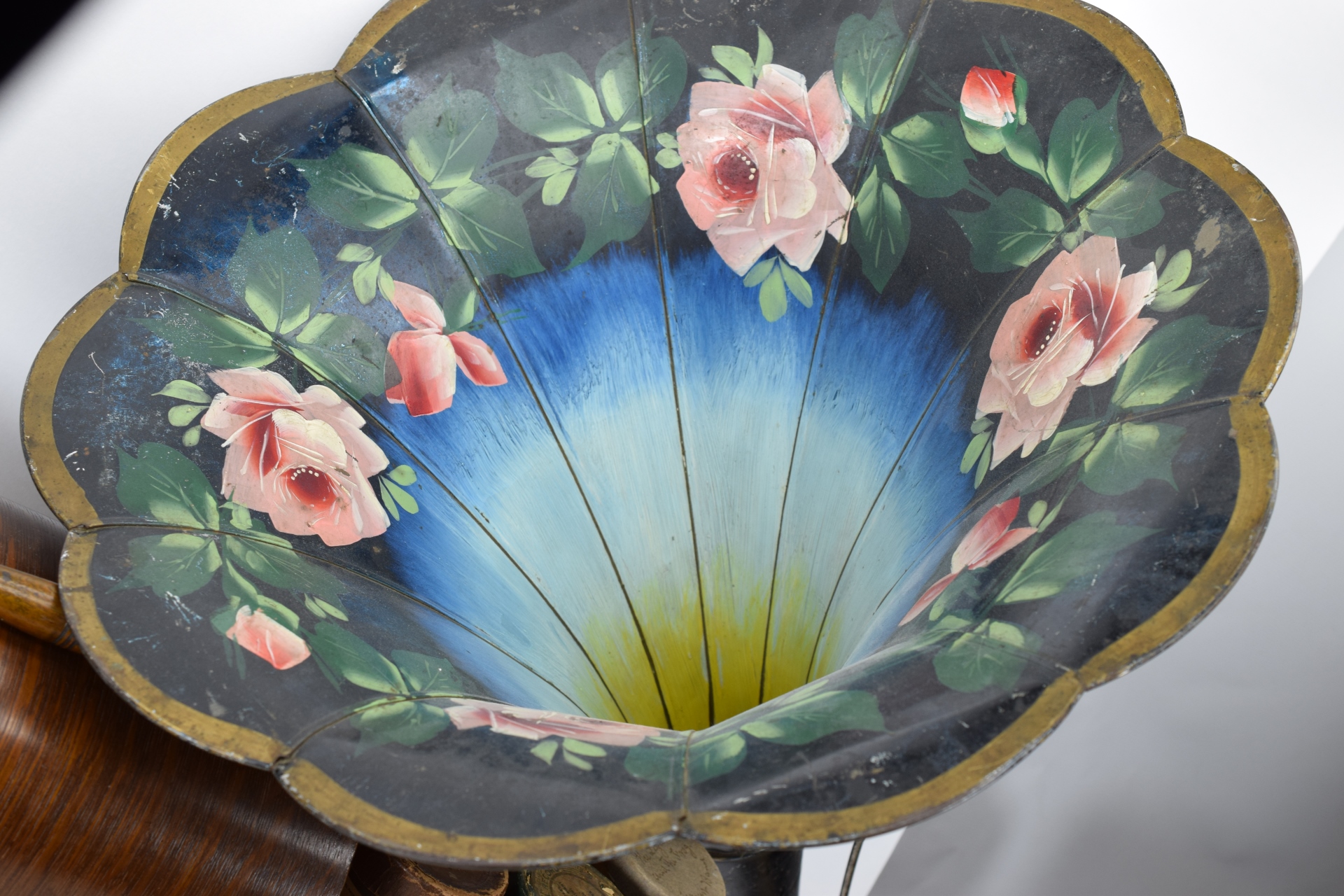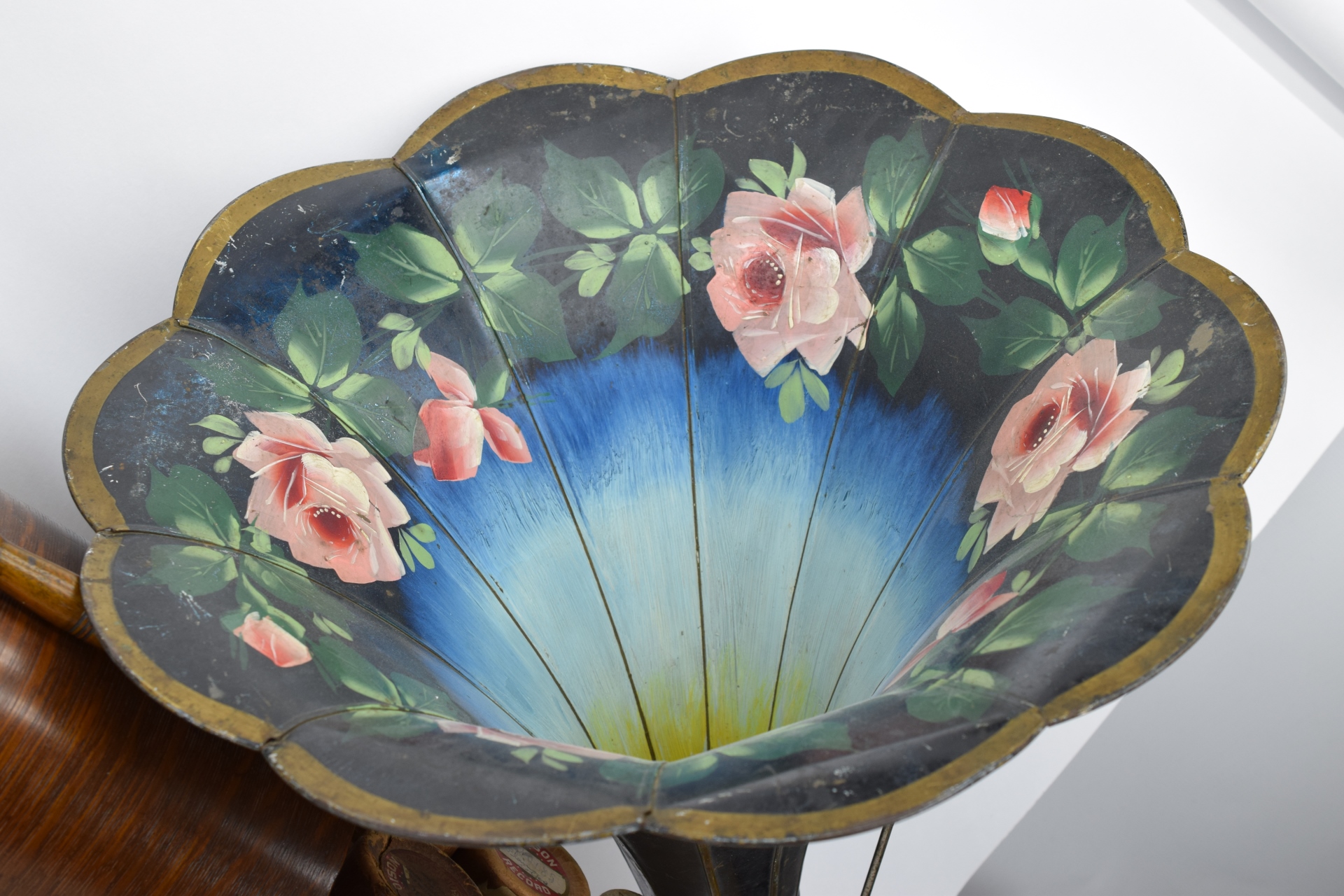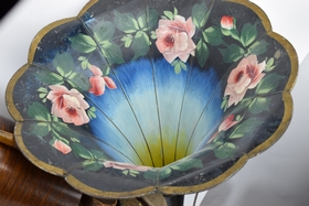 Serial #5210618. 32 records and floral painted horn. Bottom split slightly loose. Player measures 12-1/2” L x 9” W x 10-1/4” H (not including top handle) Horn measures approx. 25-1/2” (not including fitting).