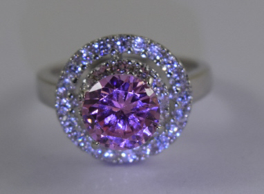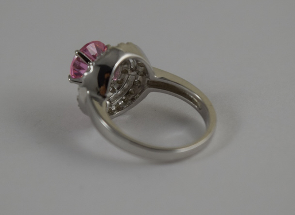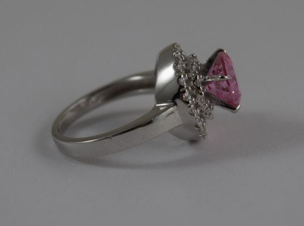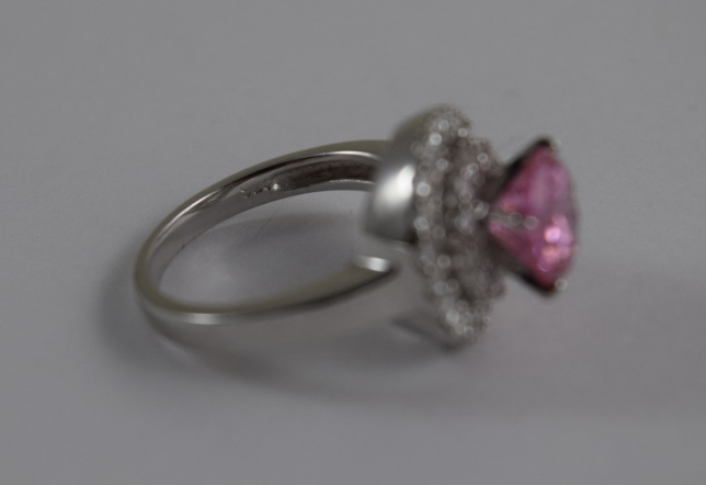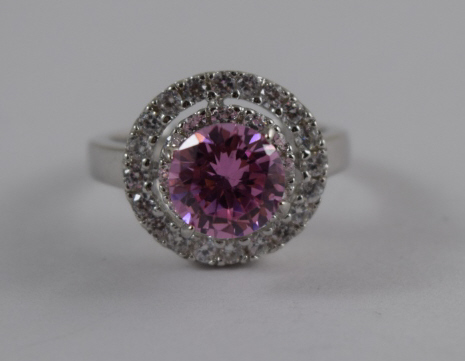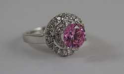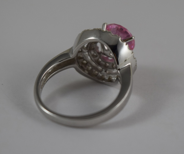 Beautiful pink sapphire encompassed by white topaz. Size 6.5. Weighs 5.3g. U.S. SHIPPING $15 PLUS INSURANCE