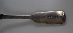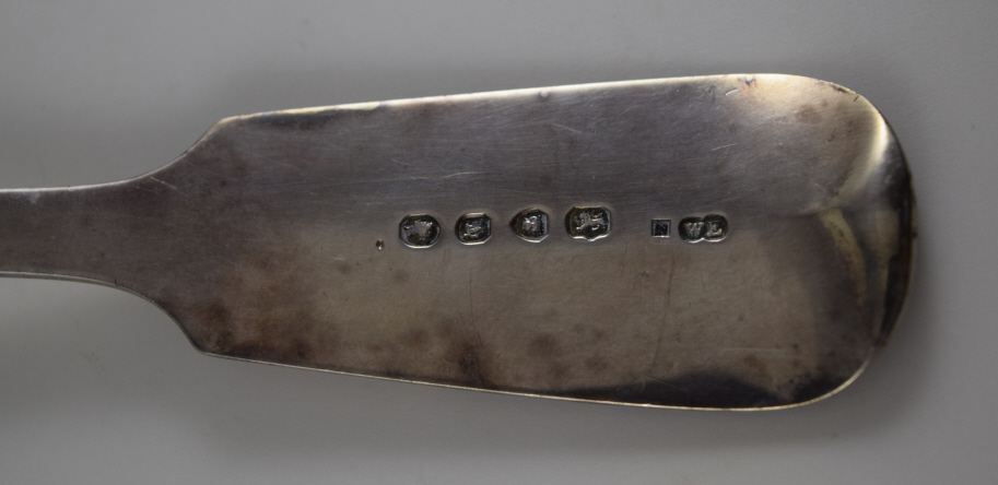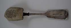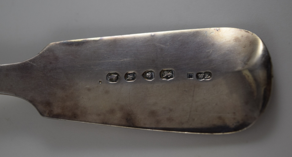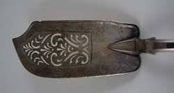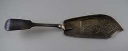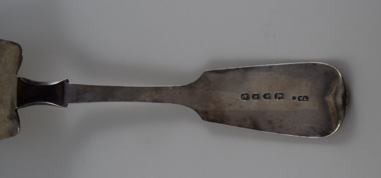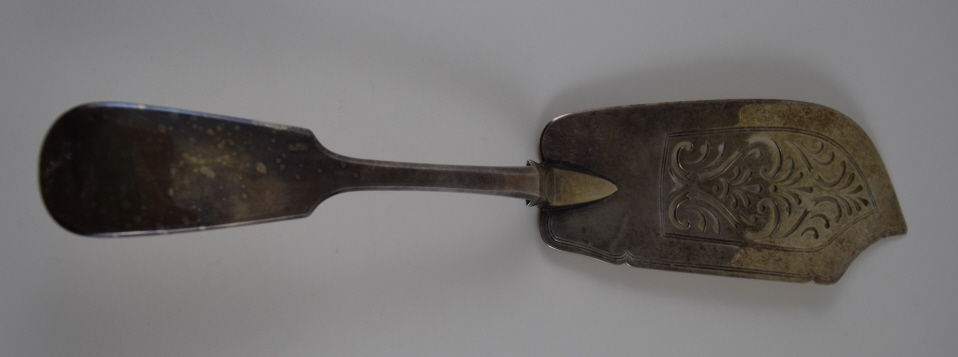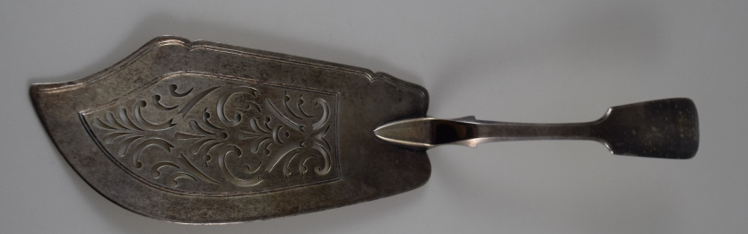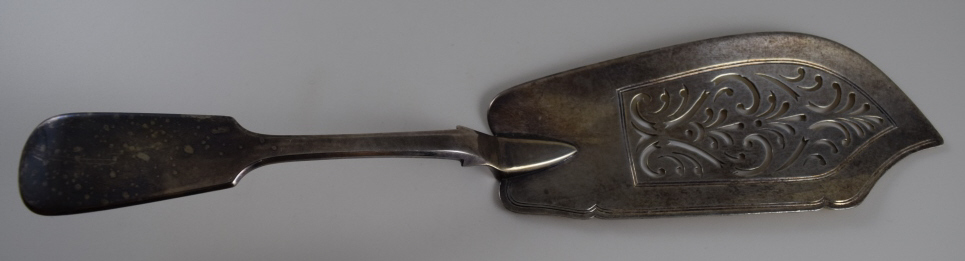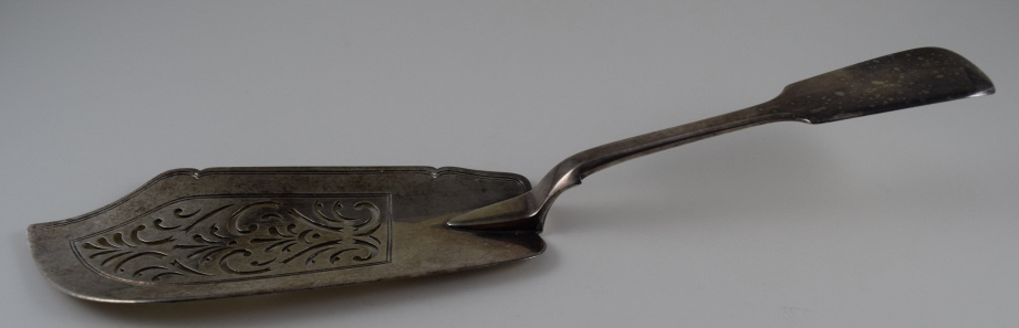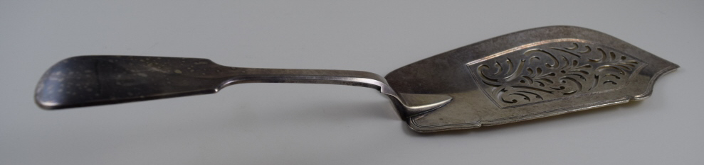 Antique1843 English sterling silver fish slice, having a plain fiddle pattern handle, a hand-pierced symmetrical Georgian pattern, and curved blade. Hallmarked “[lion facing left], [lion face], [lowercase h] and[sovereign head]” each in cartouche. Also marked “WE” in conjoining circles with a tiny “z” beside it. Measures 11 3/4” (29.84cm) long x 2 1/2” (6.35cm) at it's widest. Weighs 161.3g (5.18 ounces troy). U.S. SHIPPING $15 PLUS INSURANCE