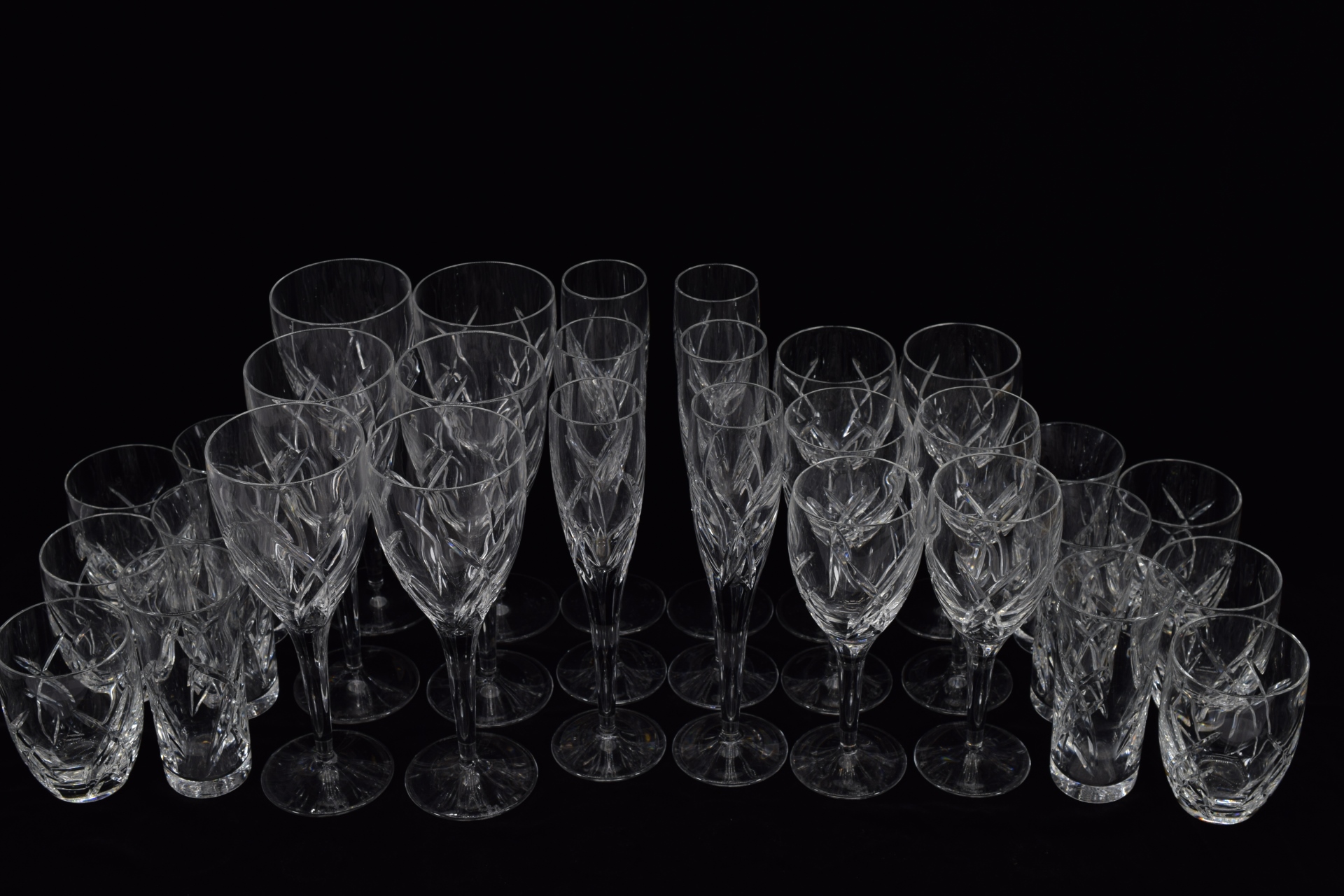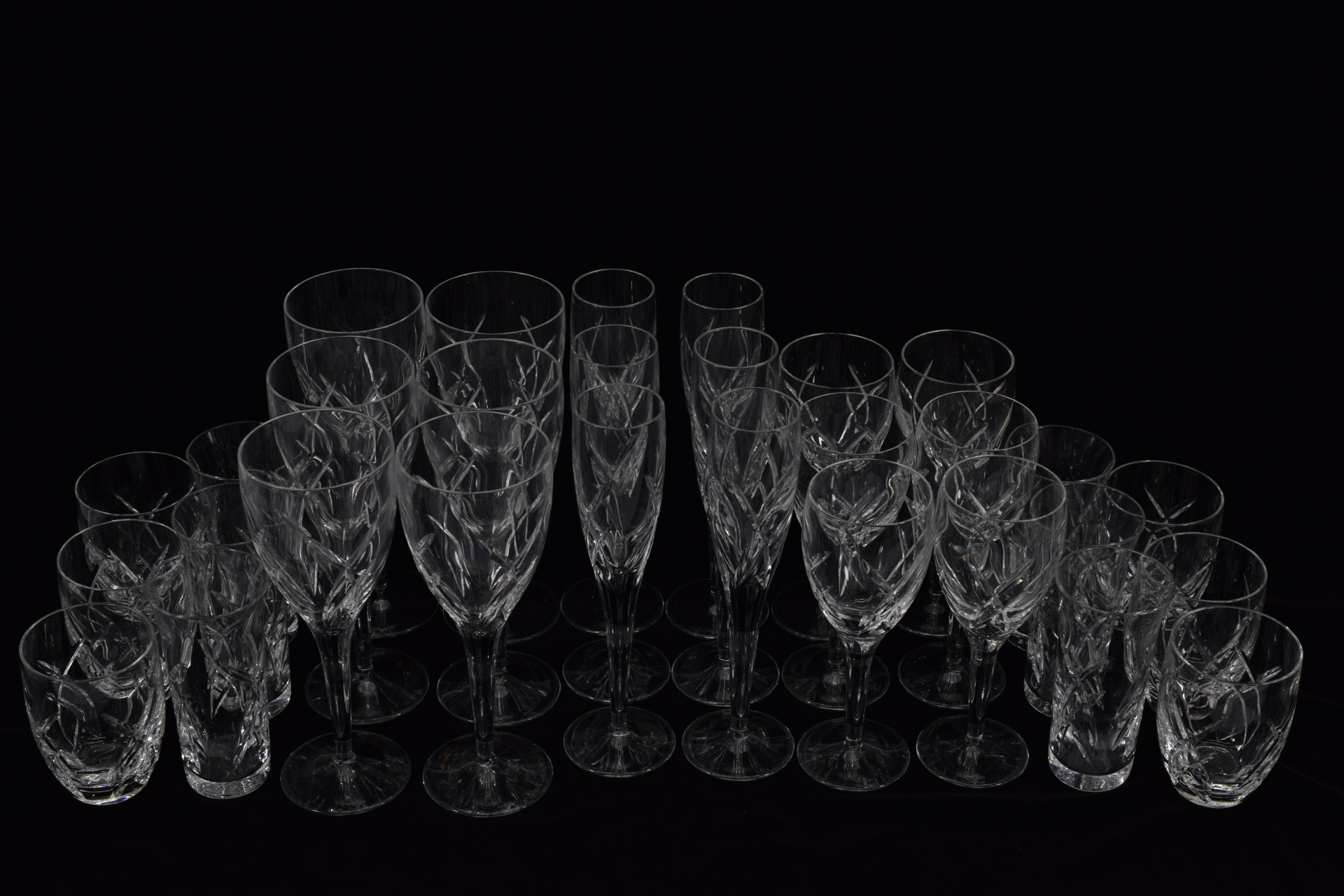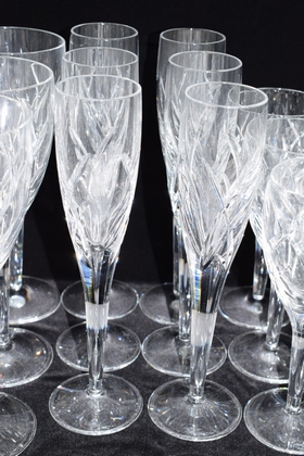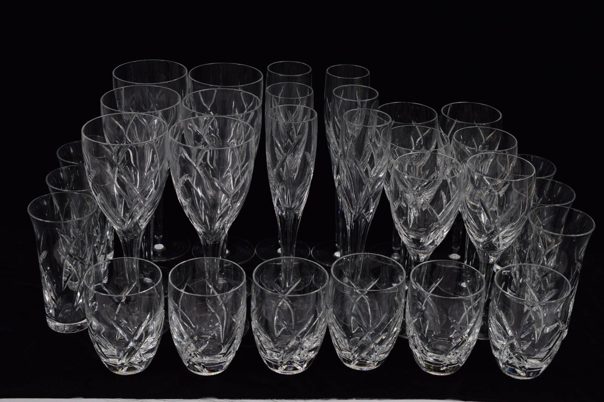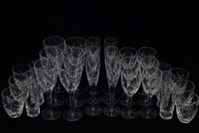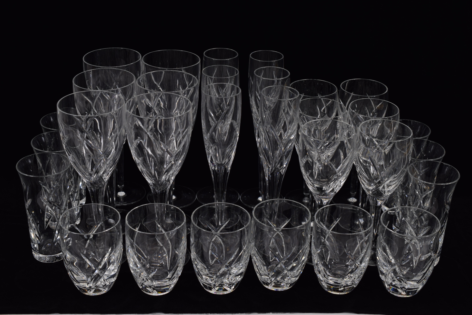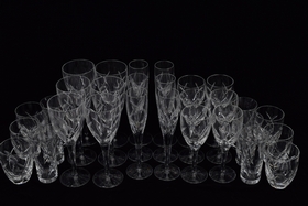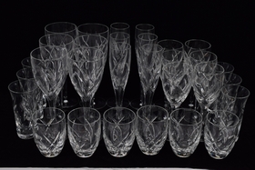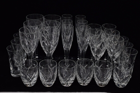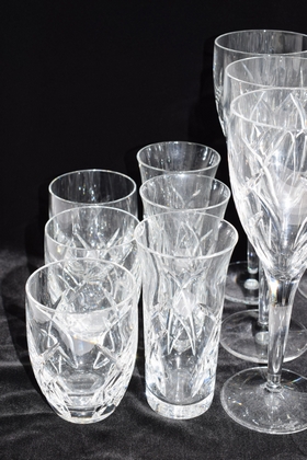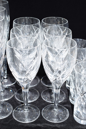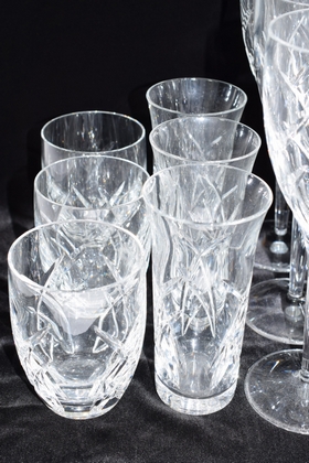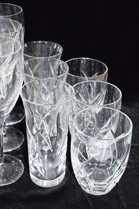 Service for six with cut criss-cross design including; (6) 9-3/4” water goblets, (6) 8-1/4” white wine glasses, (6) 10-1/4” fluted champagne glasses, (6) 4-1/2” 12oz flat tumblers, and (6) 6-1/8” 8oz highball glasses.