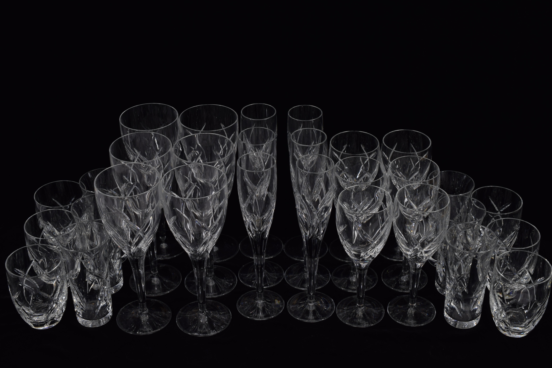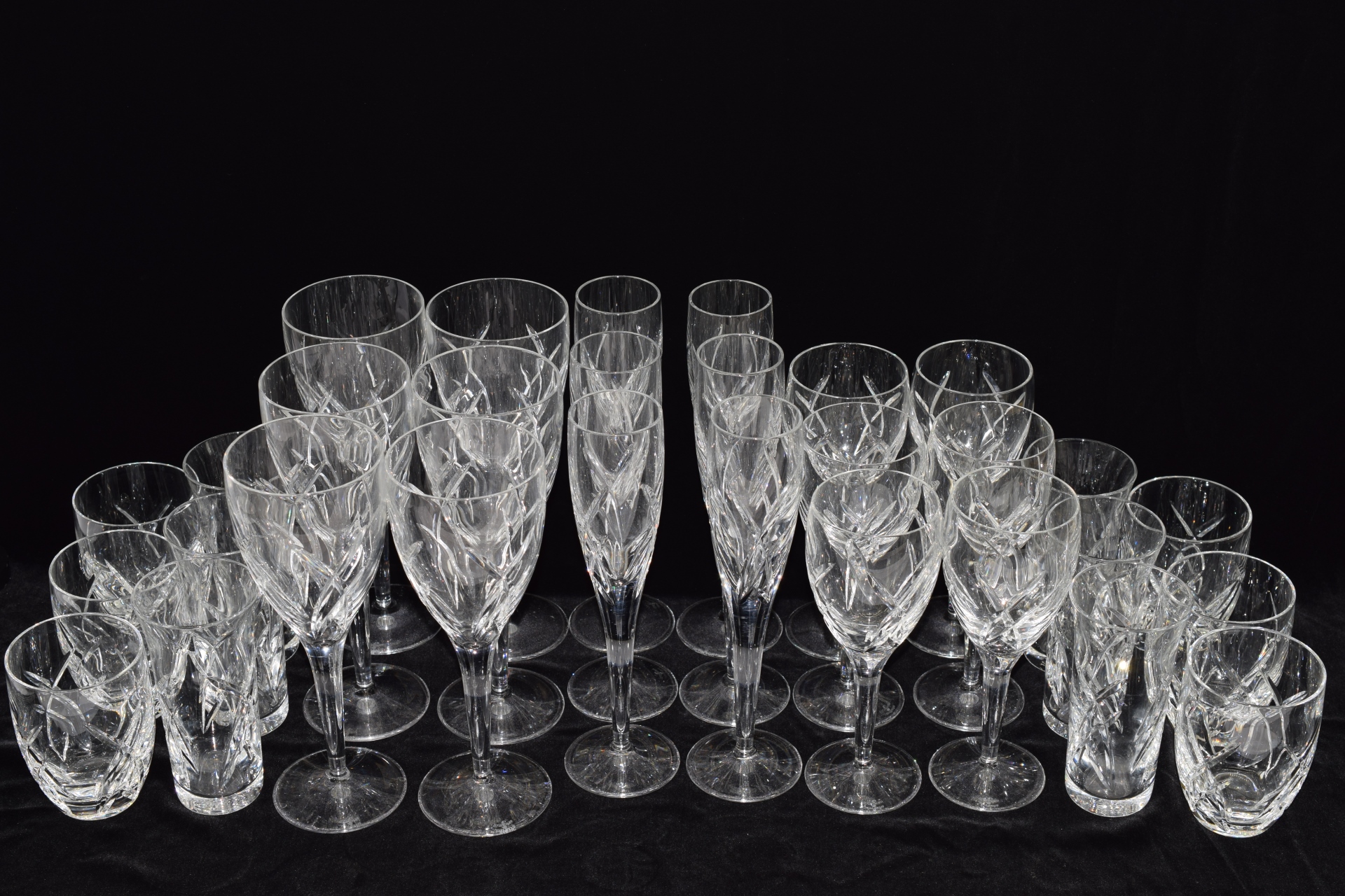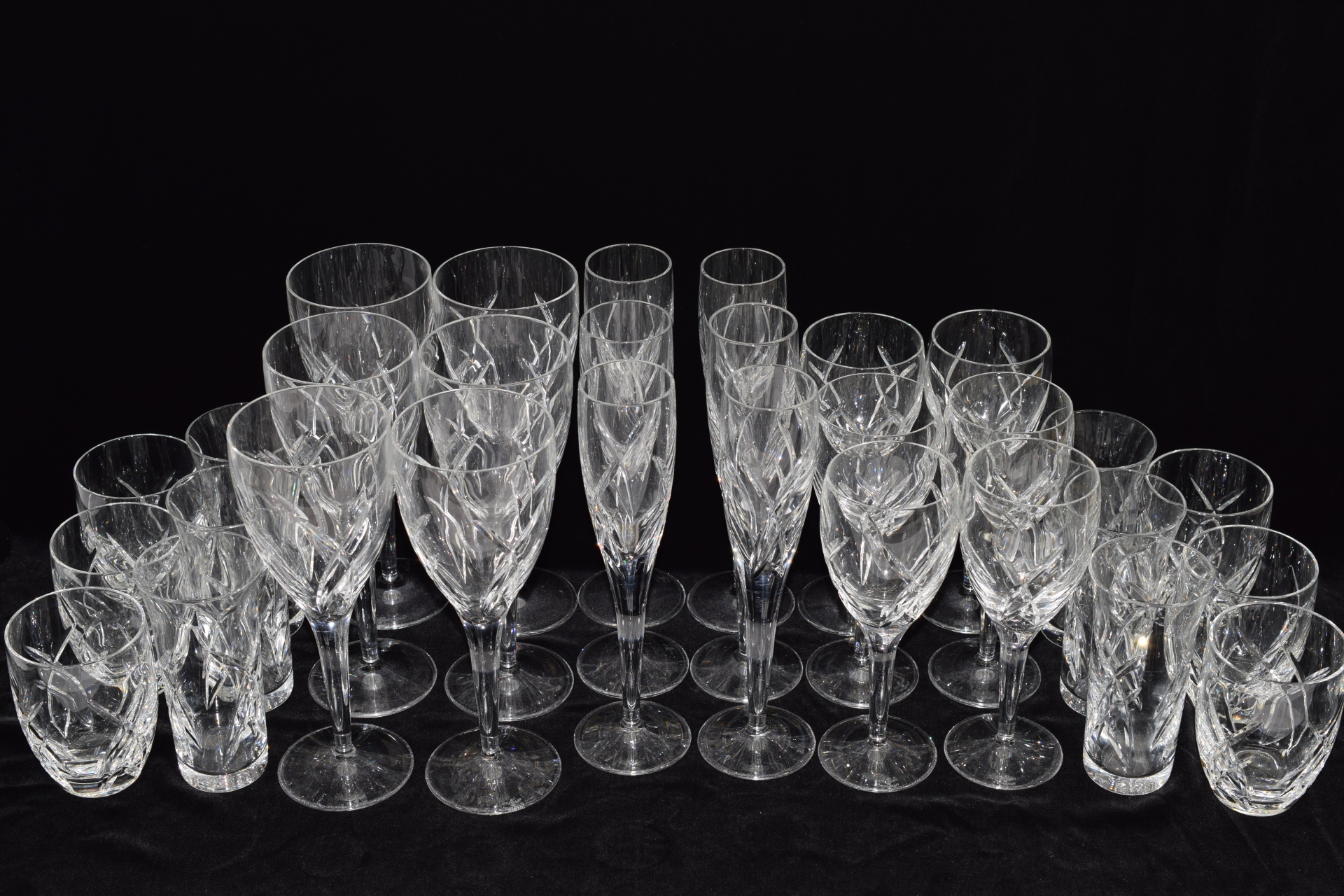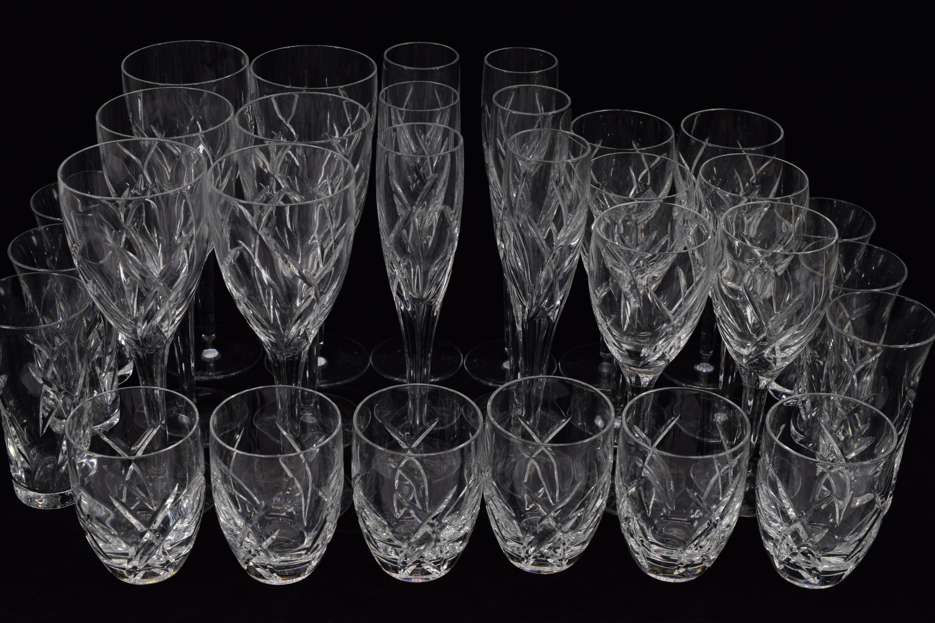 Service for six with cut criss-cross design including; (6) 9-3/4” water goblets, (6) 8-1/4” white wine glasses, (6) 10-1/4” fluted champagne glasses, (6) 4-1/2” 12oz flat tumblers, and (6) 6-1/8” 8oz highball glasses.