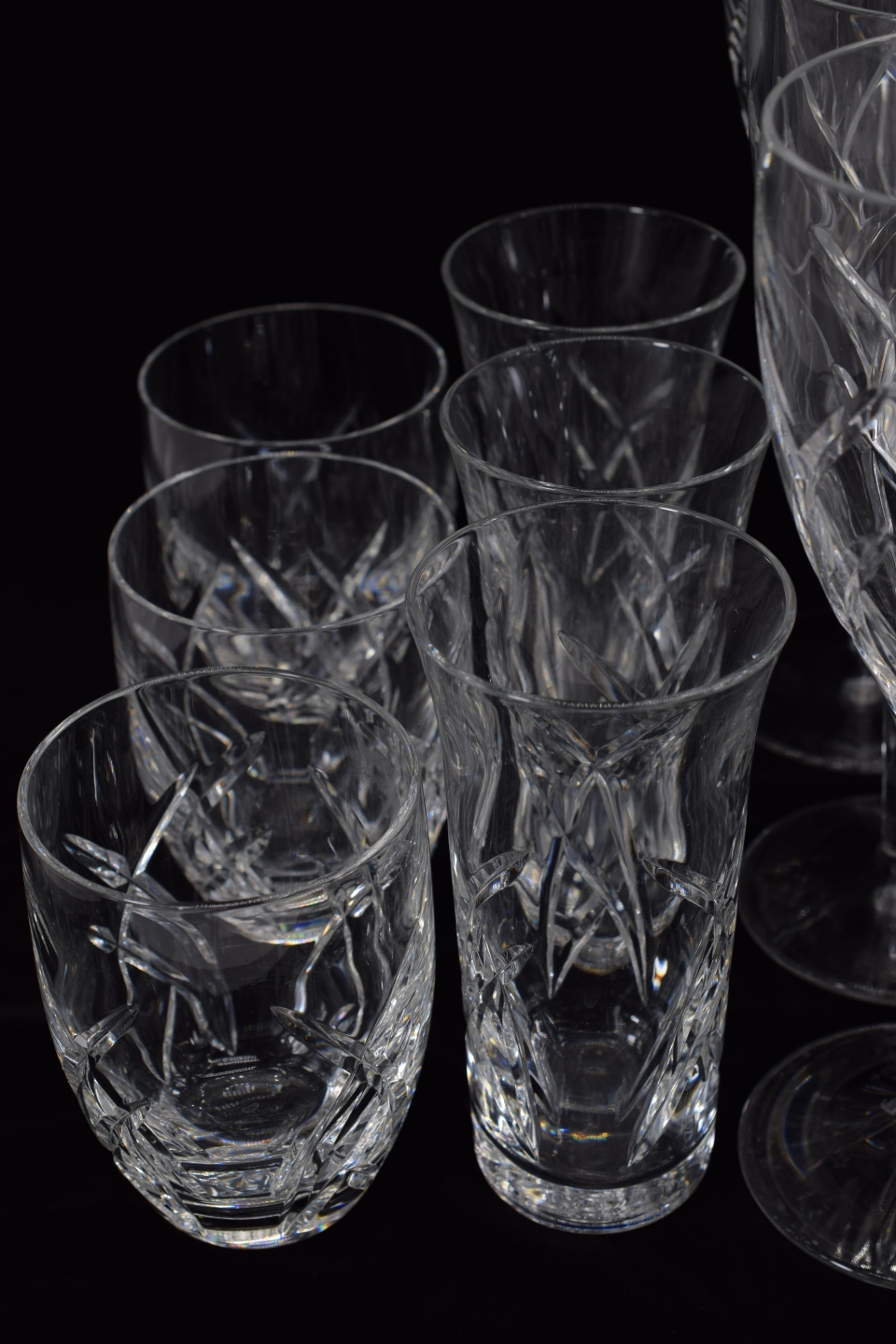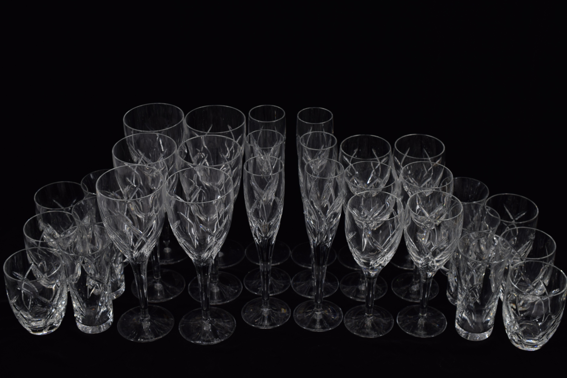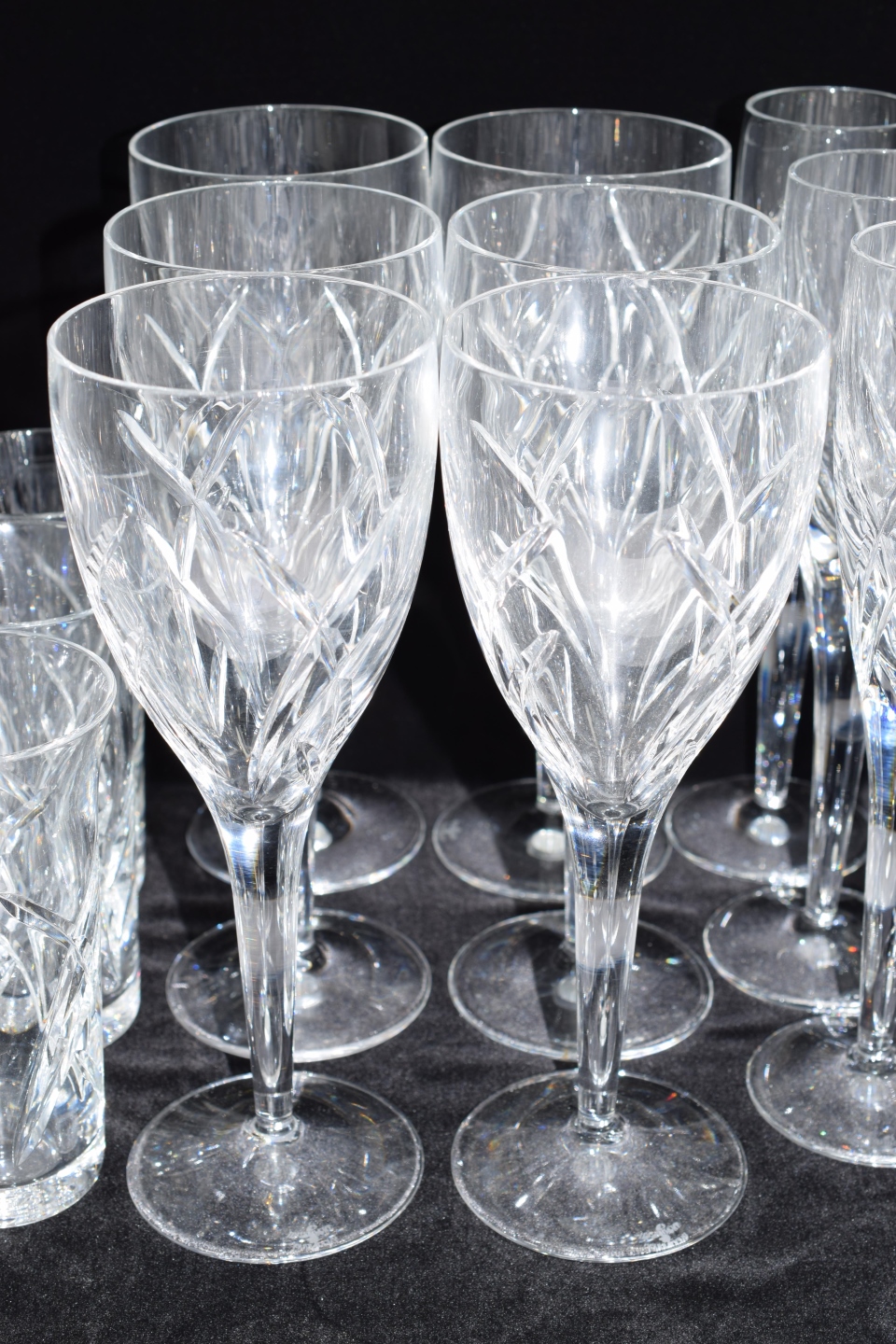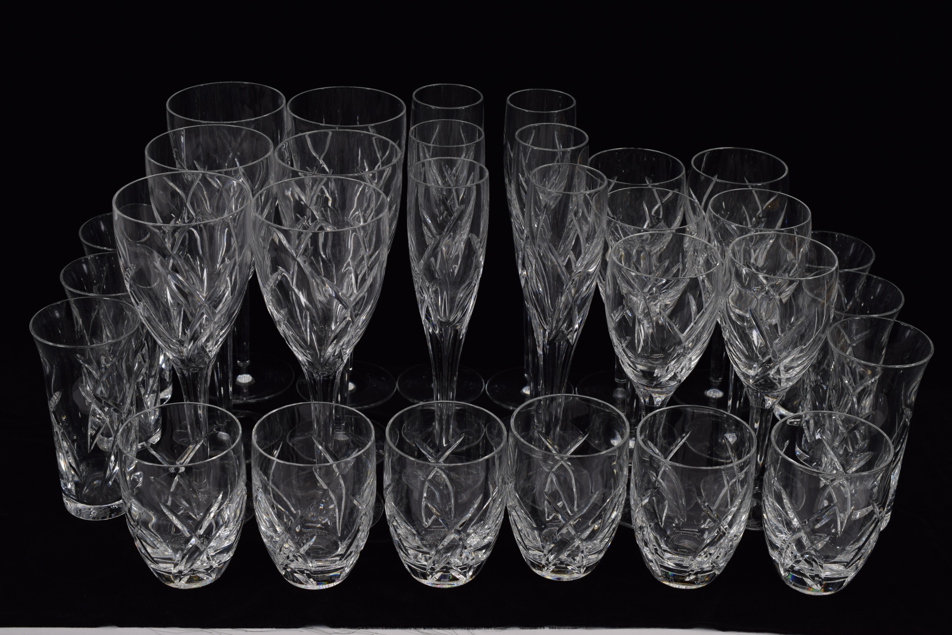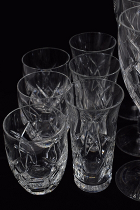 Service for six with cut criss-cross design including; (6) 9-3/4” water goblets, (6) 8-1/4” white wine glasses, (6) 10-1/4” fluted champagne glasses, (6) 4-1/2” 12oz flat tumblers, and (6) 6-1/8” 8oz highball glasses.