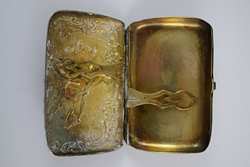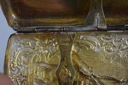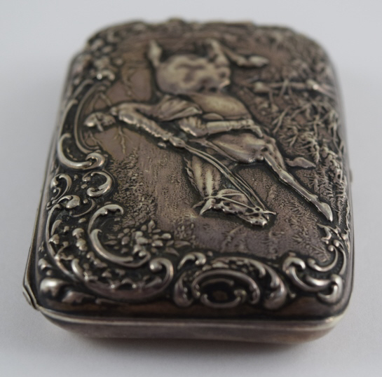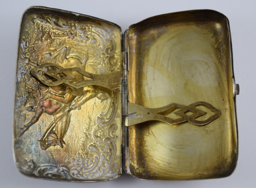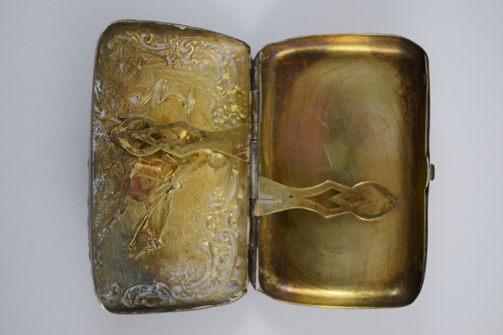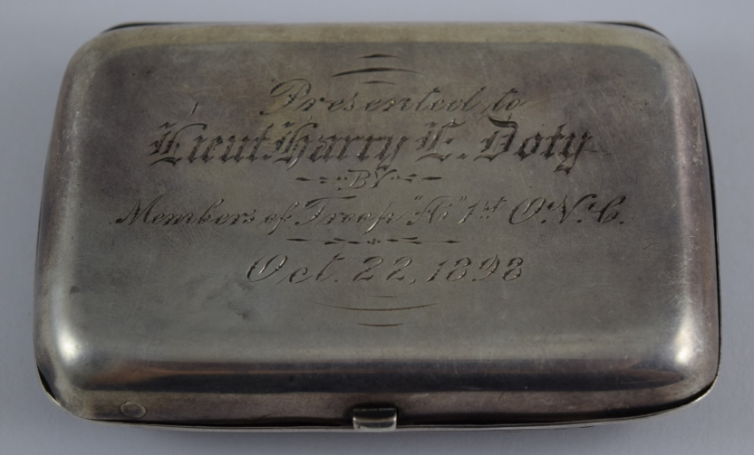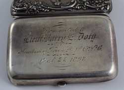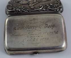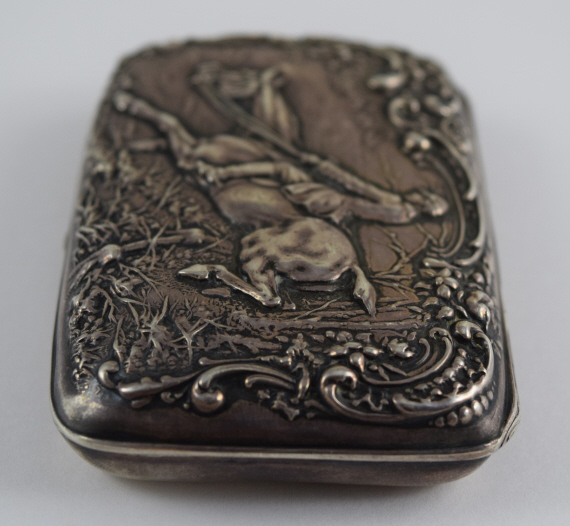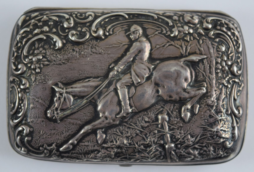 Beautiful equestrian scene with repousse rider and horse jumping a fence, surrounded by repousse woods scenery and scrollwork. Presented to Lieutenant Harry E. Doty (Ohio) on October 22nd, 1898by the Members of TroopA 1st O.V.C. Hallmarked "[Deer head]", "Sterling", and "35". Measures 3 1/8" (7.93cm) long x 2 1/16" (5.23cm) wide x 3/4" (1.9cm) deep. Weighs 58.8g (1.9 ounces troy). U.S. SHIPPING $15 PLUS INSURANCE