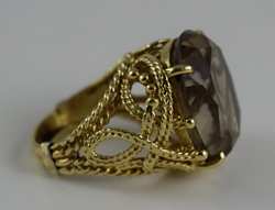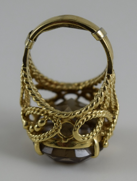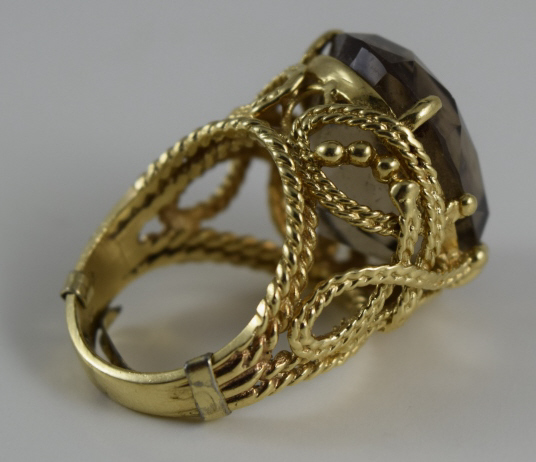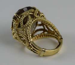 Delicate gold rope-work adorning an approximately 4ct stone, measuring 7/8" (2.2cm) long x 3/4" (1.9cm) wide x 1/2" (1.27cm) deep. Ring size 8-8.5. Total weight 16.2g. U.S. SHIPPING $15 PLUS INSURANCE