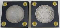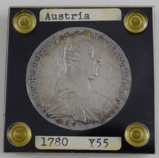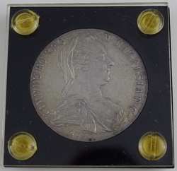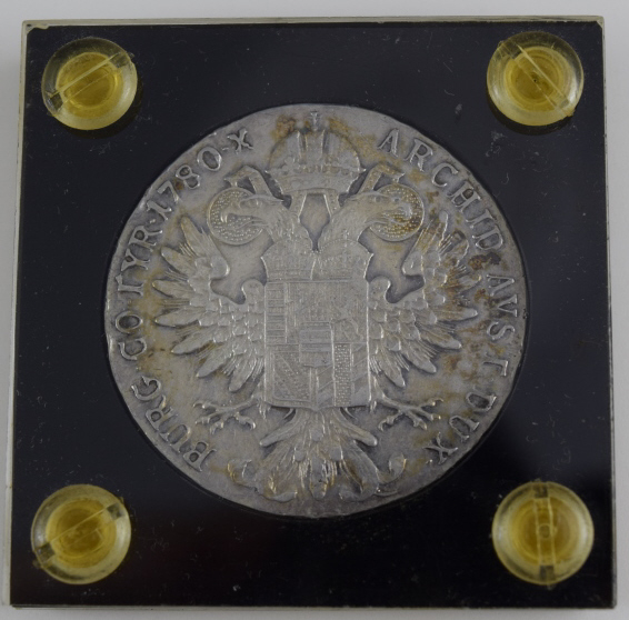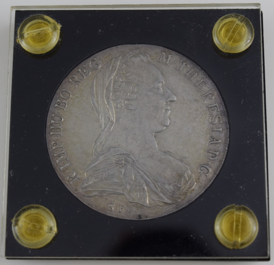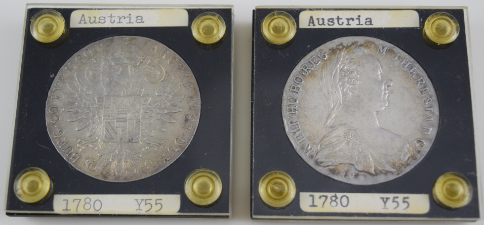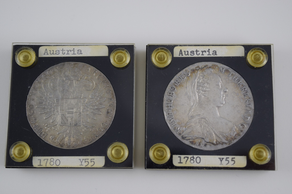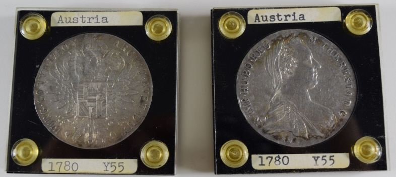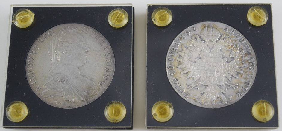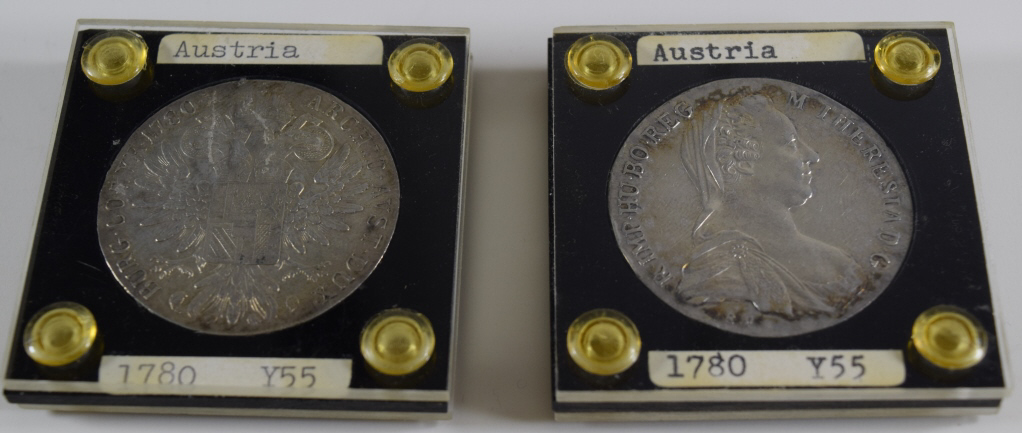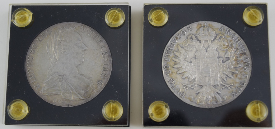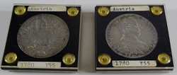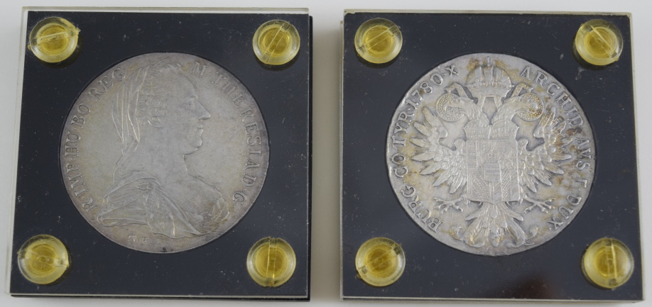 2 1780 Austria Thaler (or Taler or Talir) of Maria Theresa coins. Encased and labeled. Obverse: Draped bust of Maria Theresa right, wearing a brooch on shoulder drapery. Reverse: Crown above double headed imperialeagle, crowned multiple coat of arms at chest. Total weight 4.1 oz. U.S. SHIPPING $15 PLUS INSURANCE