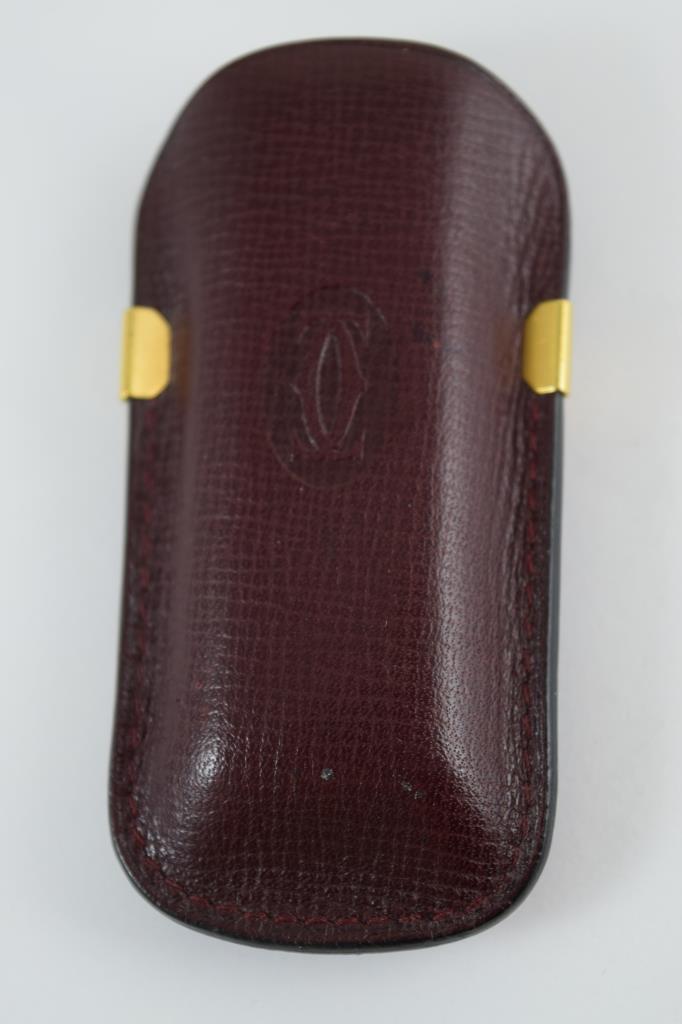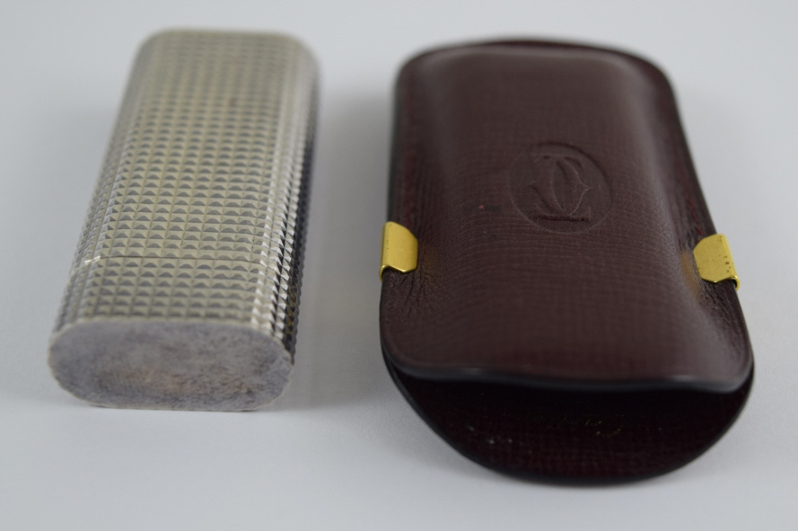 Comes in fitted leather Cartier case with gold tabs imprinted [double "C"] Cartier mark. Tested working. Marked "Cartier" signature, "Paris", "SWISS MADE", "CC", "C82926", and "© CARTIER". Measures 2 3/8"(6cm) long x 1" (2.54cm) wide x 1/2" (1.27cm) deep, pouch slightly larger. Total weight. 75.6g (2.7oz). U.S. SHIPPING $15 PLUS INSURANCE