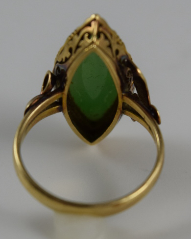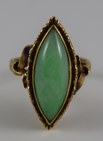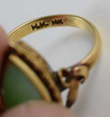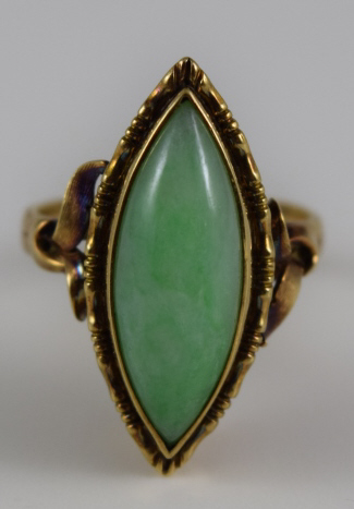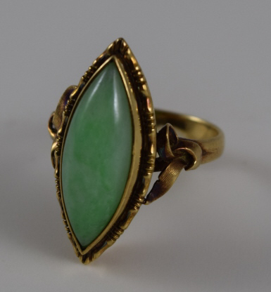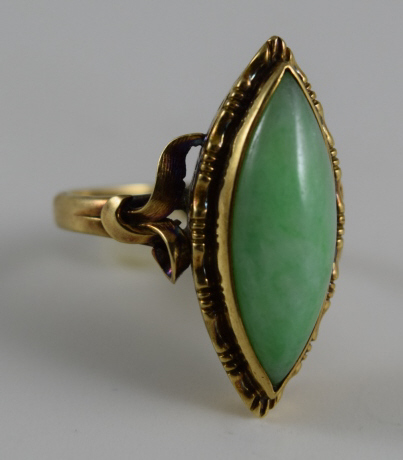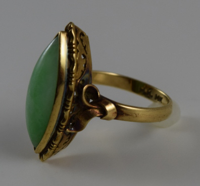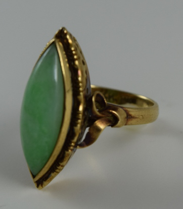 139 - LADIES 14K GOLD RING w/ MARQUISE JADEITE CABOCHON