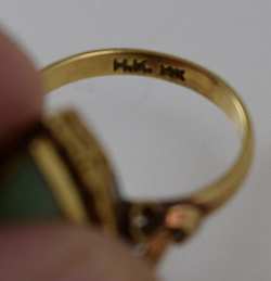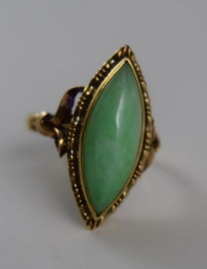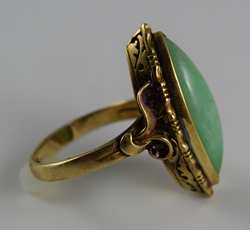 Ladies 14 karat yellow gold ring featuring a large marquise cut fine quality cabochon green jadeite jade stone. The stone is in a handcrafted 14 karat yellow gold setting, framed with a delicate bamboo motif with lacy hand-cut filigree to the sides. Center stone measures 20.6mm x 7.4mm x 5.7mm. Stunning mottled translucent white to apple green jadeite colors. Hallmarked "14k" and "H.K". Ring size 7.5. Weight 6.2g. U.S. SHIPPING$15 PLUS INSURANCE