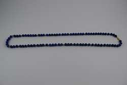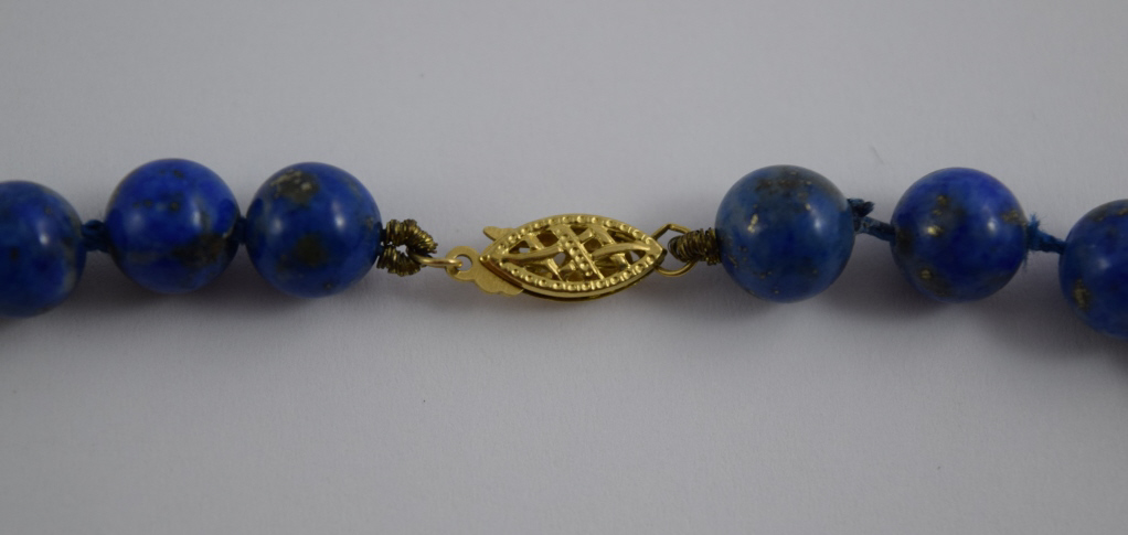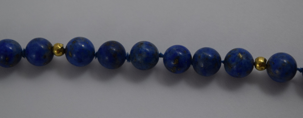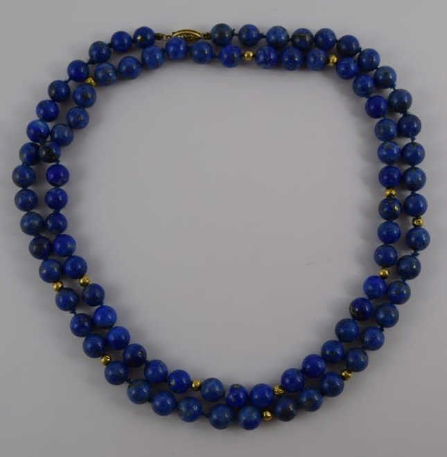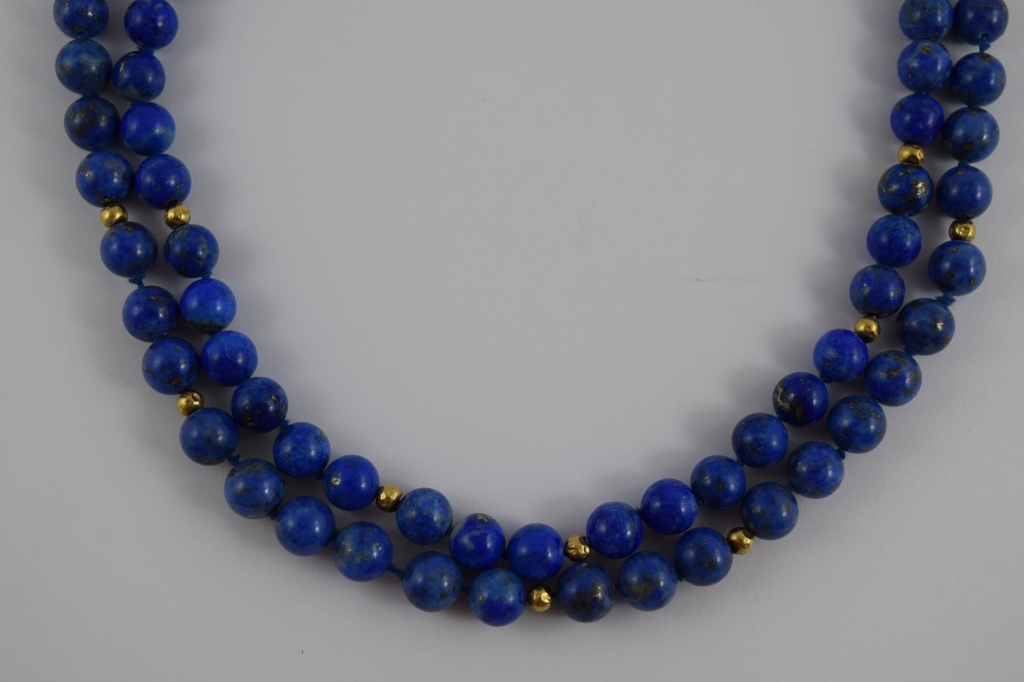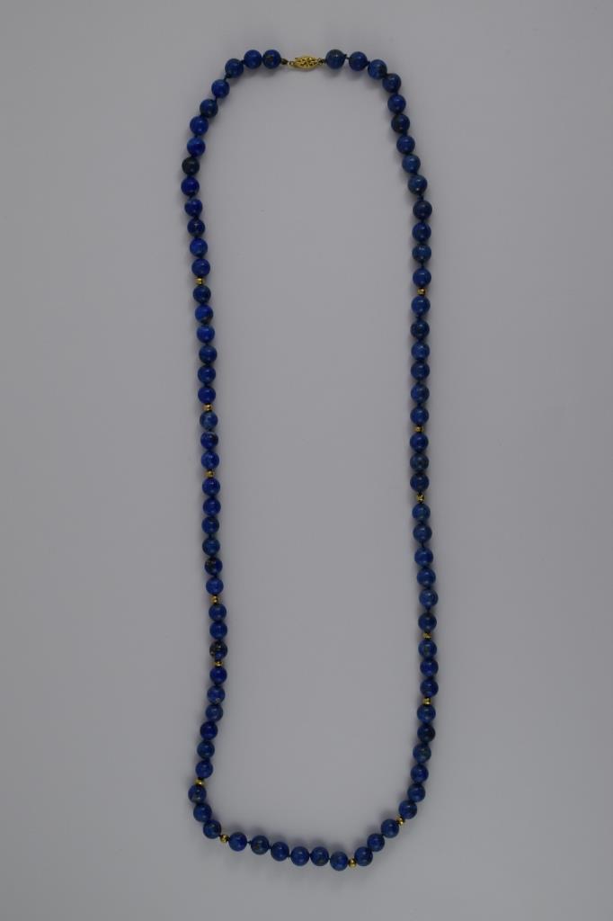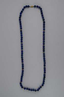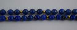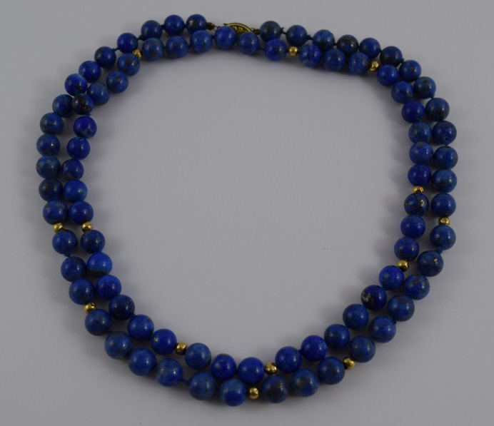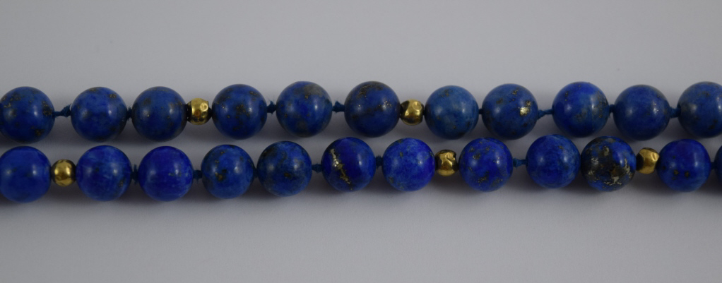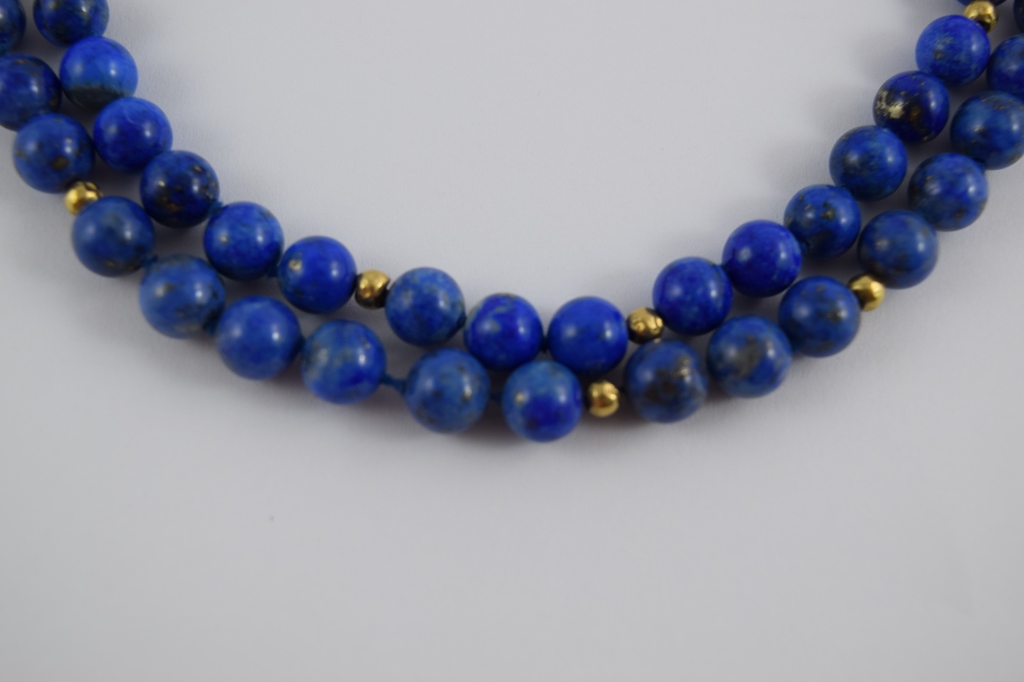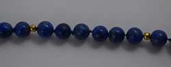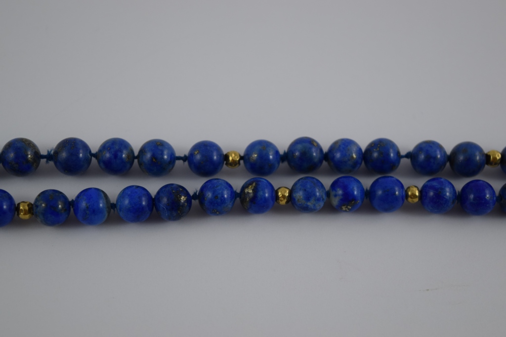 Eighty six (8mm) beads of lapis, each separated by a knot, interrupted by fourteen (4mm) beads of 14k gold with a 14k gold clasp. Measures 33" (83.8cm). Weighs 69.6g (2.5oz). U.S. SHIPPING $15 PLUS INSURANCE