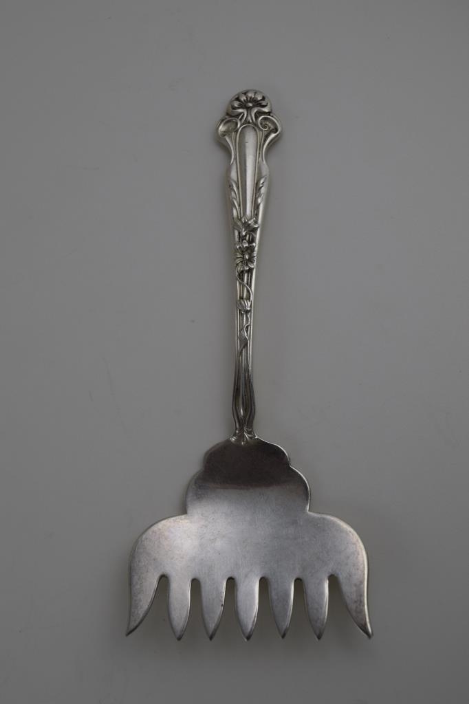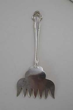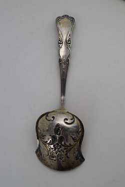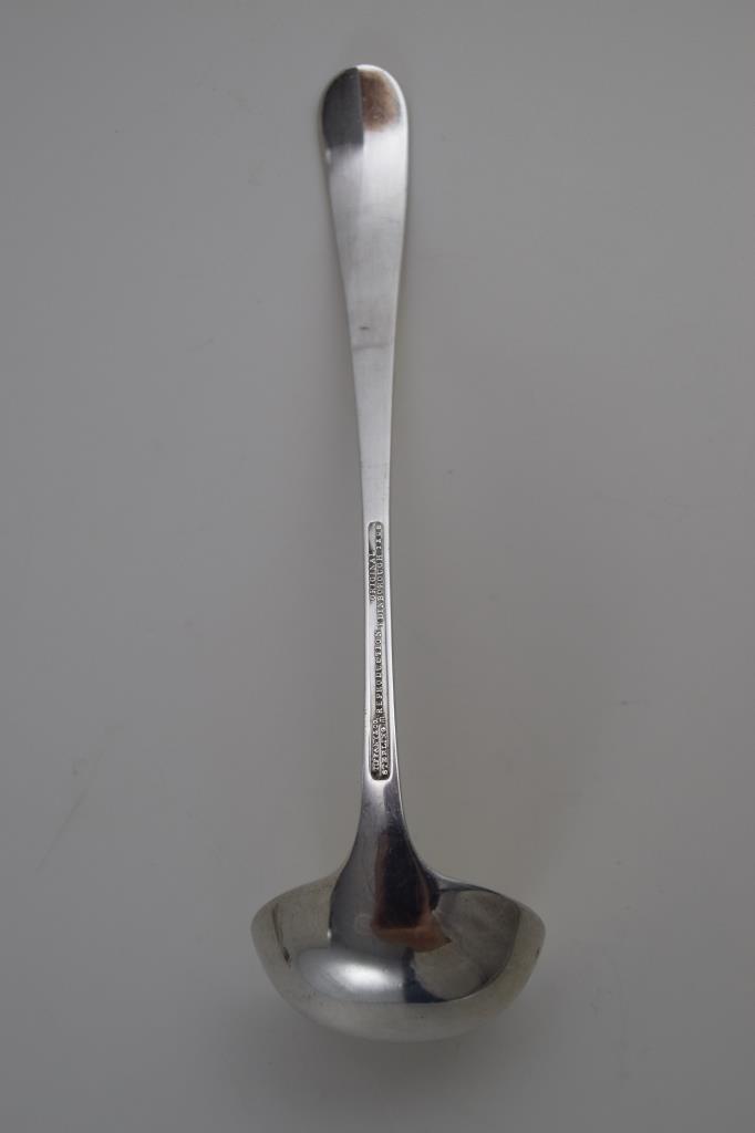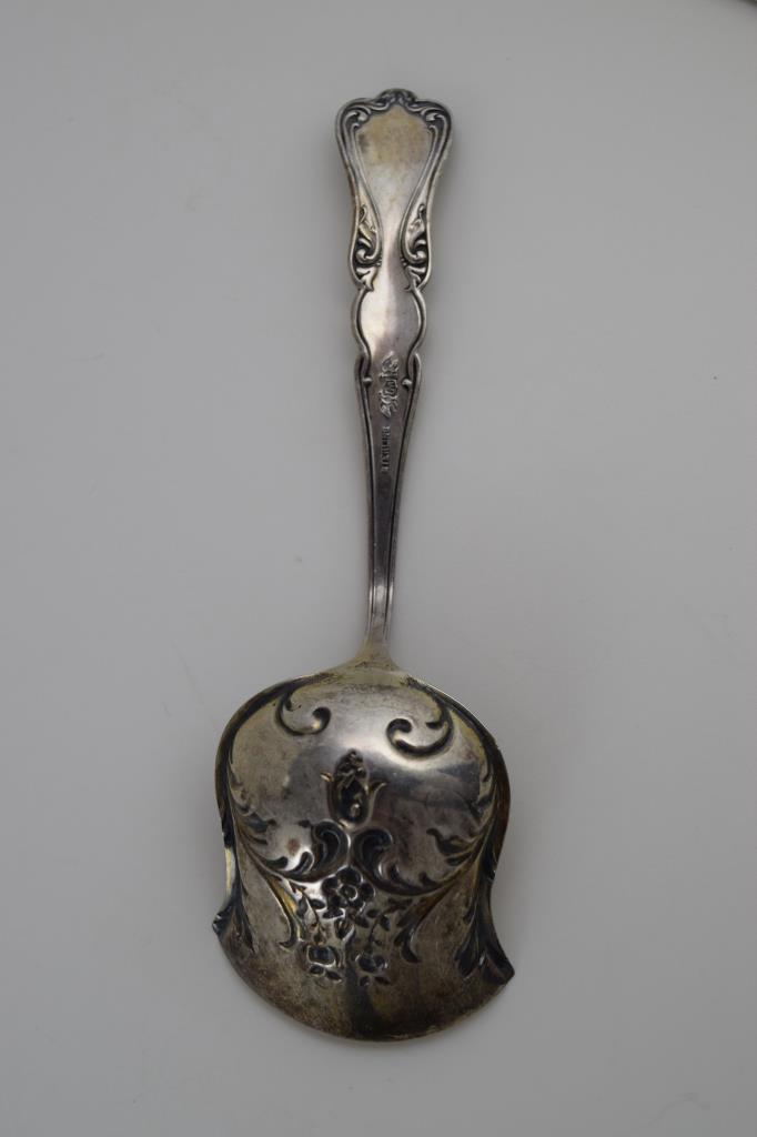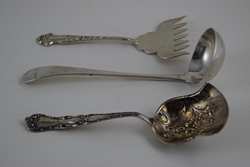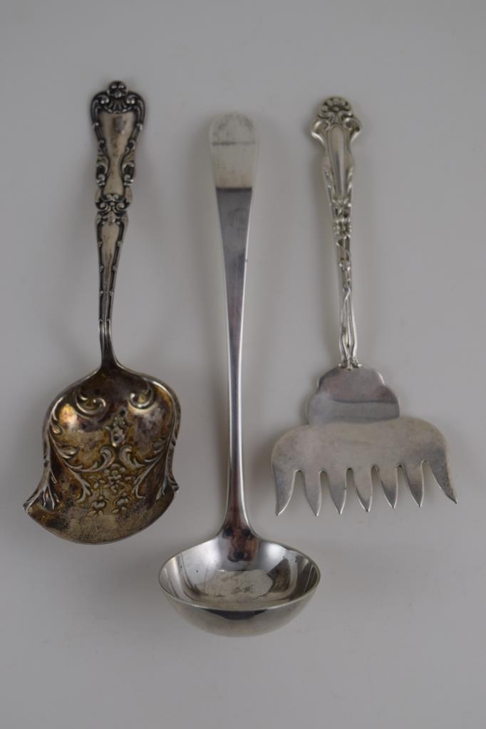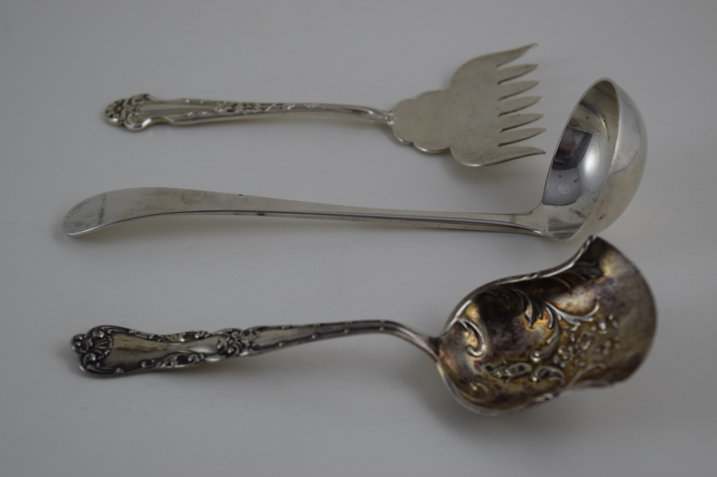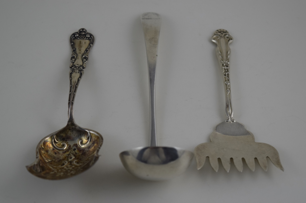 Bacon server (Pat.1904), sugar spoon (Manchester Silver Company), and ladle (Tiffany & Co. reproduction original Edinborough). Measuring from 4 1/2" (11.4cm) to 6" (15.2cm) long. Total weight 73.4g. (2.4 ounces troy). U.S. SHIPPING $15 PLUS INSURANCE