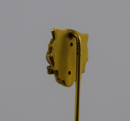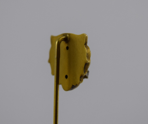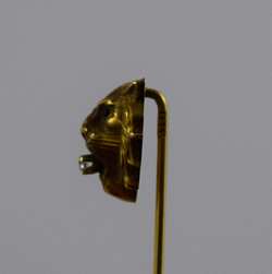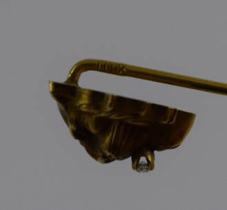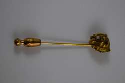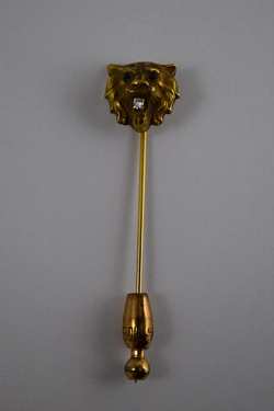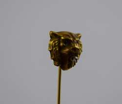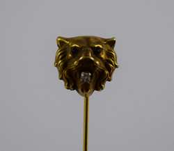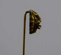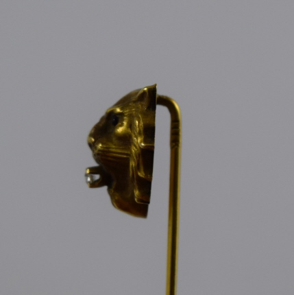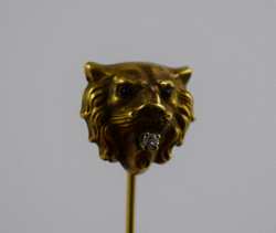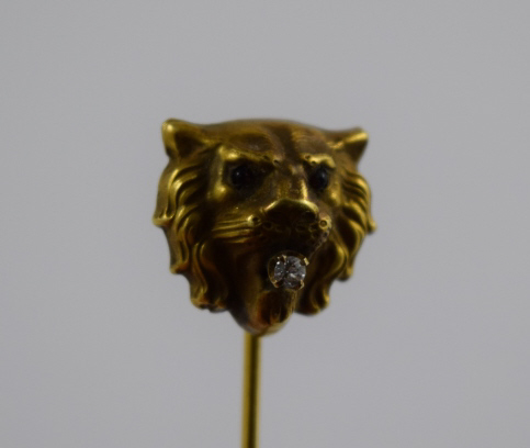 Lion head holding diamond in his mouth with ruby eyes. More recent end-protector added. Lion head measures 1/2" (1.3cm) high x 1/2" (1.3cm) wide x 1/4" (.6cm) deep. Pin measures 2 3/8" (6cm) long. Weight withoutend-protector is 1.8g. U.S. SHIPPING $15 PLUS INSURANCE