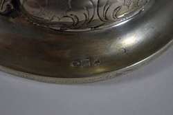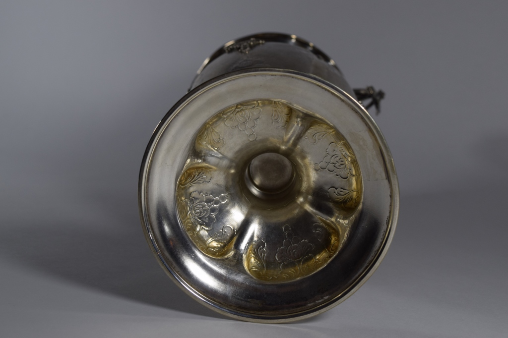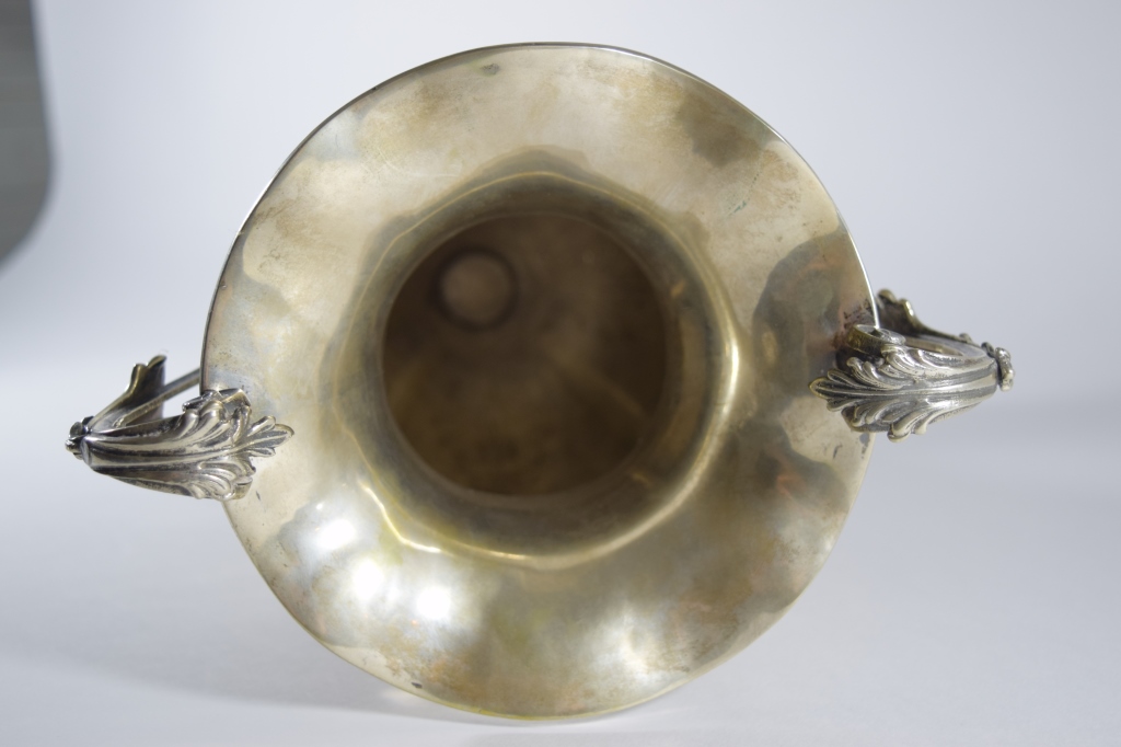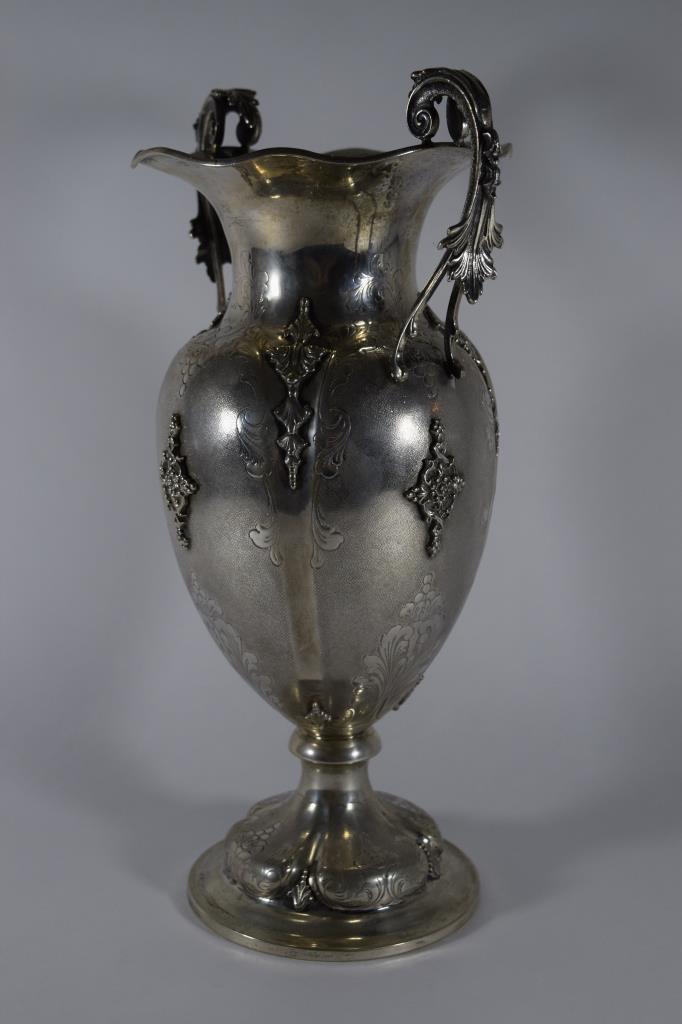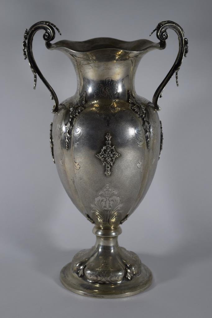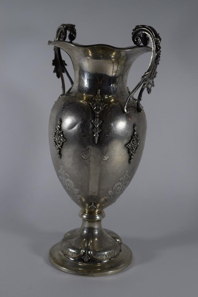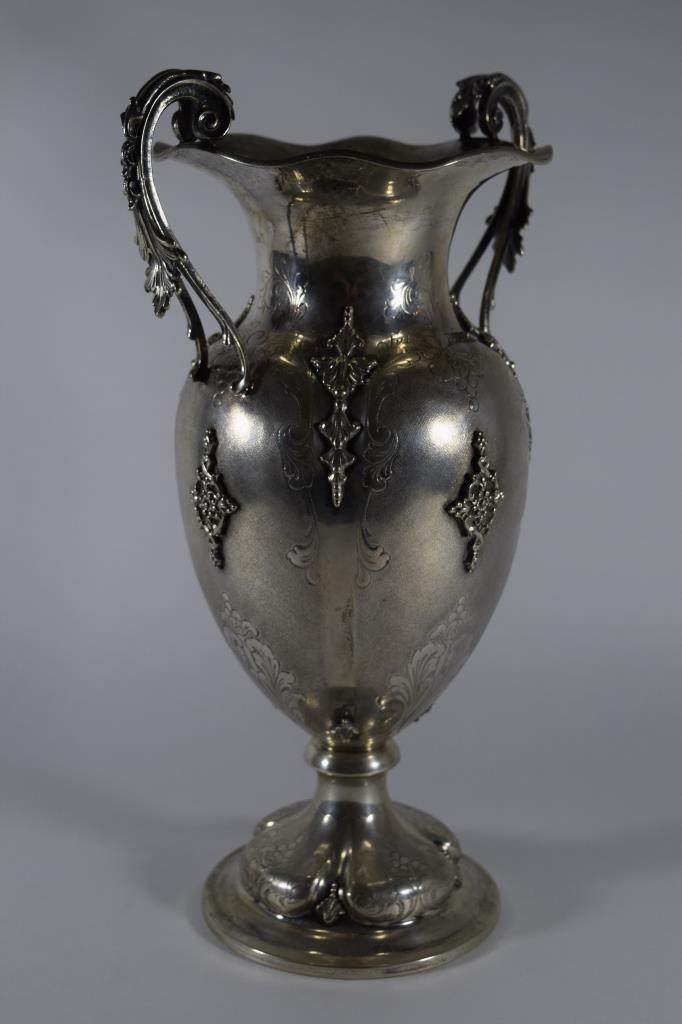 Italian Alessandria .800 silver hand chased and decorated handled vase. Beautiful floral chasing and hammered. Circa 1944-1968. Hallmarked "376AL [in cartouche]", "[Winged-lion]", and ".800 [in cartouche]".Measures 13 1/2" (34.29cm) high x 8" (20.32cm) in diameter at handles. Weighs 1026g (33 ounces troy). THIRD PARTY SHIPPING REQUIRED