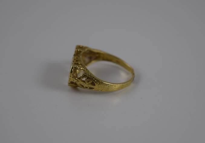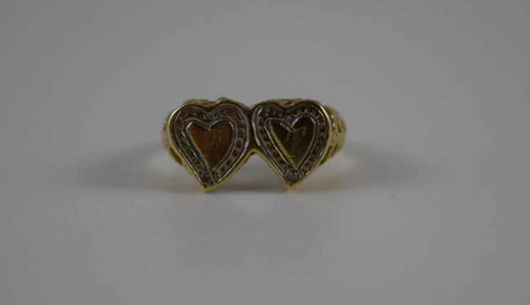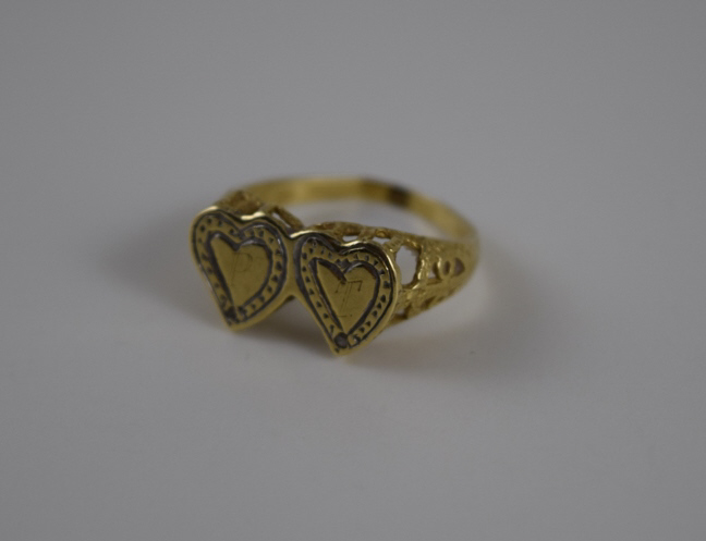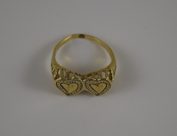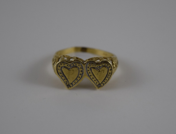 Depicting two hearts. One heart has faint (easily removable) inscription "P", the other heart "T". Hallmarked "14K" and "GH". 2 hearts measure 11/16" (17.5mm) long, 1/3" (8.5mm) wide. Size 7 to 7.5. Weighs 2.8g.U.S. SHIPPING $15 PLUS INSURANCE