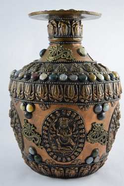 Beautiful vase with Hindu gods, Buddhas, dragons, and semi-precious stones. Measures 11" H x 9" W. Weighs 4lbs., 2oz..