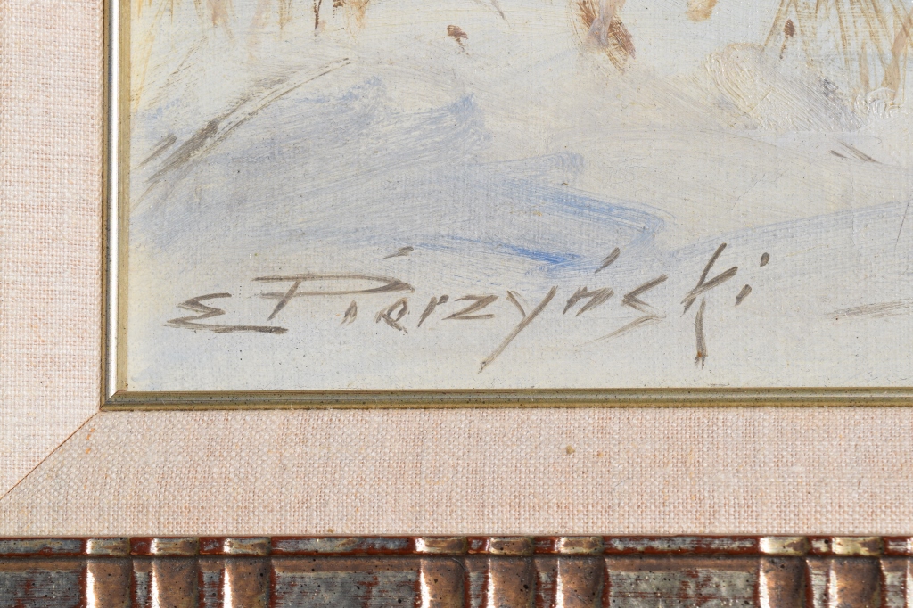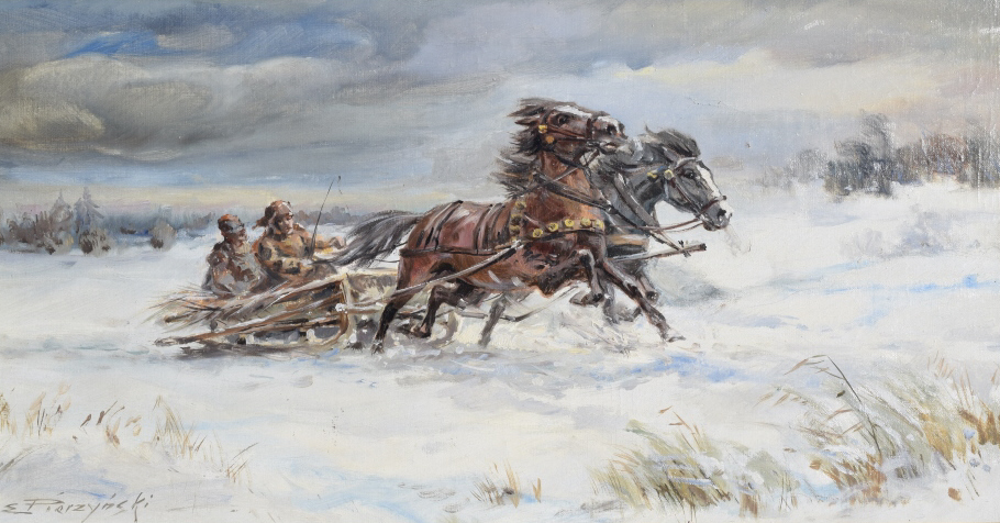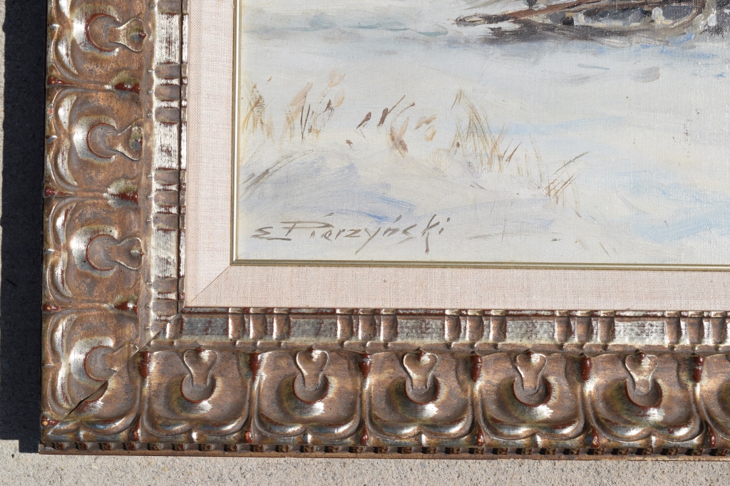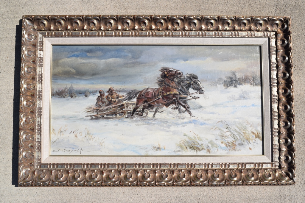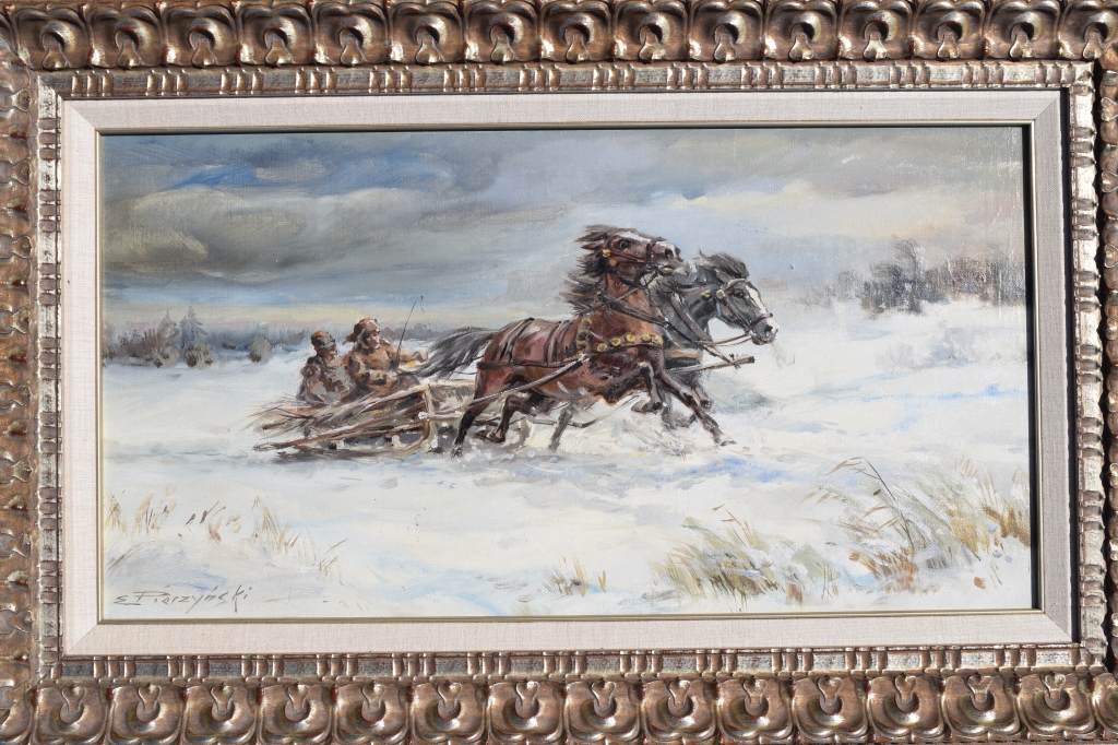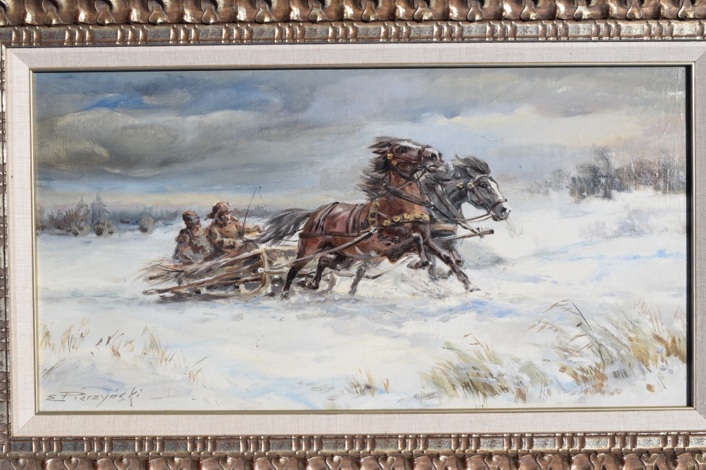 Depicting horses running with sled and riders. Signed "E. Pierzynski" to lower left. Viewable area measures 15 1/4" (38.7cm) high x 29 1/4" (74.3cm). Frame measures 24" (60.1cm) high x 38" (96.5cm) wide. THIRDPARTY SHIPPING REQUIRED