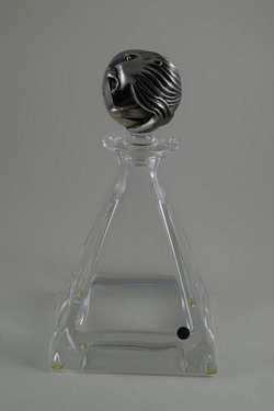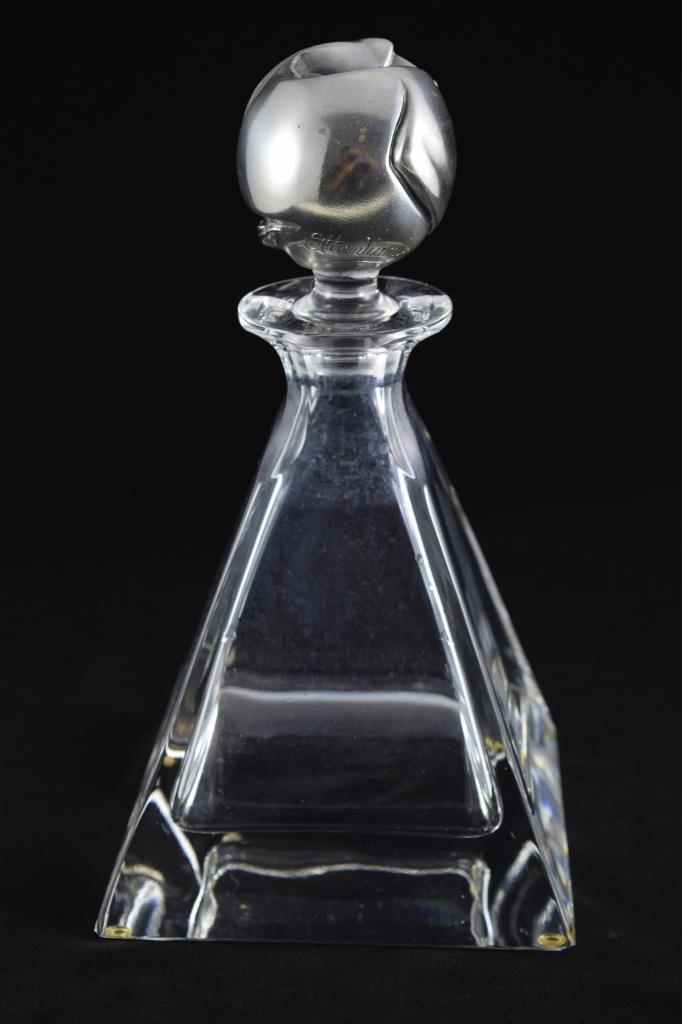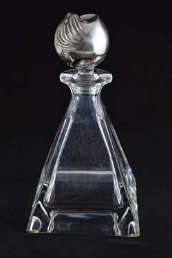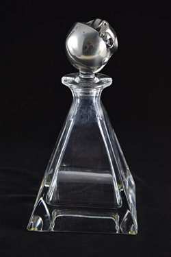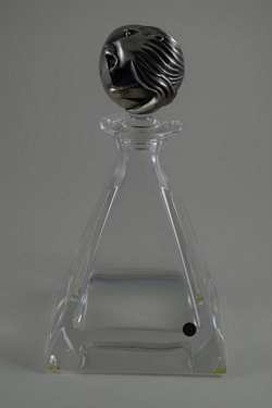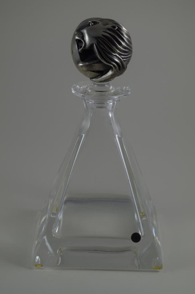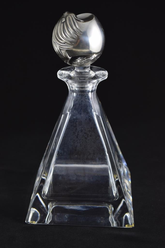 A lovely Macerata, Italy decanter from Ottaviani Studios. Features a pyramid shaped decanter with a .800 silver lion head stopper. Stopper signed "Ottaviani" and hallmarked "10รท13o", "R in a square]",[Star] A MC, and "800 [in an oval]". Decanter has foundry button "Ottaviani Studo". Measures 9 3/4" (24.8cm) high x 5 1/4" (13.3cm) wide x 5 1/4" (13.3cm) deep. Weighs 5lbs., 4oz. THIRD PARTY SHIPPINGREQUIRED