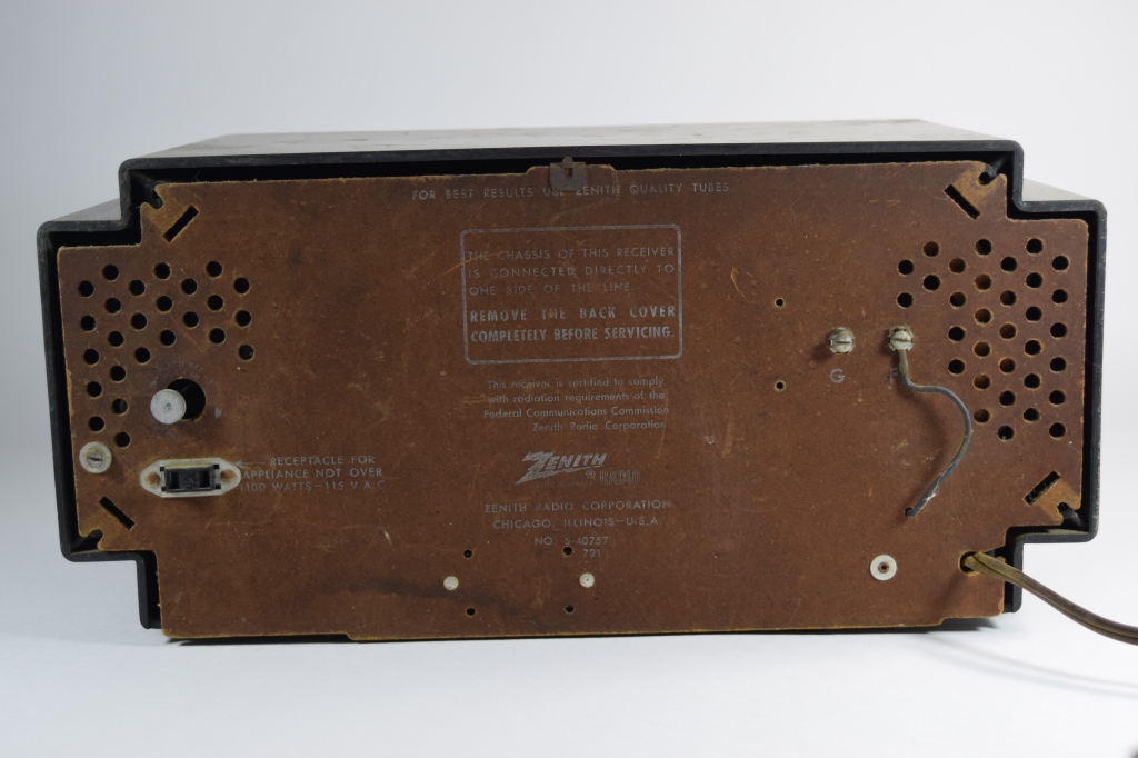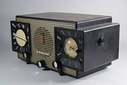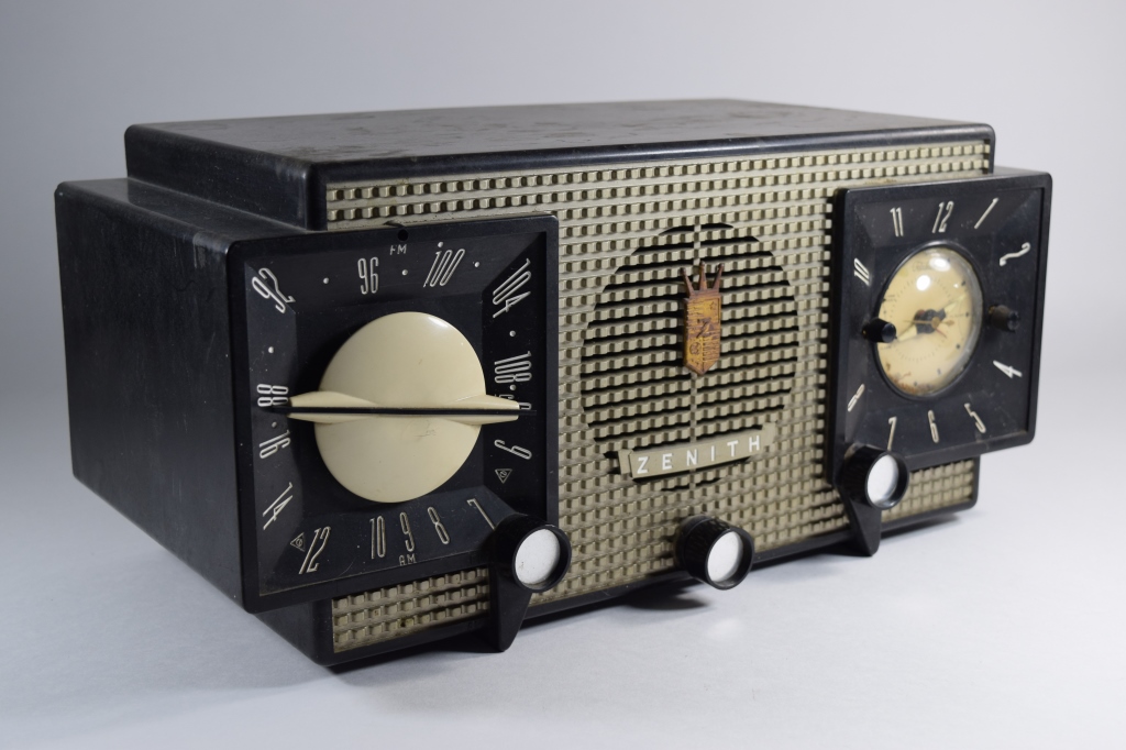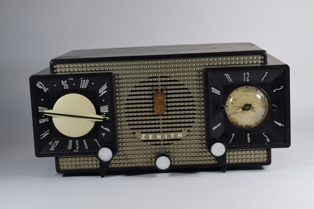 Art Deco Zenith AM-FM Tube Radio w Alarm Clock S-40757 Here is a great art deco tube AM-FM radio with alarm clock by Zenith. One panel on the front holds the AM-FM tuner; the other has a Telechron alarm clock with asleep timer, and the optionto set the alarm to radio or buzzer. The clock has a domed glass cover. You set the alarm on the back. The clock works when we tested it but the radio did not (needs new tubes?). measures 15 1/2" (39.4cm) long x 7 1/2" (19cm) wide x 7 1/2" (19cm) high. Weighs 10lbs., 3oz. THIRD PARTY SHIPPING REQUIRED