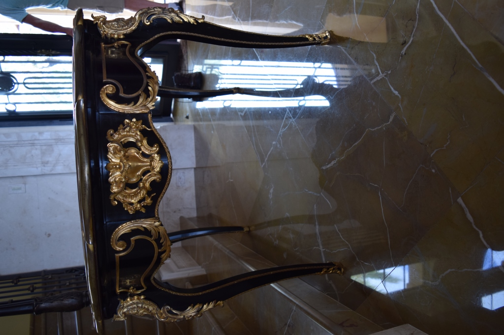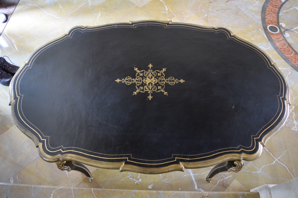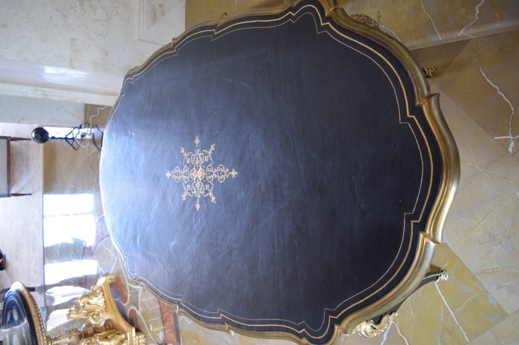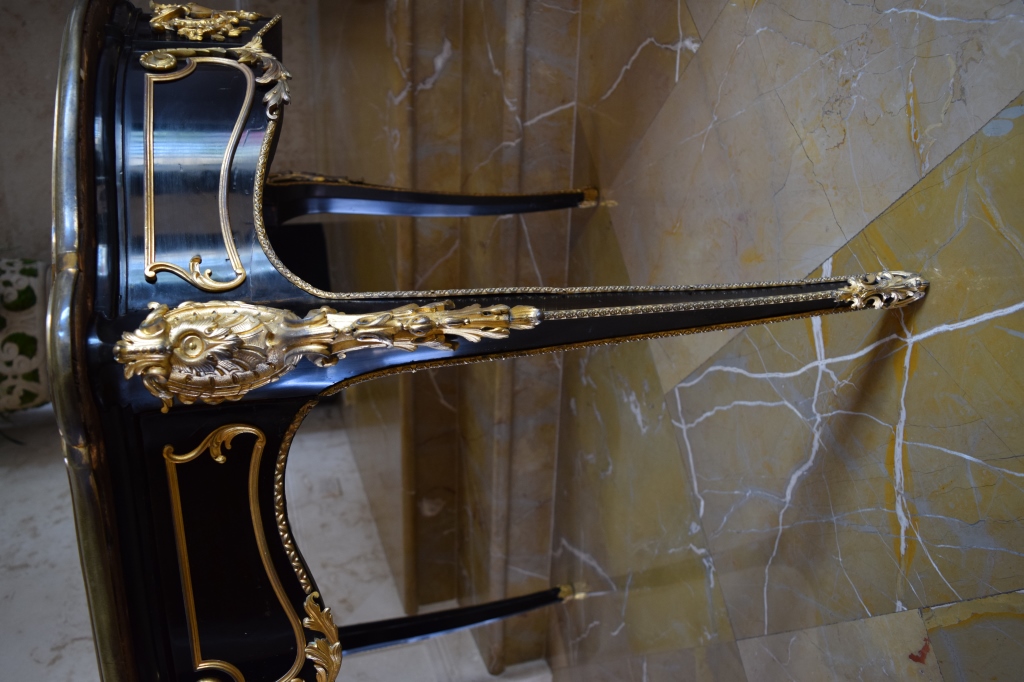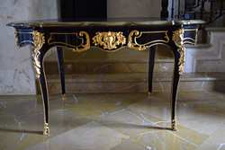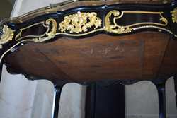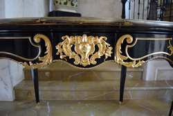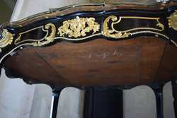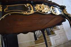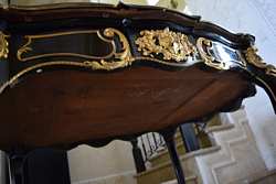 "French 19th Century Napoleon III period, Louis XV style Ebony & ormolu mounted, 1-drawer center table. The arbalest black leather top w/ ormolu moulded border. Mount of a crest amidst floral designs on eachside. Cabriole legs w/ ormolu sabots & chutes. Measures 30 high x 60"" long x 38"" deep."" -Source: Cedric Dupont Antiques Palm Beach, where it was purchased. THIRD PARTY SHIPPING REQUIRED. Please familiarize"yourself with pickup/shipping/freight options PRIOR to placing a bid.