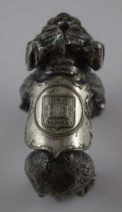 Heavy bulldog sporting a shield on it's back that bears Yale's motto “Lux Et Veritas” in Hebrew and Latin. Measures 3” (7.62cm) long x 2” (5.08cm) high x 1 1/2” (3.81cm) wide. Weighs 12.75 oz. U.S. SHIPPING $15 PLUSINSURANCE