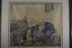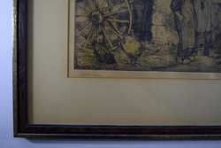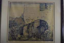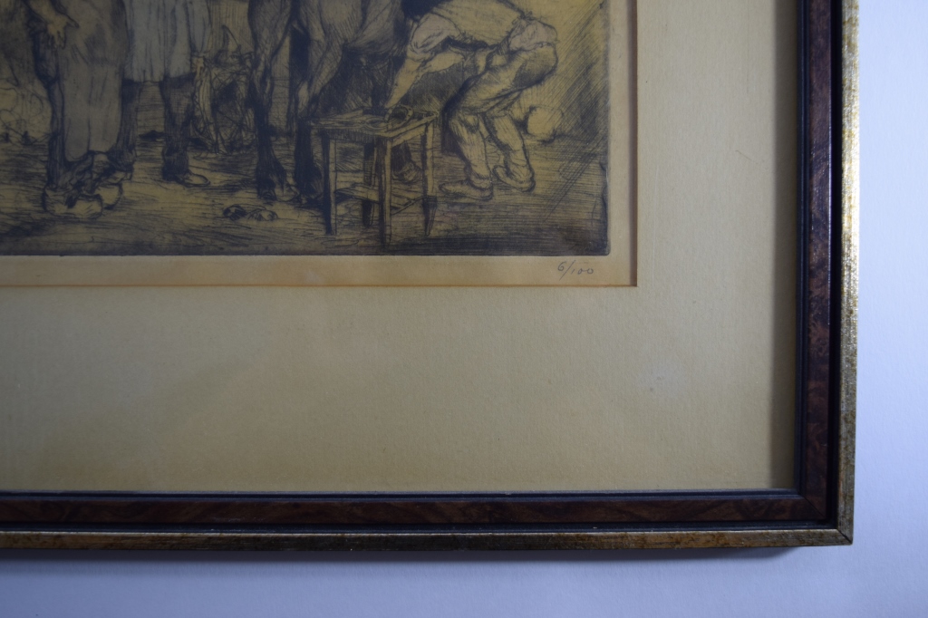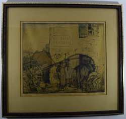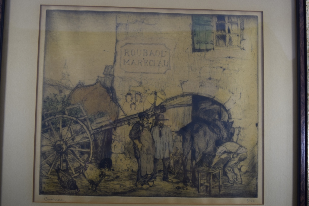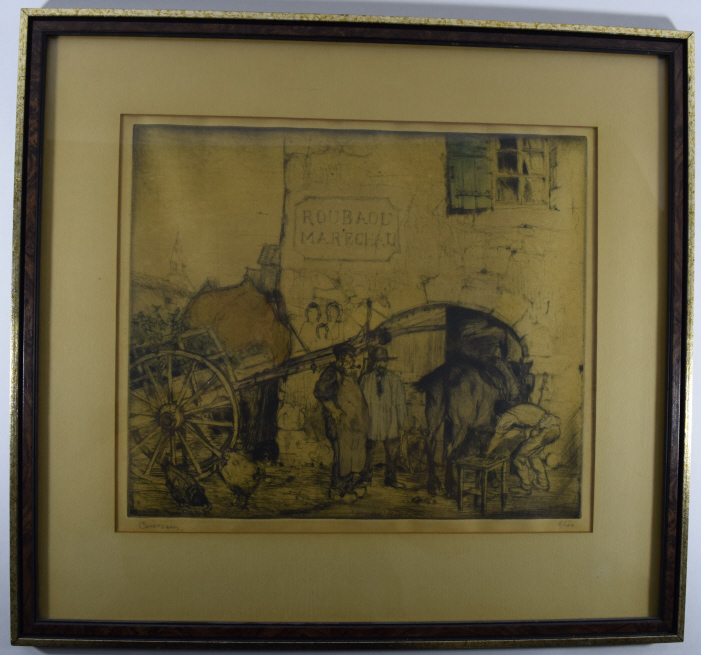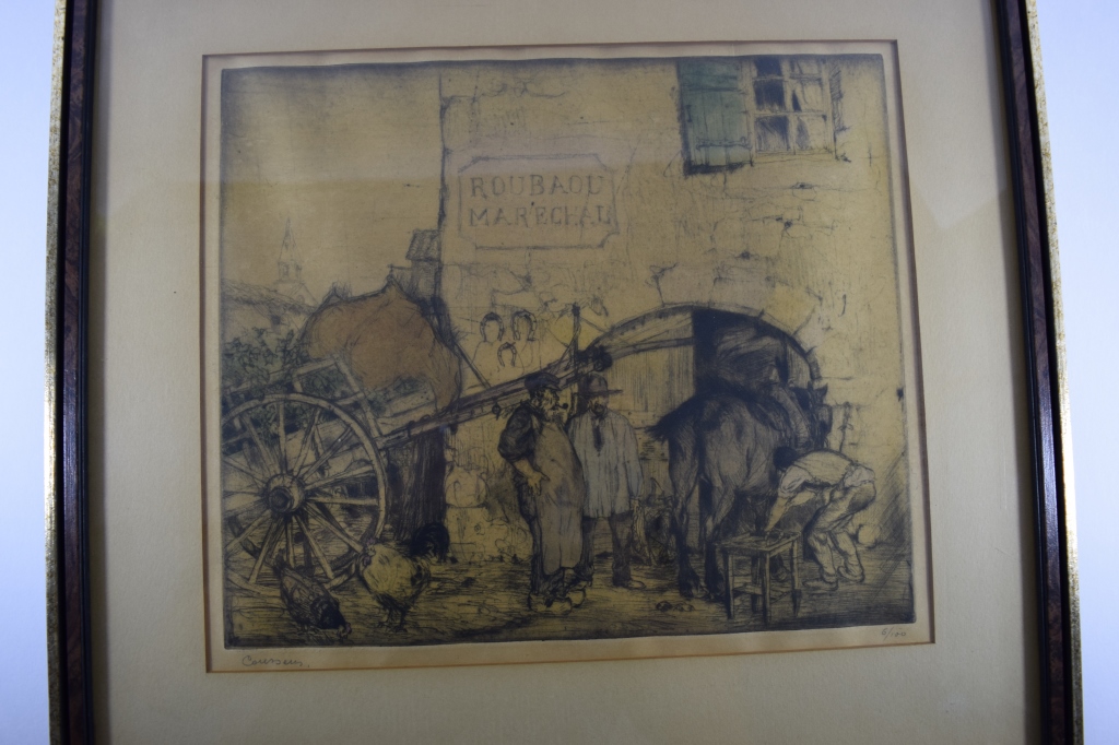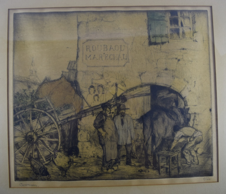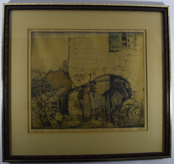 Colored etching by Armand Coussens (1881-1935, French). Depicting horse and farrier scene at Roubaou Marechal. Circa 1910. Color etching on wove paper, signed "Coussens" and numbered "6/100" in pencil.The plate mark size is 11.75" (29.8cm) high x 13.75" (34.9cm) high. Frame measures 19" (48.3cm) high x 20 1/4" (51.4cm) wide. Weighs 4lbs., 4oz. THIRD PARTY SHIPPING REQUIRED