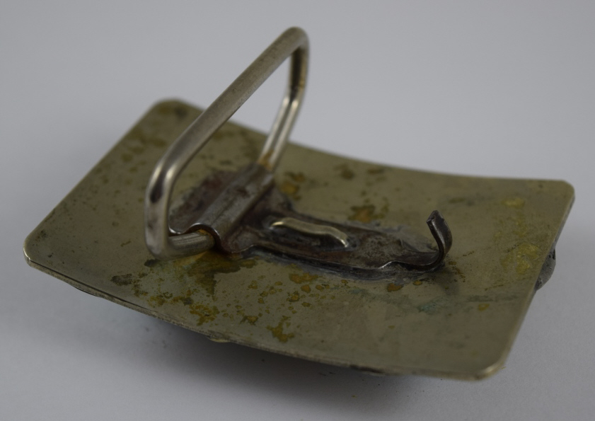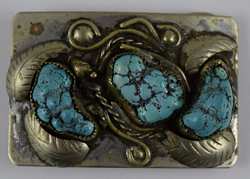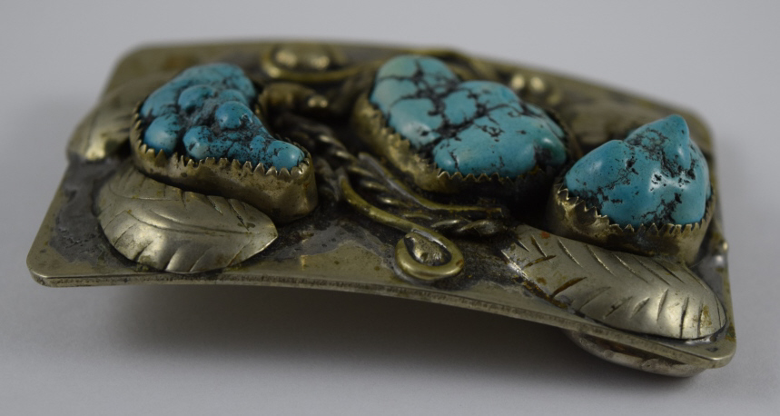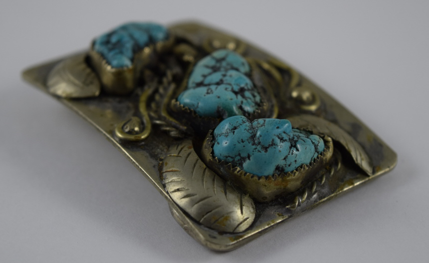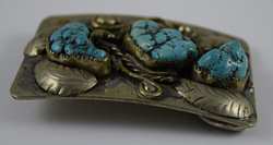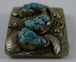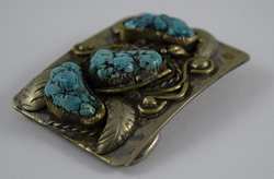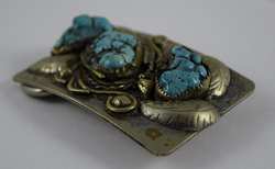 Features 3 large pieces of turquoise surrounded by figural leafs and vine. Measures 3” (7.62cm) long x 2” (5.08cm) wide. Belt loop suitable for belt up to 1 3/4” (4.4cm) wide. Weight 107.6g. U.S. SHIPPING$15 PLUS INSURANCE