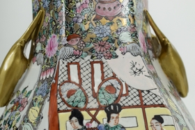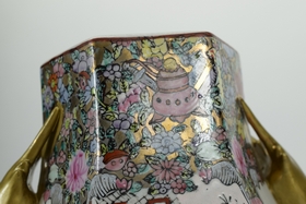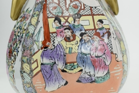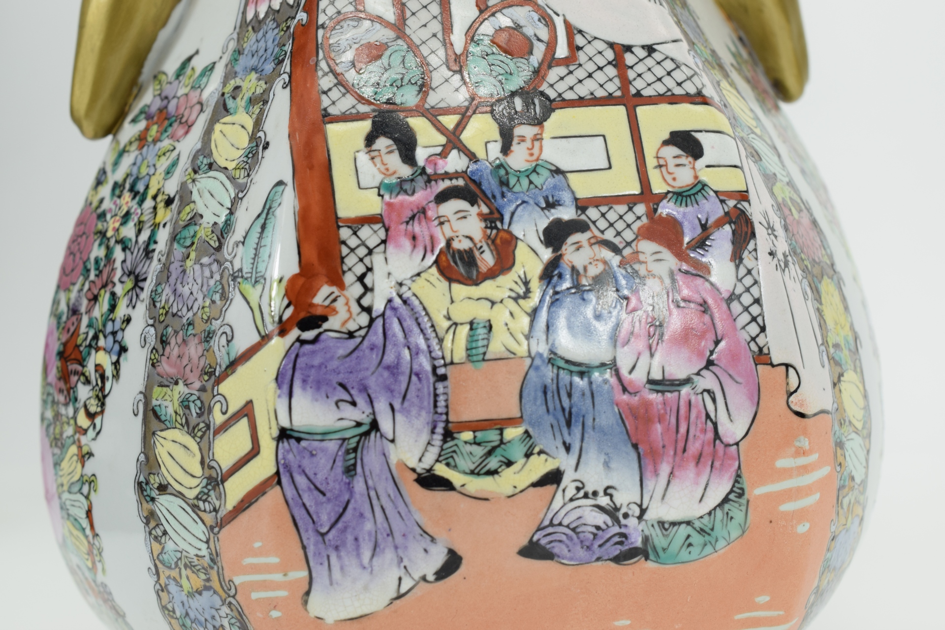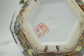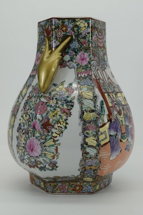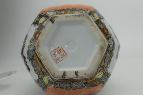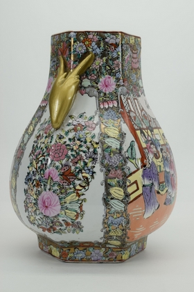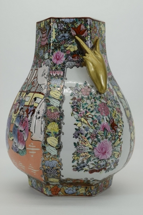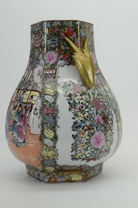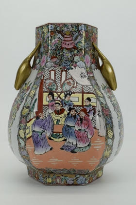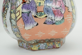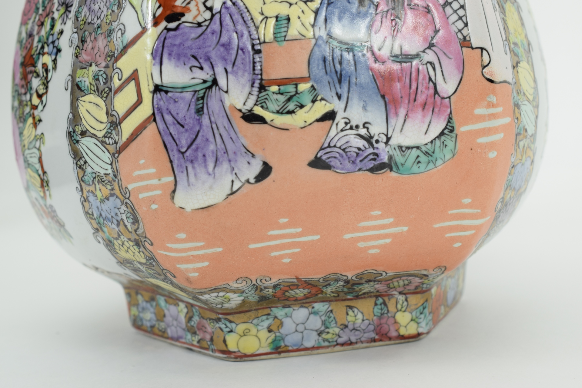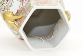 Chinese porcelain scenic hexagonal hand painted vase with handles that appear to be a Ram head. Chinese calligraphy on bottom of base. Measures approx. 12” H x 10” diameter. Weighs approx. 6lbs.