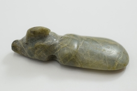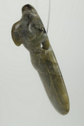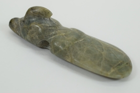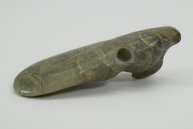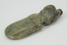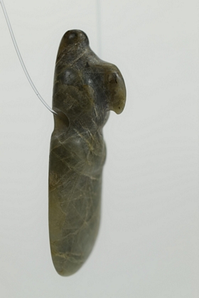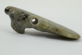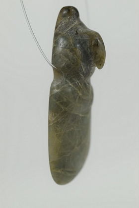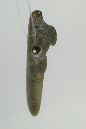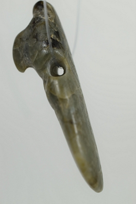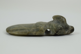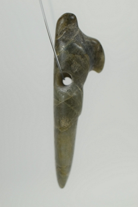 Holes drilled for suspension. Signs of erosion. Nicoya, Costa Rica 500-800 A.D. Measures approximately 2-1/8 L x 7/8 W x 5/8 D. Weighs 16.5g.