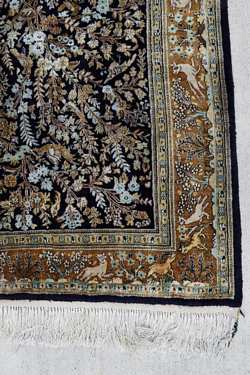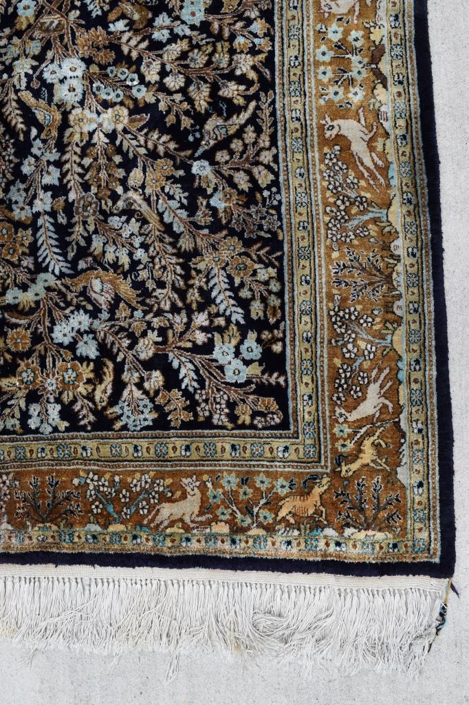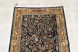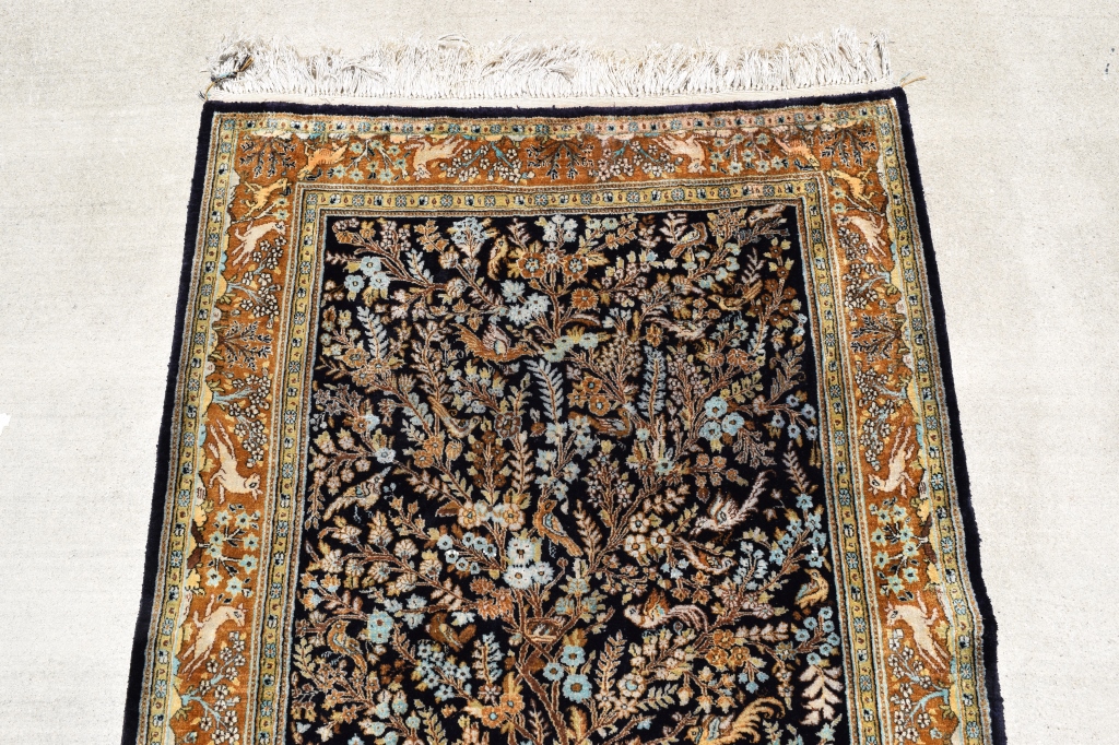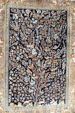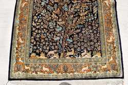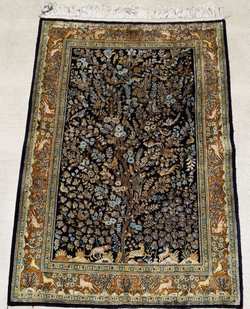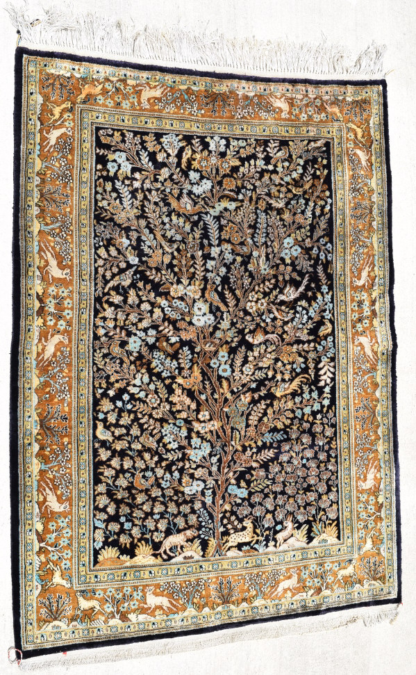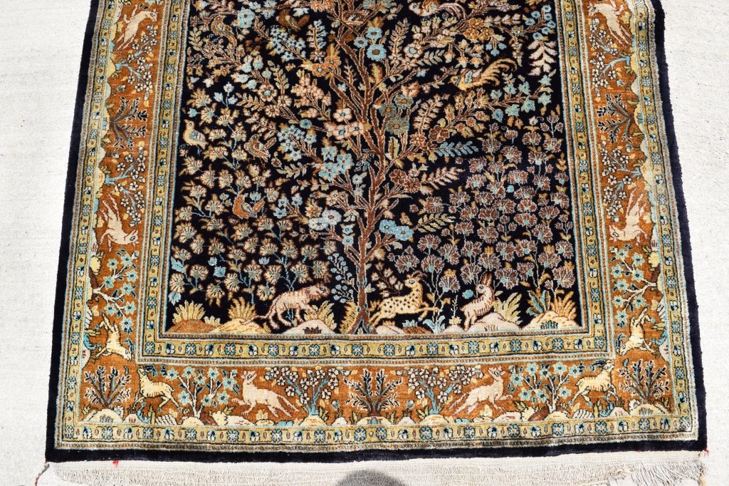 Fine antique Persian Qom (Qum) 100% silk "Tree of Life" rug. Magnificent quality hand knotted silk Persian rug. Depicting "Tree of Life" with countless animals, flowers, and landscape scenes. A true delight for thediscerning rug collector. Measures 4' (1.24m) long x 3.5' (1.06m) wide. Weighs 8 lbs. THIRD PARTY SHIPPING REQUIRED