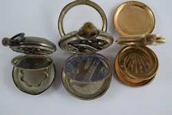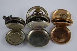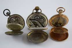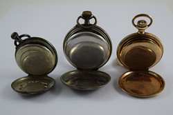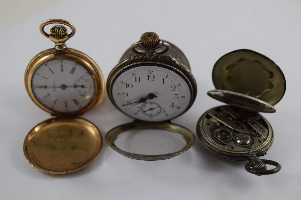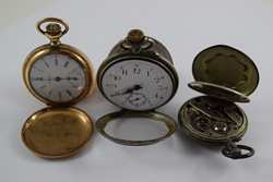 One Waltham gold tone pocket watch, measures 1 15/16” (4.92cm) in diameter. One Louis Jacot sterling silver clover pocket watch, measures 1 7/8” (4.76cm) in diameter. One unidentified pocket watch, measures 2 5/8”(6.66cm) in diameter. Total weight 115.7g (4.1oz). U.S. SHIPPING $15 PLUS INSURANCE