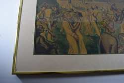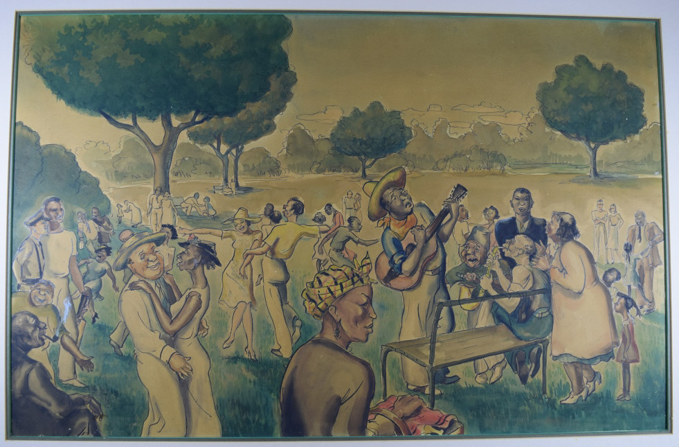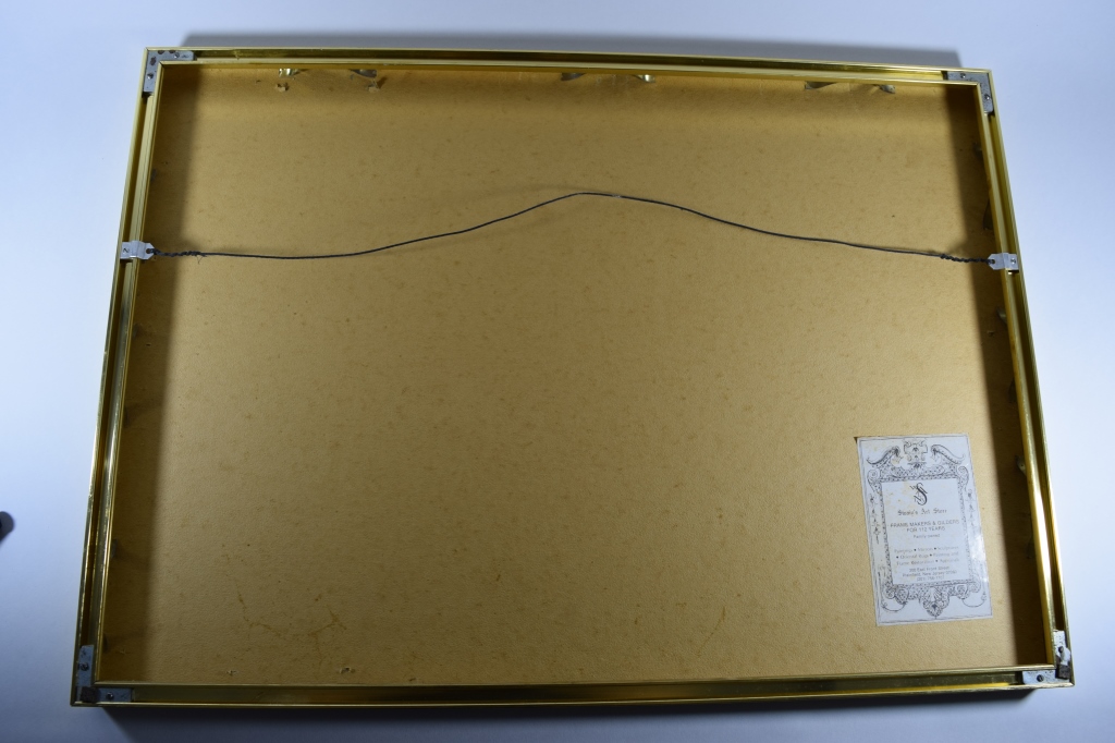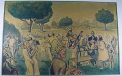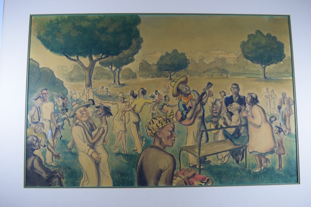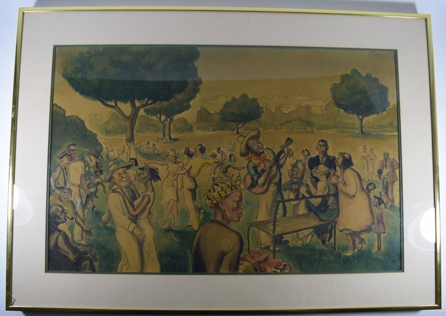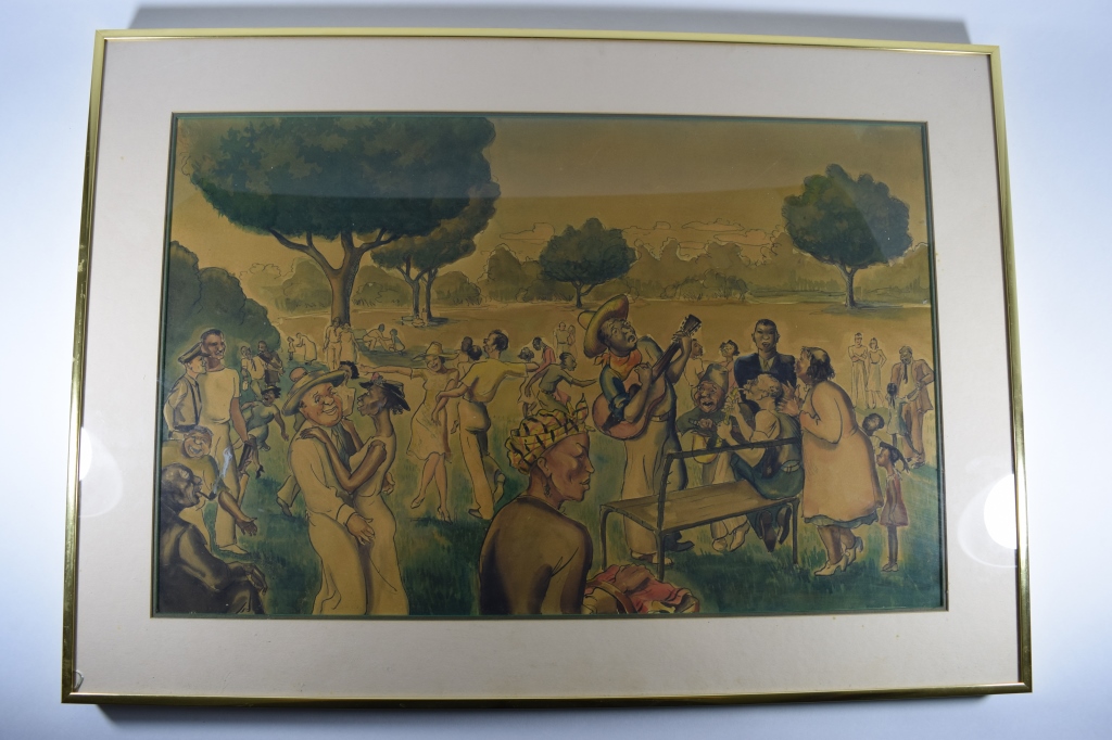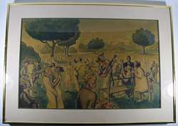 Depicting a park scene family reunion or party. No visible signature, has embossing stamp to top left of work. Work itself measures 15" (38.1cm) high x 23" (58.4cm) wide. Frame measures 19 1/2" (49cm) high x 27 1/2" (69.8cm) wide. Weighs 7lbs., 5oz. THIRD PARTY SHIPPING REQUIRED