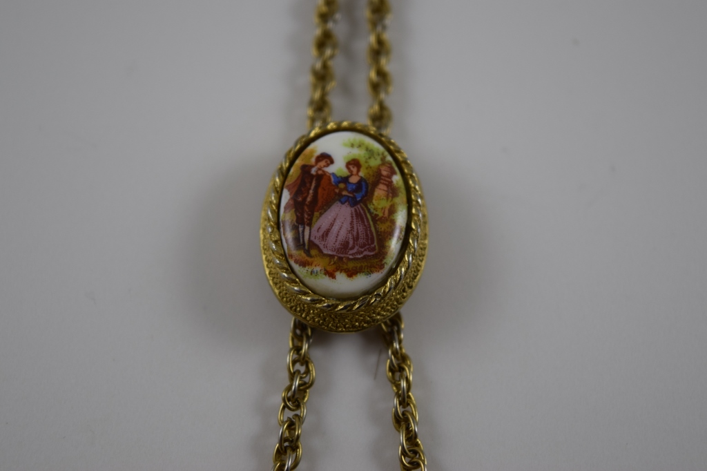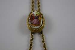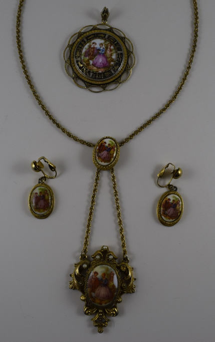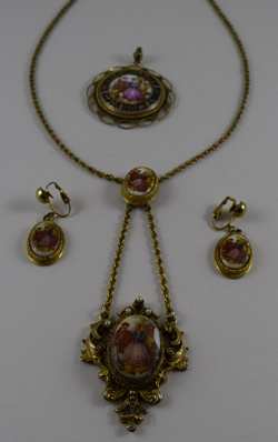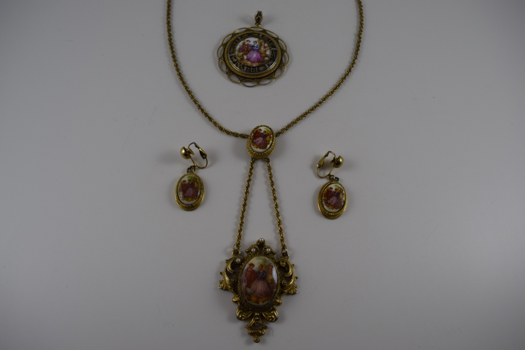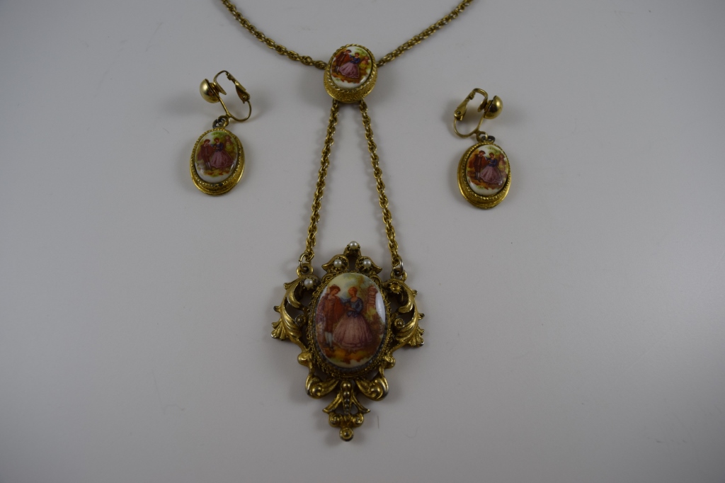 Gold necklace with clip and attached ornate pendant, all with hand-painted style scenes. Matching clip-on earrings and matching pendant. Necklace 25” long (63.5cm) [wearable portion/above the clip 20” (50.8cm)],attached pendant 2” (5.08cm) long x 1 1/2” (2.81cm) wide. Earrings 1 1/2” (3.81cm) long overall, 1” (2.54cm) long without post. Pendant 2” (5.08cm) x 2” (5.08cm). U.S. SHIPPING $15 PLUS INSURANCE