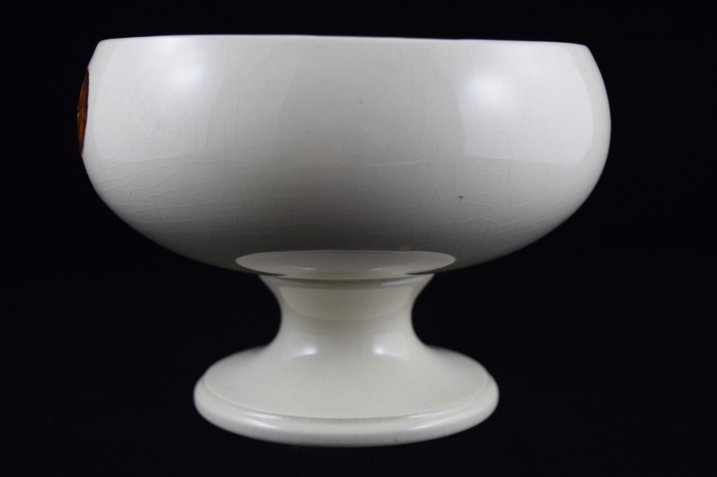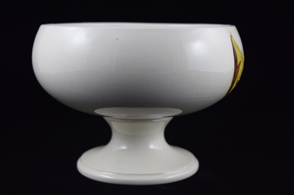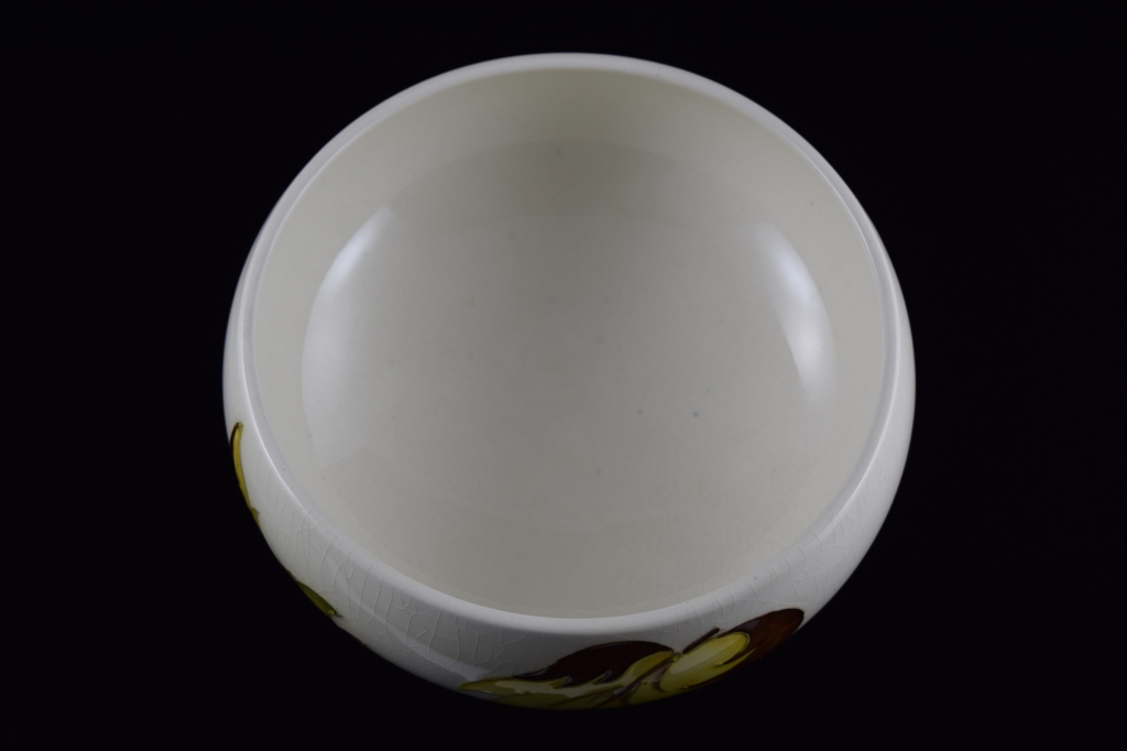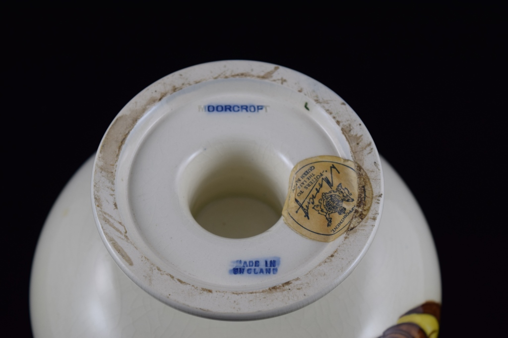 Potters to late queen Mary. Marked "Made in England", Moorcroft to bottom with original Moorcroft sticker. Measures 6 1/2" (16.5cm) wide x 4 1/2" (11.4cm) high. Weighs 1lbs., 14oz.