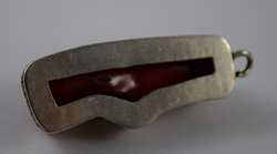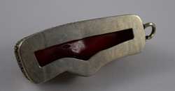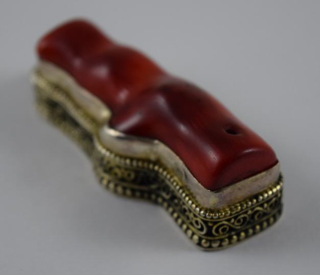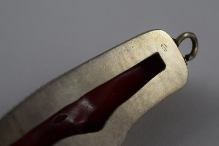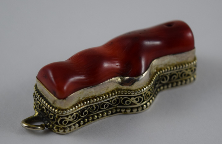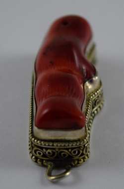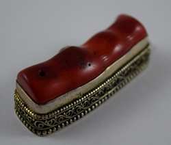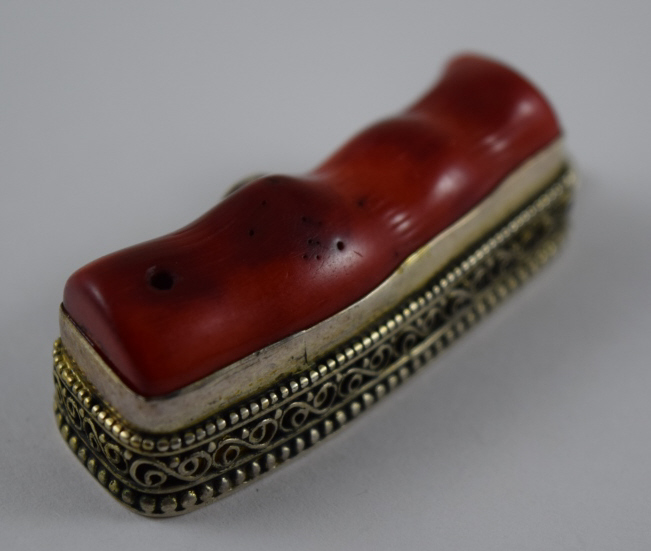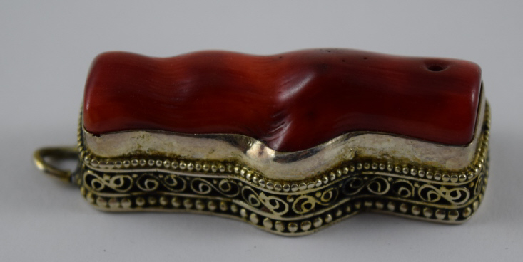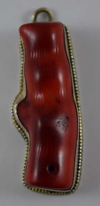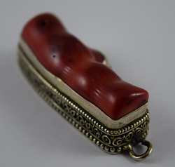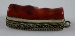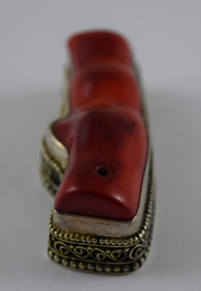 Nicely-crafted with scrollwork and continuous dot pattern, adorned by branch of red coral. Hallmarked "925 [in a circle]". Measures 2" (5.08cm) high x 3/4" (1.9cm) wide. Weighs 29g. U.S. SHIPPING $15 PLUS INSURANCE