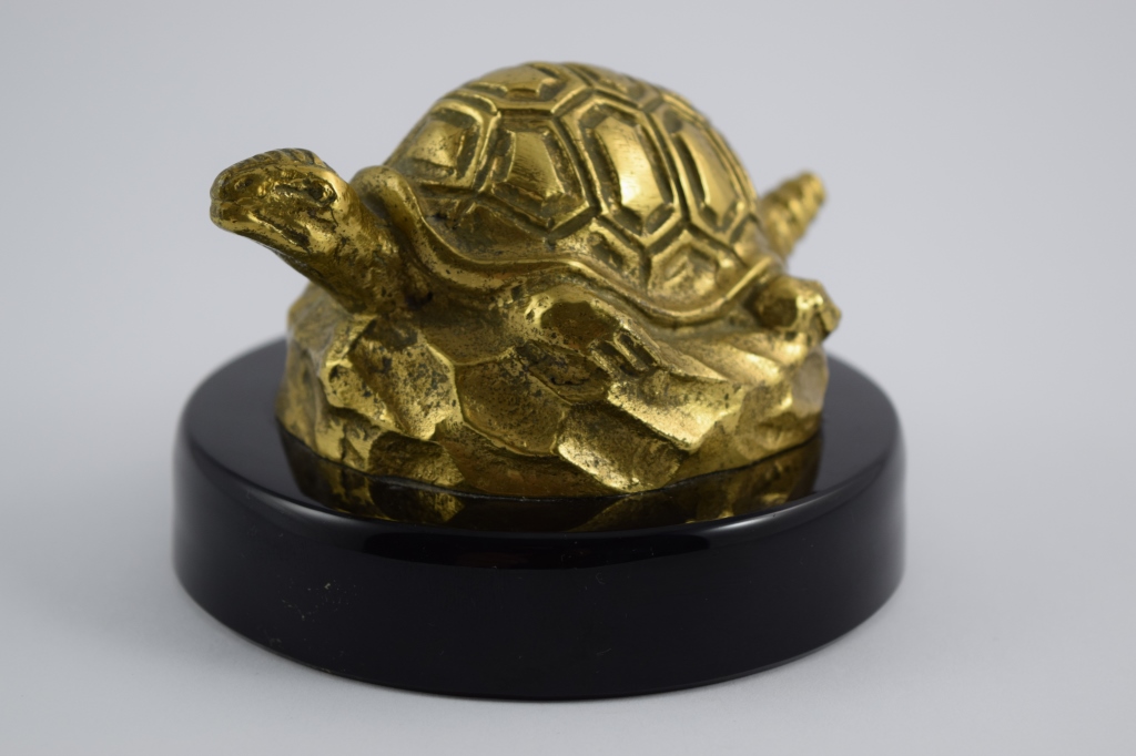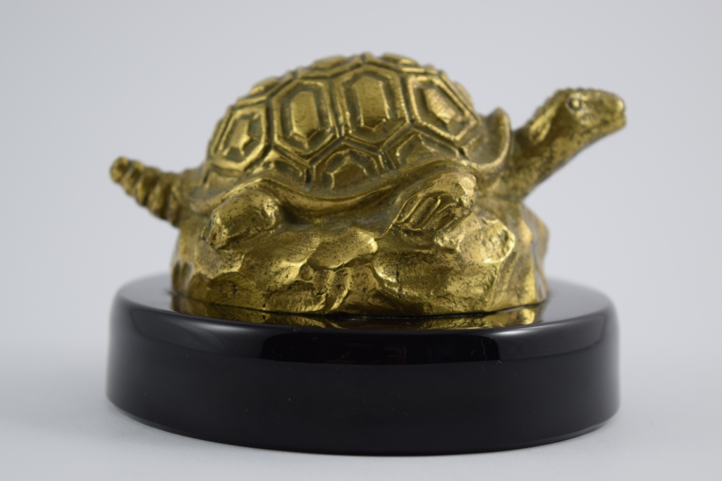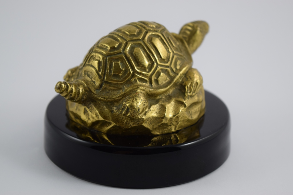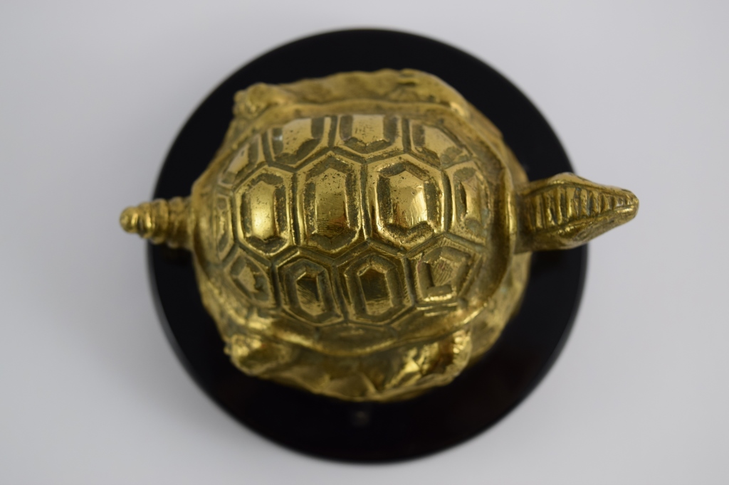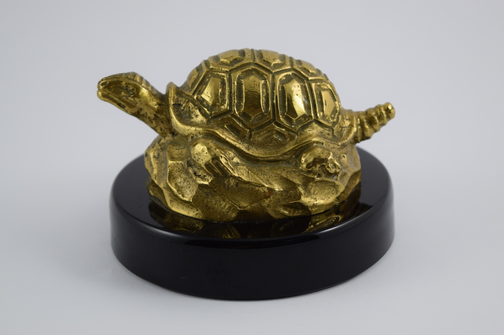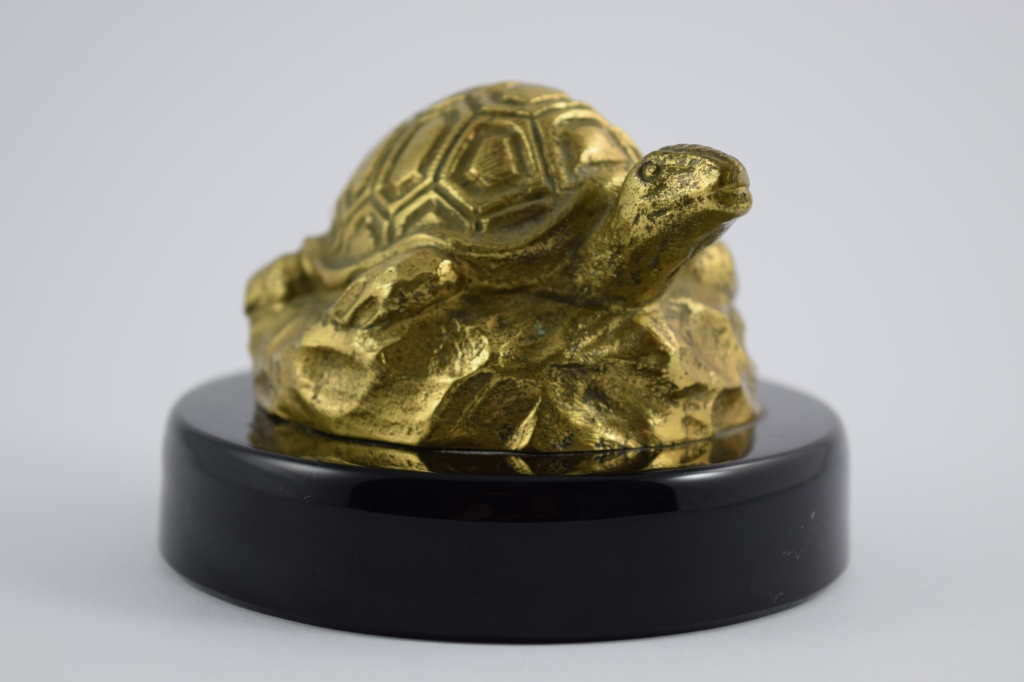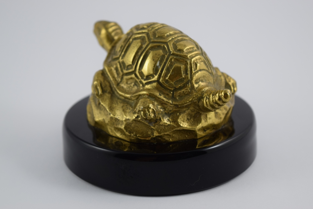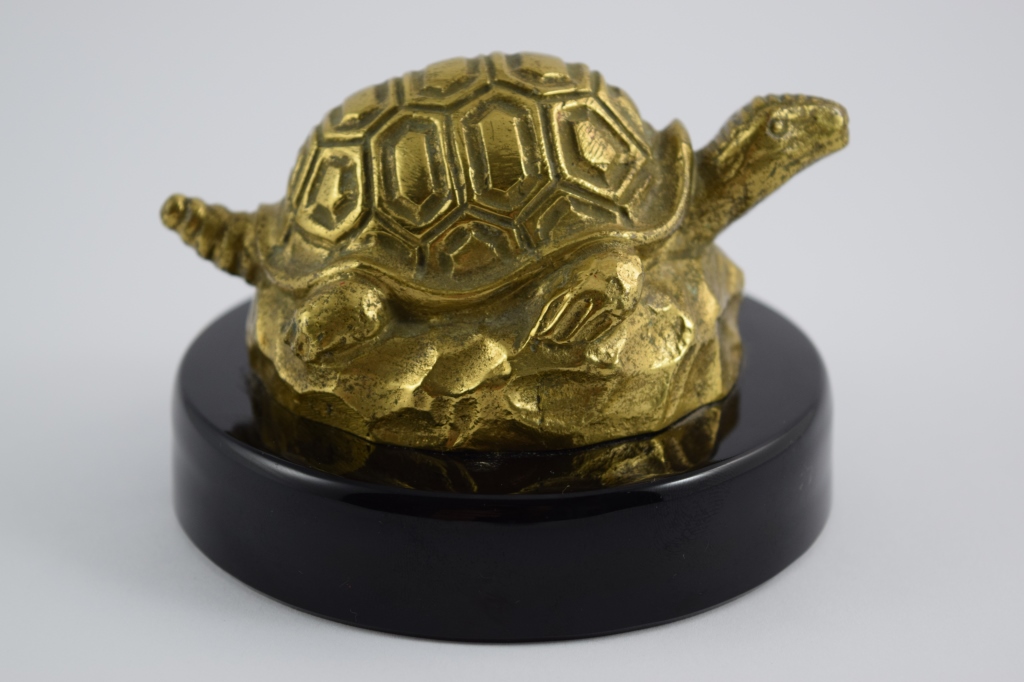Beautiful bronze turtle on a black marble base. Turtle itself measures 4" (10.2cm) long x 2 3/4" (6.9cm) wide x 2" (5.1cm) high. Base measures 4" (10.2cm) in circumference x 3/4" (1.9cm) high. Weighs 1lbs, 10oz. U.S.SHIPPING $20 PLUS INSURANCE