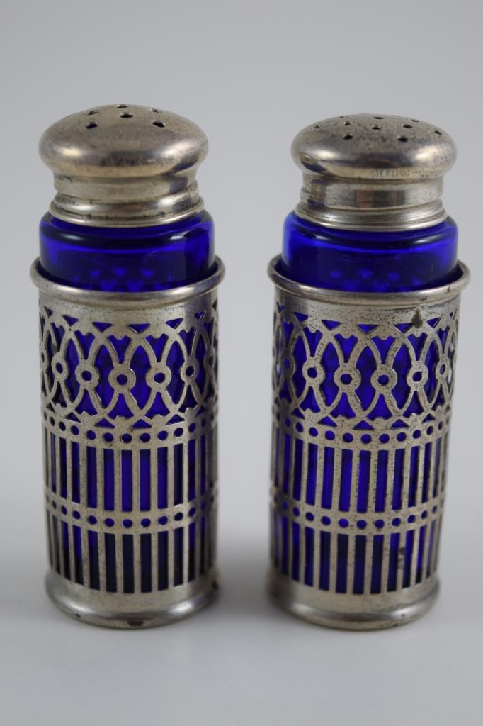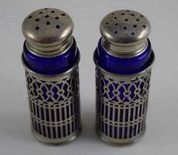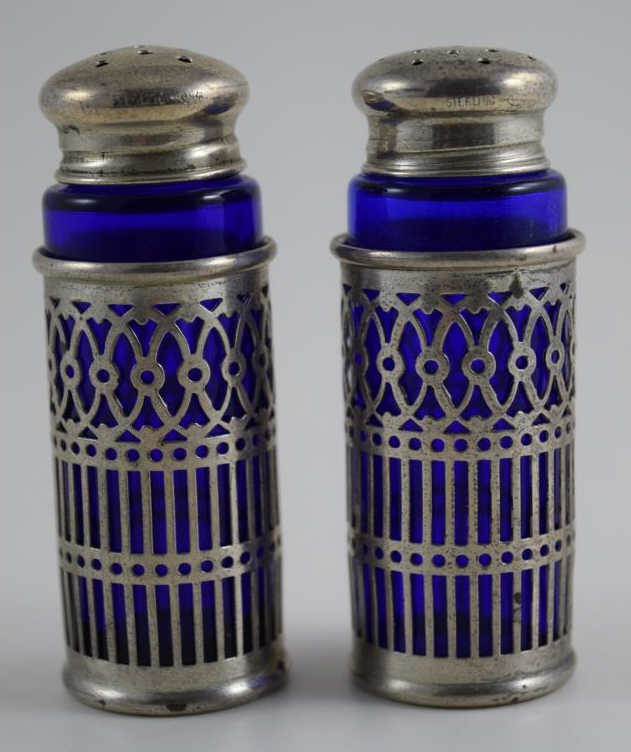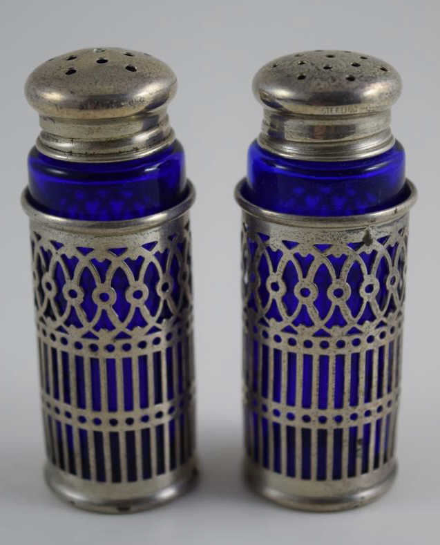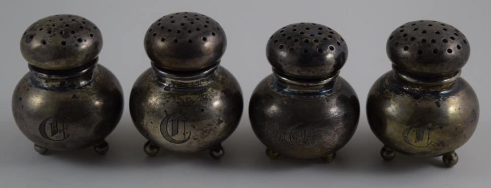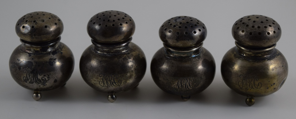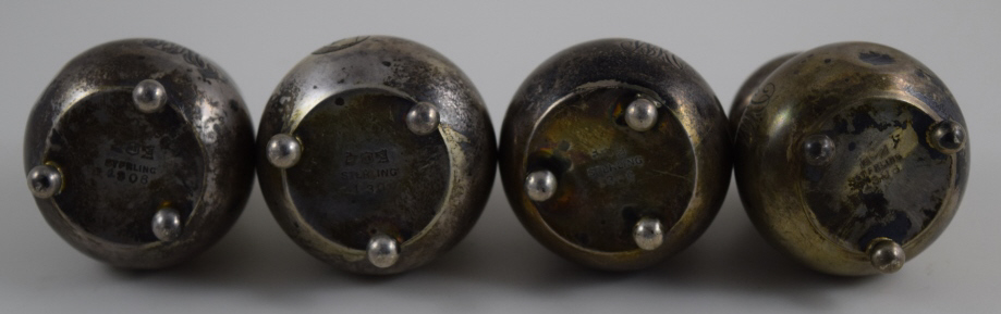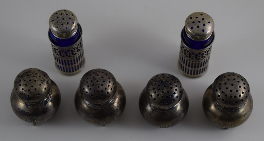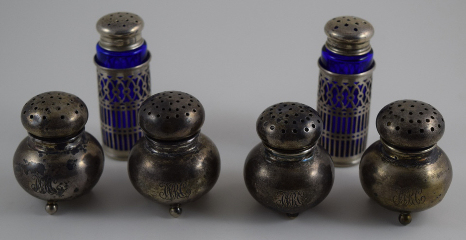 Four matching with "C" and "WRC" monograms. Hallmarked "[Ship w/ sail]", "HS [in shield]', "[Dog or wolf face]", "Sterling", and "1306". Each measures 2" (5.08cm) high x 1 1/2" (3.81cm) wide. Two "WebsterCompany"matching colbalt glass in pieced sterling silver sleeves. Hallmarked "WC [with arrow through it]". Each measures 2 3/4" (6.9cm) tall x 1" (2.54cm) wide. Silver weight 105.8g (3.4 ounces troy), total weight with glass 5.8oz. U.S. SHIPPING $20 PLUS INSURANCE