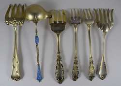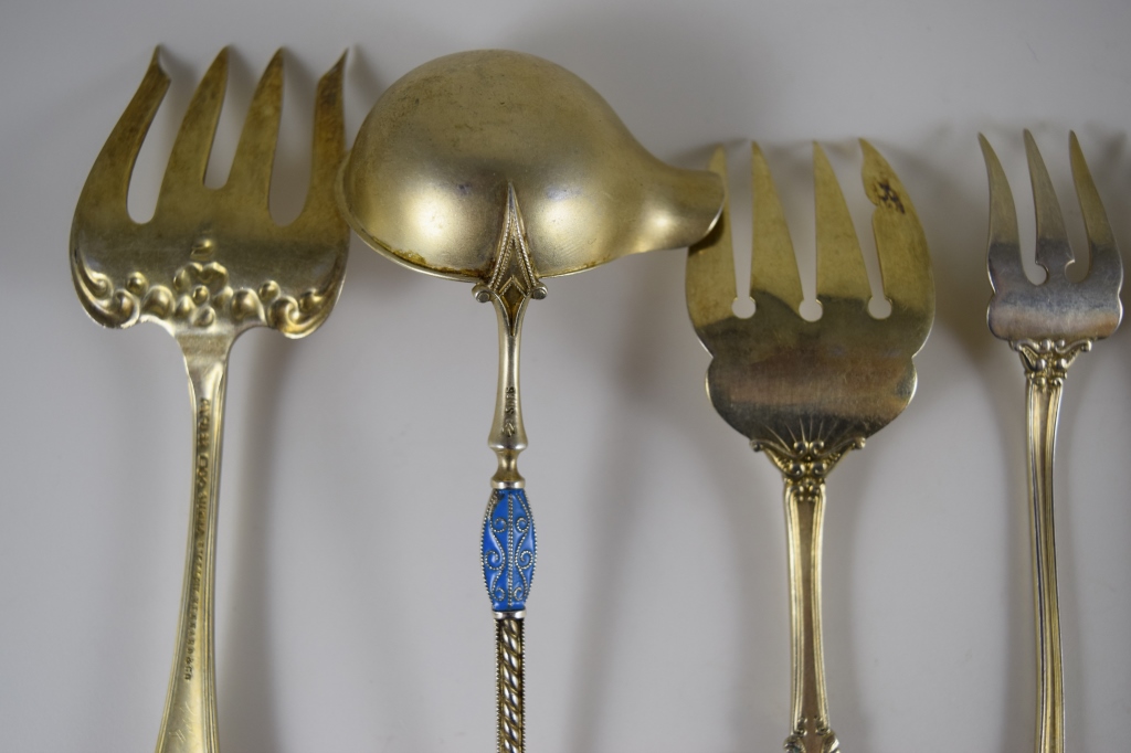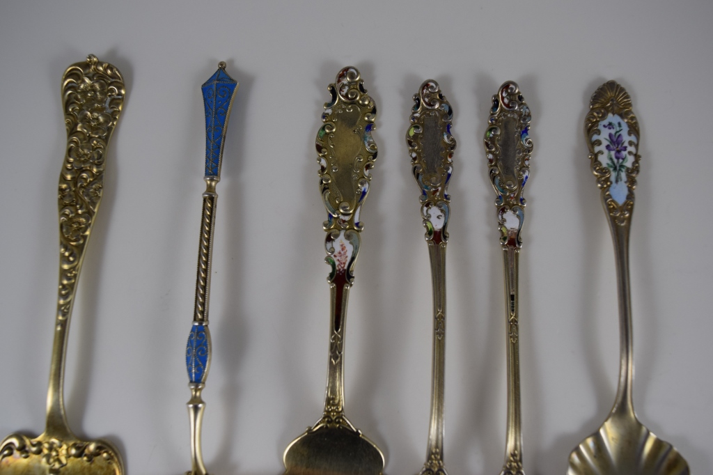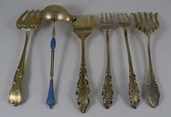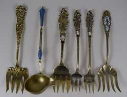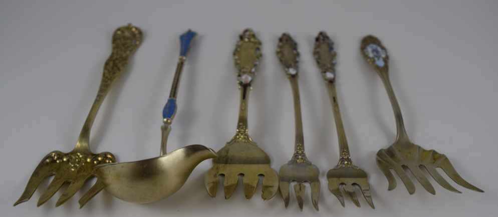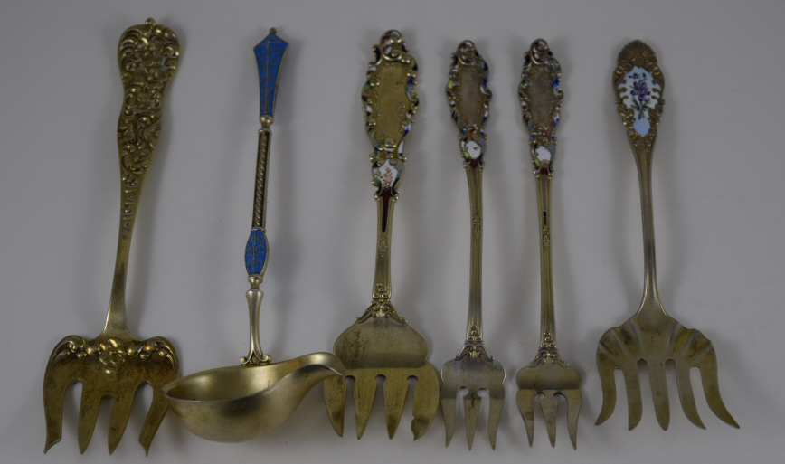 201 - LOT OF 6 STELING SILVER & ENAMEL FORKS & LADLE