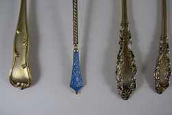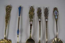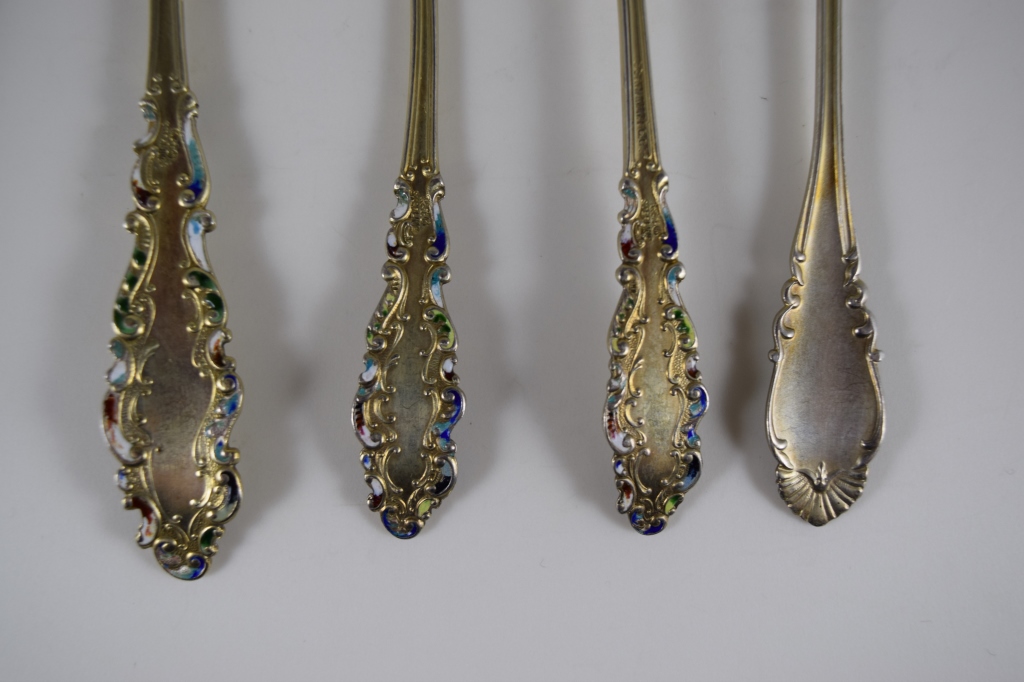 3 Gorham, 1 R. Blackington & Co., 1 Bigelow Kennard & Co., and 1 .830 or .930 enameled demitasse ladle. All measure approximately 5 1/2" (13.9cm) to 6" (15.2cm) long. Total weight 121.7g (2.6 ounces troy). U.S.SHIPPING $15 PLUS INSURANCE