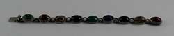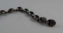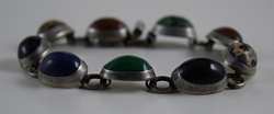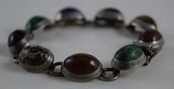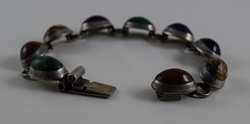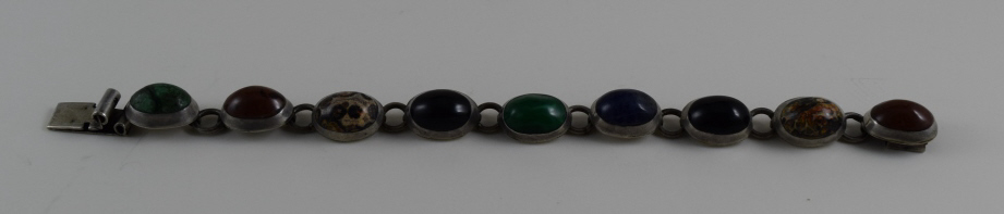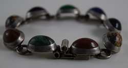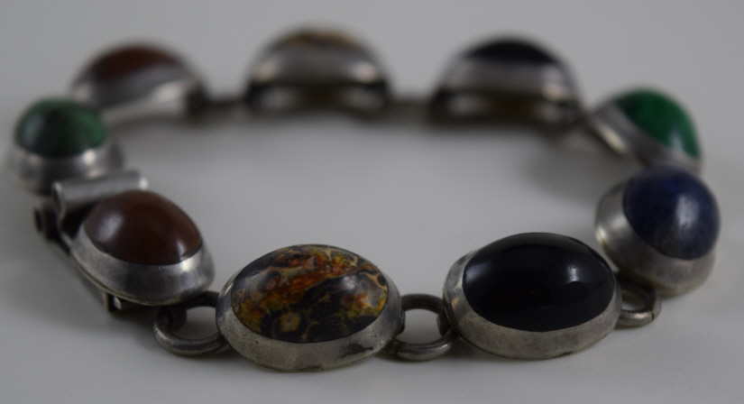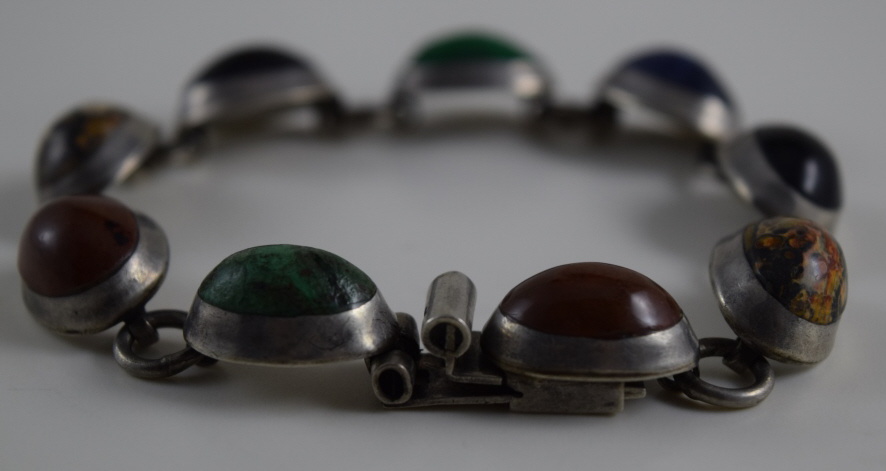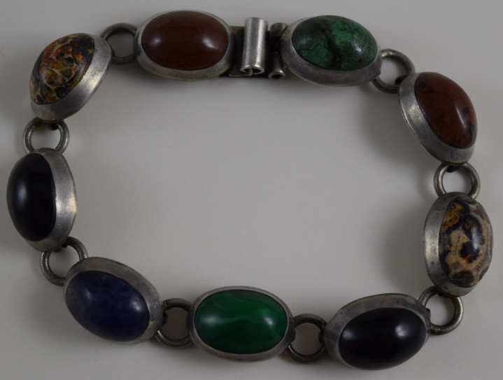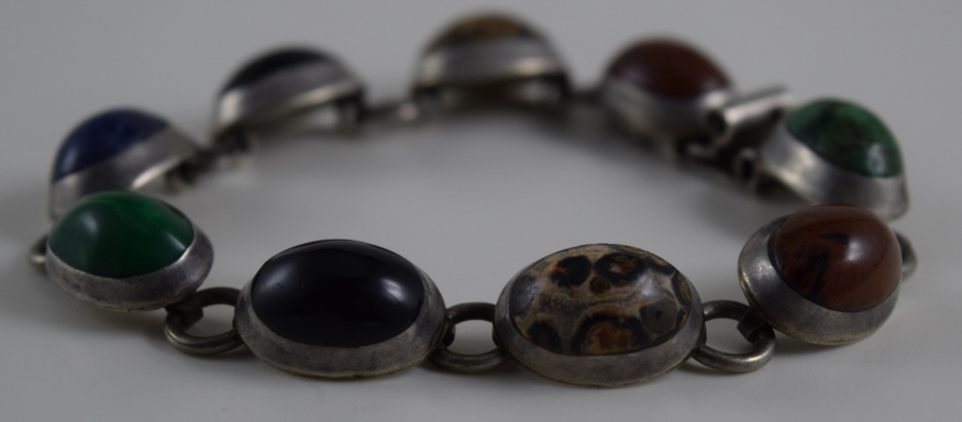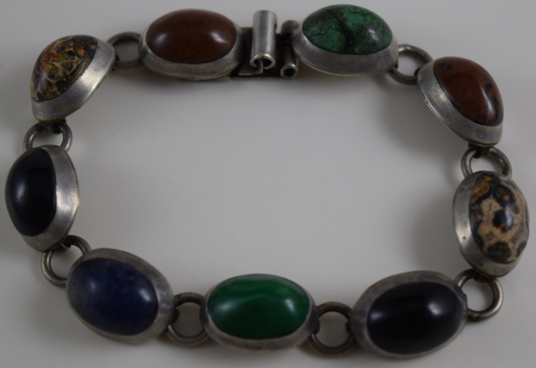 Vintage sterling silver Taxco Mexico semi precious stones bracelet. Holding 9 various stone cabochons; turquoise, leopard skin, obsidian, malachite, lapis and more. Hallmarked "Mexico", "TH-95", and "925".Bracelet measures 7 1/2" (19cm) circumference x 1/2" (1.27cm) wide. Total weight 31.1g. U.S. SHIPPING $15 PLUS INSURANCE