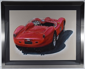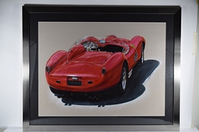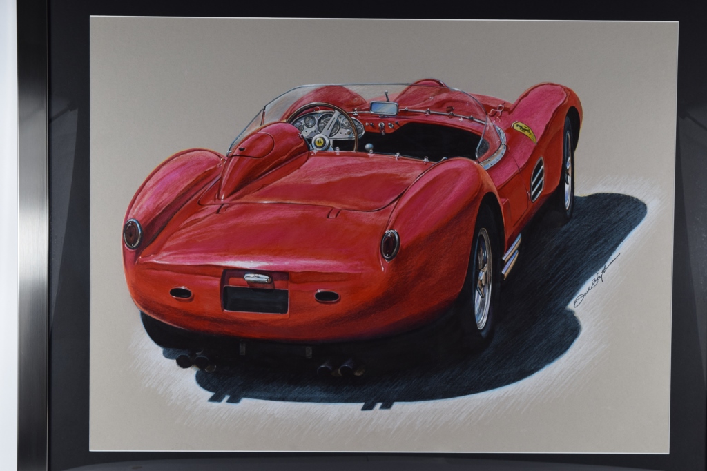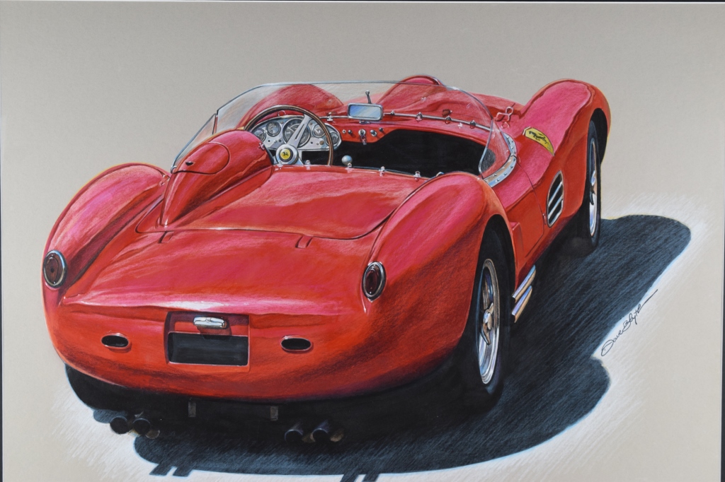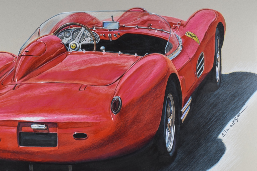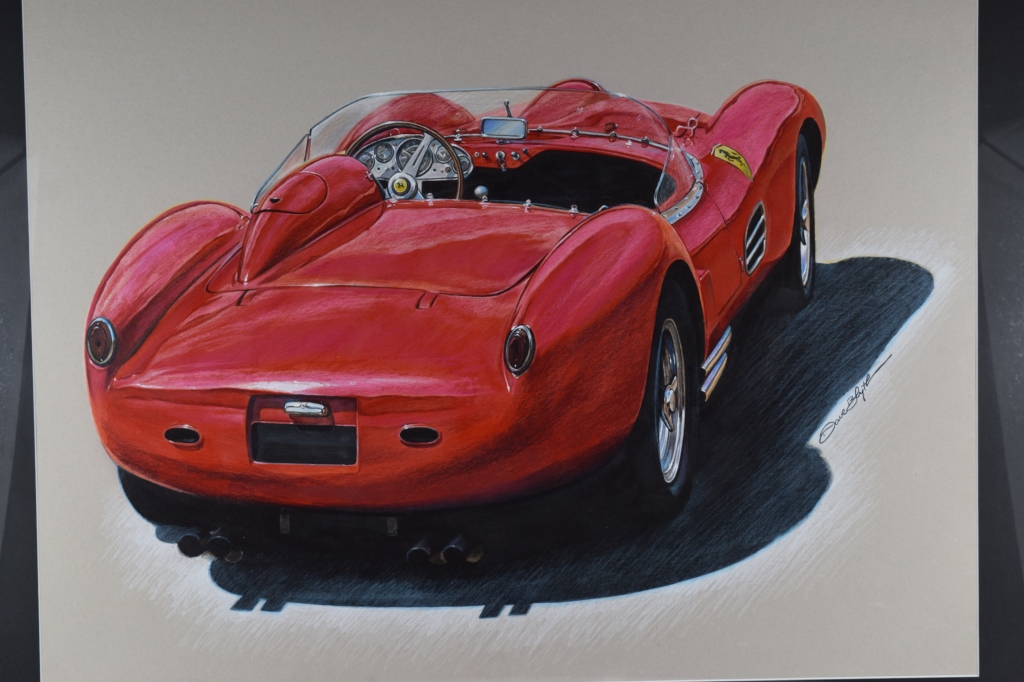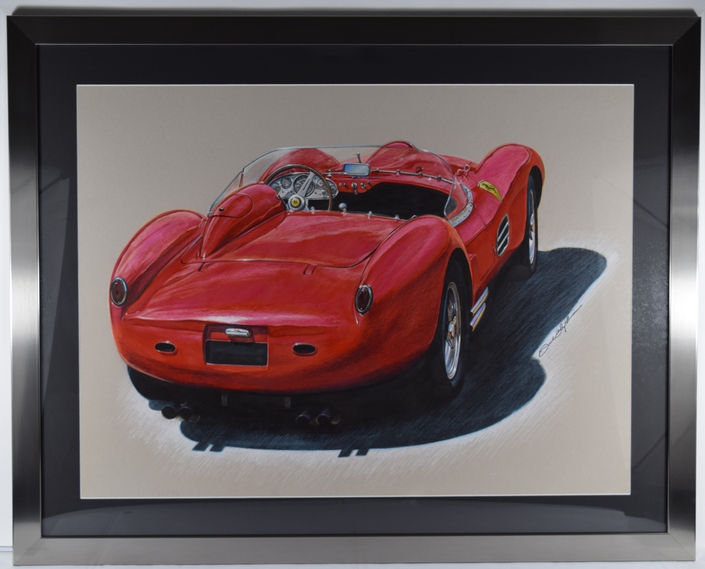 Signed mixed media photo realism depicting an old Ferrari. Dave Blyth became one of the world's best Ferrari artists and was commissioned Burt Reynolds, Miami Vice's Don Johnson, Rock star Chris Rea, and Formula One stars Nigel Mansell and Gerhard Berger. Source: http://www.speakers.co.nz/our-speakers/all-speakers/dave-blyth/ . Work measures 29" H x 39" W. Frame measures 39" H x 49" W.